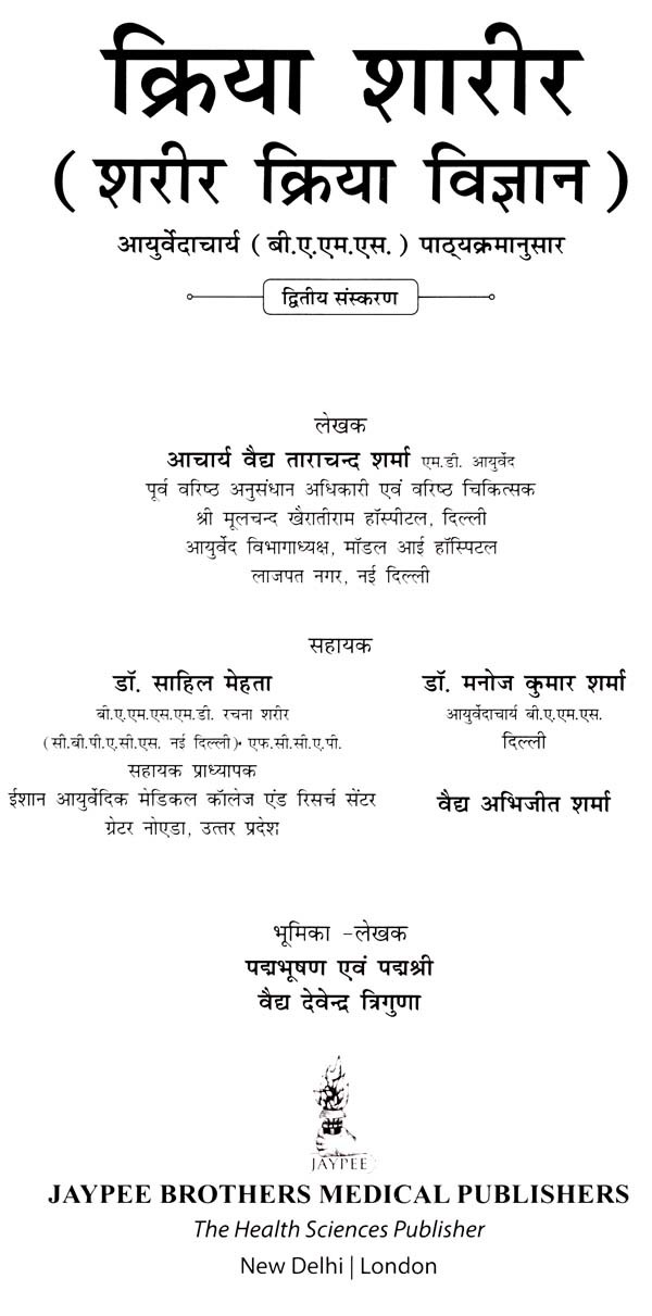 यद्यपि क्रियाशारीर विषय पर अनेकों विद्वानों ने आयुर्वेद एवं आधुनिक विषयों सहित अनेक ग्रन्थ लिखे हैं जिनमें वैद्य रणजीत राय देसाई, डा. प्रियव्रत शर्मा, डा. पूर्णचन्द्र जैन, वैद्य शिव कुमार गौड़ एवं शिवचरण ध्यानी विशेष उल्लेखनीय हैं। वर्तमान में विद्यार्थियों के पाठ्यक्रमानुसार यथावश्यक शरीर क्रिया विषय का सरल भाषा में मुख्य बिन्दुओं सहित वर्णन, जिसे प्रस्तुत पुस्तक में लेखक ने पूरा करने का प्रयास किया है।