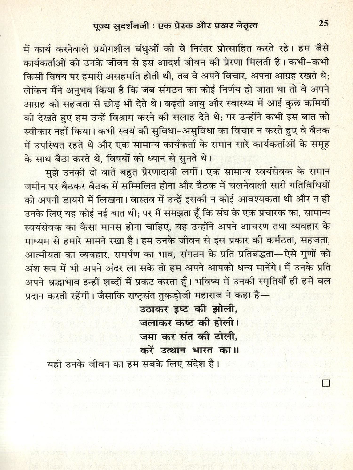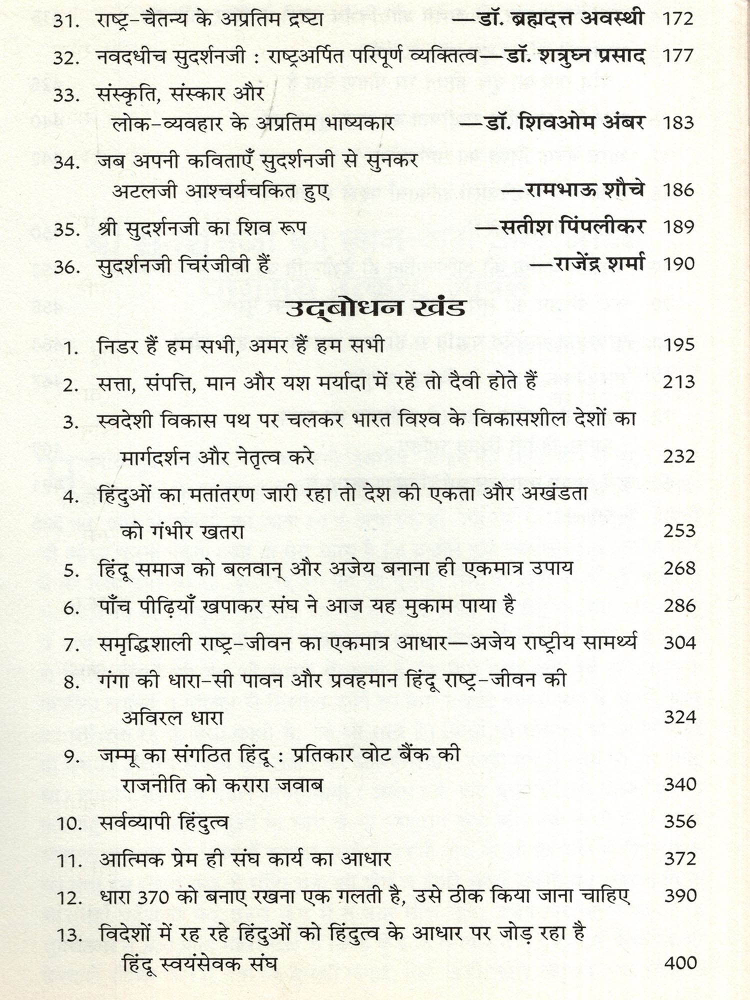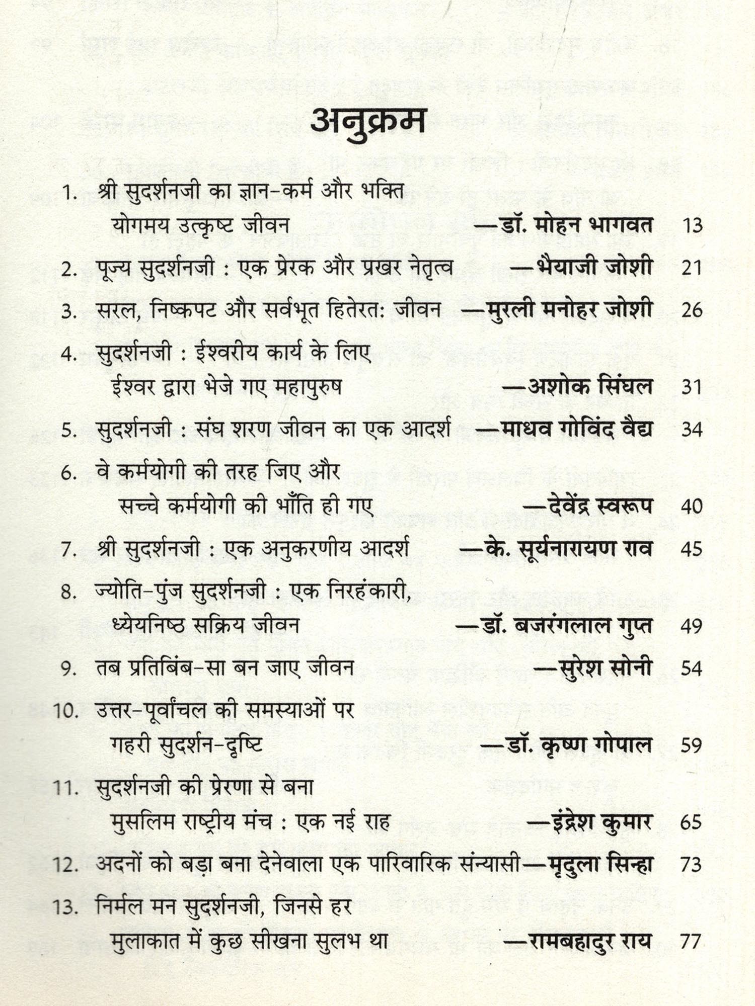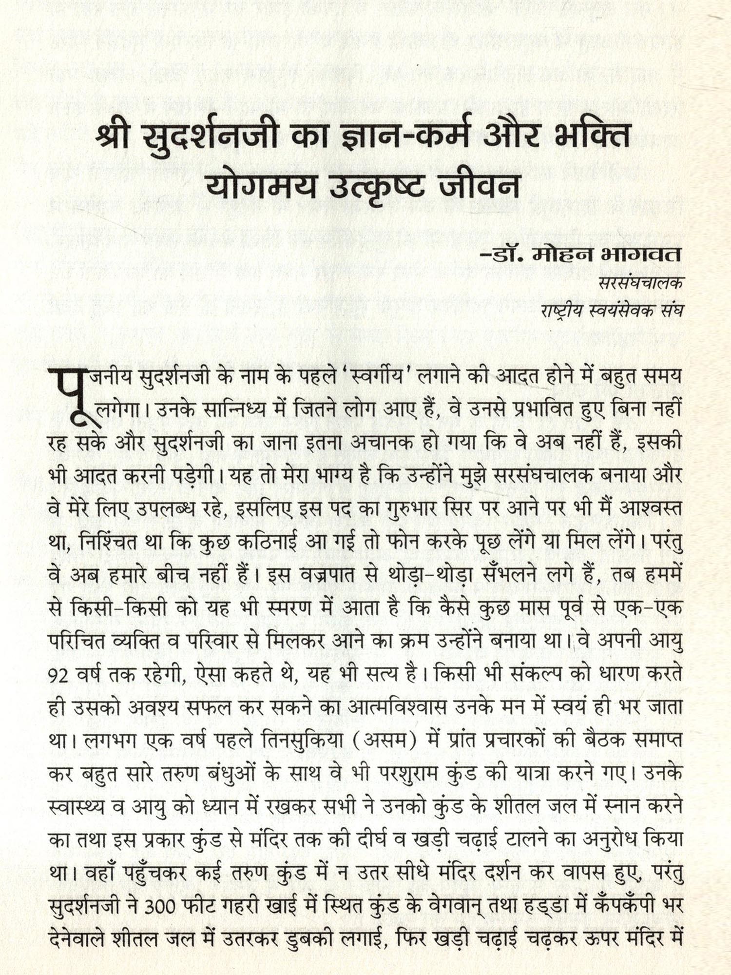 पूज्य सुदर्शनजी का ऋषि तुल्य जीवन भौगोलिक व मत-पंथ की सीमाएँ लाँधकर लक्षावधि अंतःकरणों में एक प्रेरणापुंज के रूप में बसा है। हमारे ऋषियों ने कहा, 'यानि अस्माकं सुचरितानि तानि त्वया सेवितम्' कि उनके जीवन के जो आदर्श हैं, सुचरितरूप श्रेष्ठ जीवन मूल्य जिन्हें उन्होंने जिया, वह सद्मार्ग जिस पर चलकर उन्होंने मानवता के उच्च मानदंड स्थापित किए, उन्हें उनकी आनेवाली संतति यानी हम अपने जीवन के आचरण में ढालें, ताकि हम उन सद्गुण-सदाचार से युक्त उदात्त जीवन-मूल्यों और संस्कारों से युक्त जीवन जी सकें। पूज्य सुदर्शनजी के ऐसे तपोनिष्ठ व संकल्पवान राष्ट्रसेवी जीवन का सान्निध्य जिन असंख्य लोगों को मिला, वे स्मृतियाँ उनके हृदय को सुवासित किए हुए हैं। एक बालक से लेकर स्वयंसेवक बनने, कार्यकर्ता के रूप में ढलकर प्रचारक जीवन का असिधारा व्रत स्वीकारने और विभिन्न दायित्वों का निर्वहन करते हुए पूज्य सरसंघचालक के रूप में प्रतिष्ठित होने की उनकी यात्रा बड़ी प्रेरणास्पद है। बालपन से ही उनके जीवन में वह स्फुरण अनुभव किया गया, जिसे जानकर कहा जा सकता है-होनहार बिरवान के होत चीकने पात। स्वयंसेवक के रूप में उनके बाल व किशोर जीवन की कई घटनाएँ ऐसी ही अनुभूति कराती हैं।