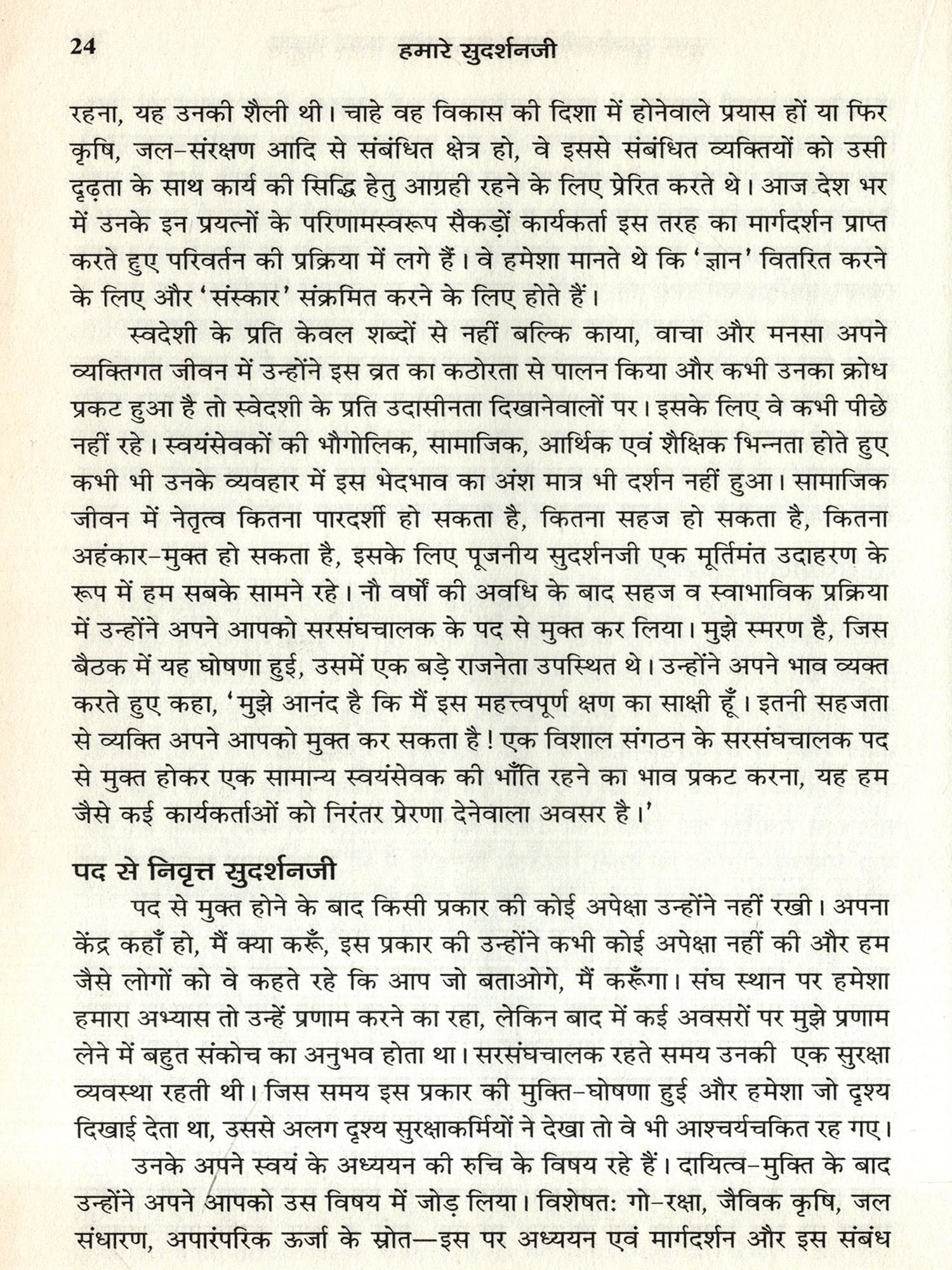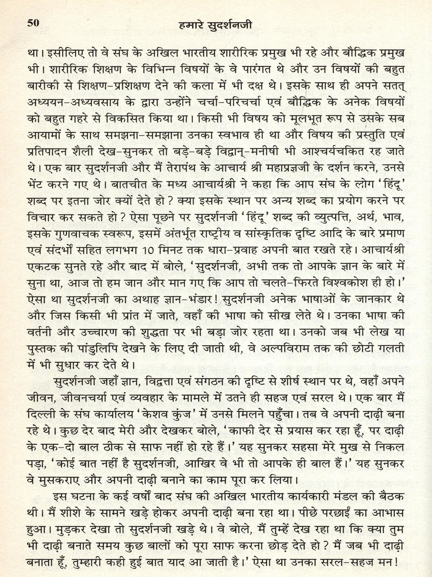 यशस्विता व कर्मशीलता के शिखर पर पहुँचकर भी उनकी विनम्रता व सहजता विरल थी। भोपाल में प्रज्ञा प्रवाह के राष्ट्रीय सम्मेलन के तीनों दिन वे उपस्थित रहे और सत्रों के बीच खाली समय में मुख्य सभागार के बाहर कुरसी डालकर बैठ जाते थे। सामने एक छोटी-सी मेज पर गोमूत्र से चालित बैटरी व उससे जलता बल्व बड़े मनोयोग से सबको दिखा रहे थे और उसकी पूरी तकनीक सबको समझा रहे थे कि ऊर्जा उत्पादन में भी गोमूत्र का कैसा आश्चर्यजनक उपयोग है। इसे बढ़ावा मिलना चाहिए। गो-संरक्षण का यह एक और सूत्र वे बड़ी ललक और सहजता के साथ सबको हृदयंगम कराने के लिए प्रयत्नशील थे। पूज्य सरसंघचालक जैसे गुरुतर दायित्व पर वर्षों विराजमान रहे व्यक्ति की ऐसी निरहंकारता दुर्लभ ही कही जाएगी। भाषा की शुद्धता के प्रति उनका आग्रह इतना था कि छोटे-छोटे शब्दों तक पर उनकी नजर रहती थी। मेरे 'पाञ्चजन्य' का संपादक रहते समय भ्रष्टाचार के विरुद्ध अण्णा आंदोलन चरम पर था। पाञ्चजन्य में हम उसकी रपट प्रकाशित कर रहे थे। अचानक भोपाल से उनके सहायक श्री अनुपमजी का फोन आया कि पूज्य सुदर्शनजी बात करेंगे। मैं आश्चर्यचकित रह गया, जब पूज्य सुदर्शनजी ने कहा कि अपनी रपटों में तुम लोग अण्णा हजारेजी का नाम गलत छाप रहे हो। मैंने कहा कि भाईसाहब, जैसा सब जगह छप रहा है, हम भी वैसा ही छाप रहे हैं। उन्होंने कहा, नहीं! वह गलत है- अन्ना नहीं अण्णा है उनका सही नाम, इसी को छापो। मैंने कहा ठीक है।