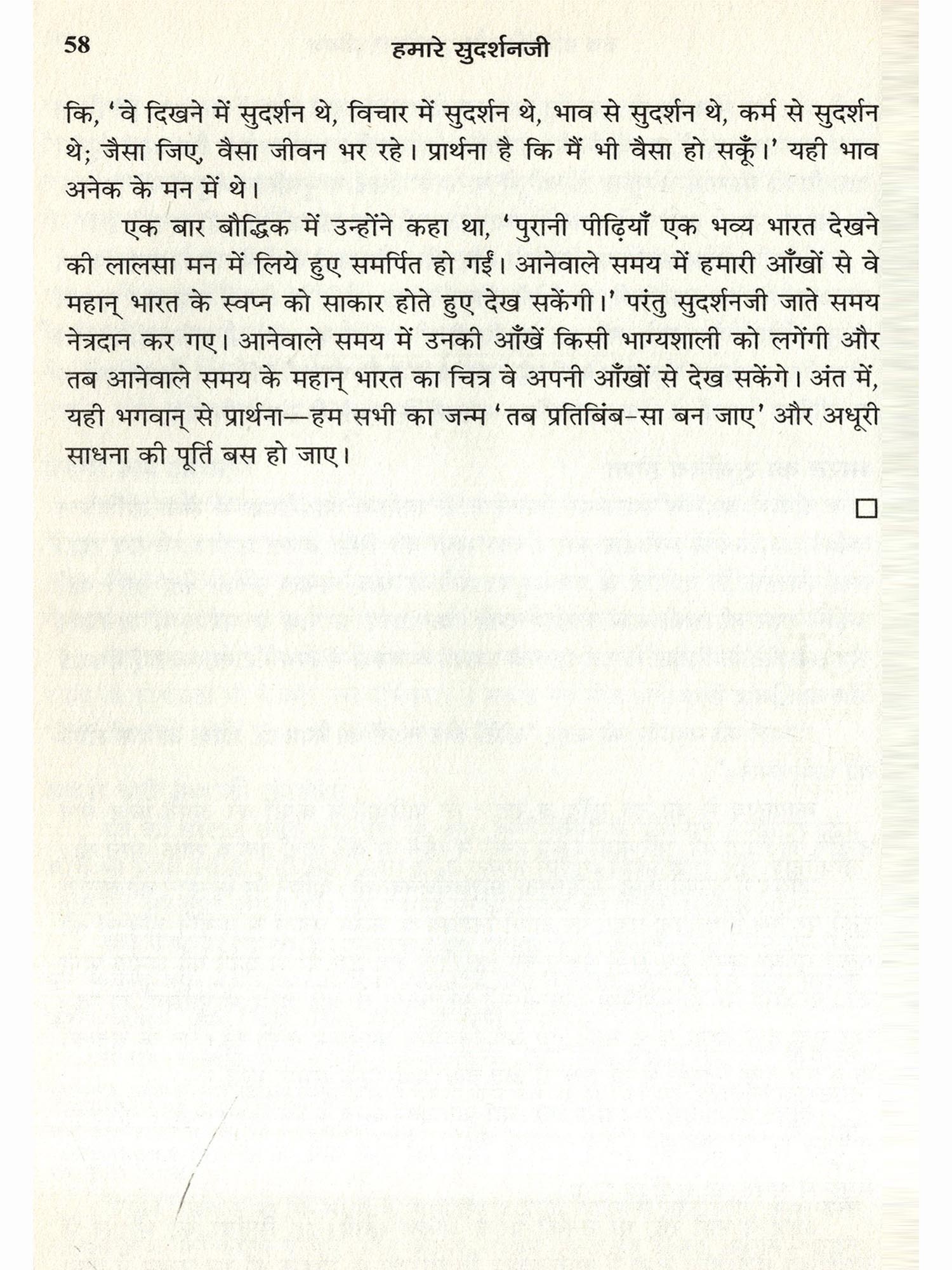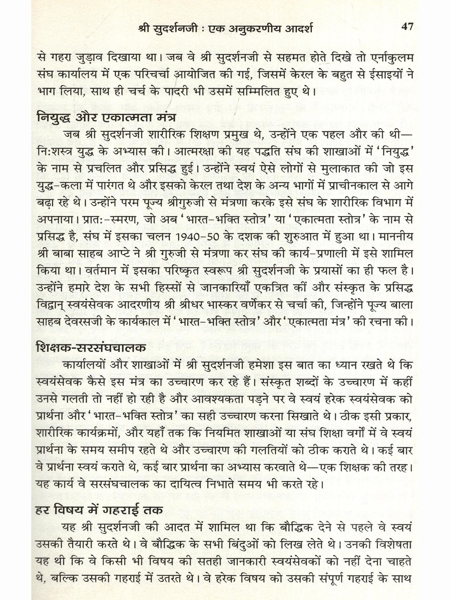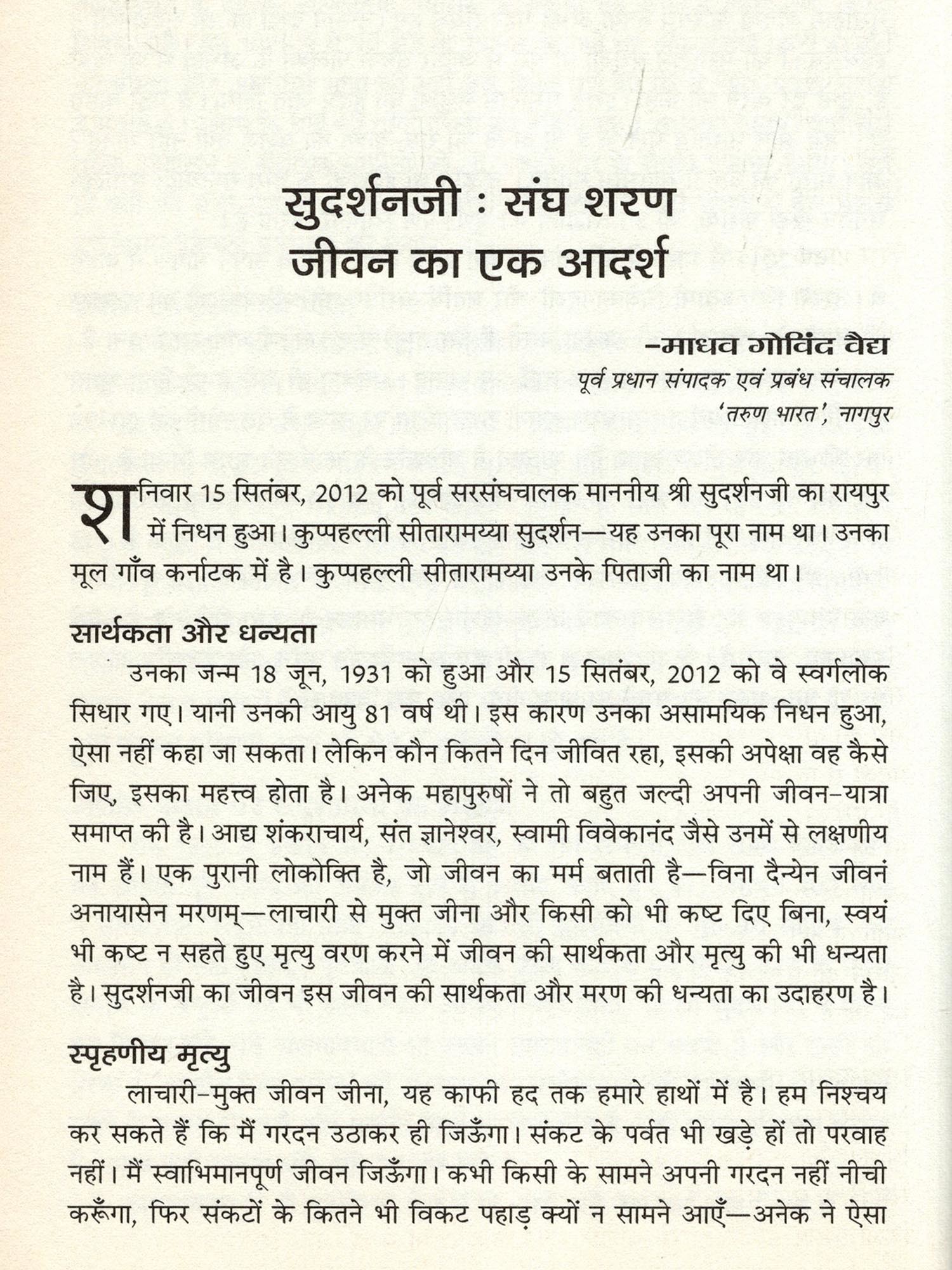 महाराज मनु ने पृथ्वी पर भारतवर्ष के प्रादुर्भाव व इसकी संतति का उद्देश्य निरूपित करते हुए लिखा है- एतद्देश प्रसूतस्य सकाशादग्रजन्मना/स्वं स्वं चरितं शिक्षेरन् पृथिव्याः सर्वमानवाः। यानी इस देश का जन्म इसलिए हुआ है ताकि यहाँ के निवासी अपने-अपने जीवन के आचरण से पृथ्वी पर रहनेवाले समस्त मानवों को मनुष्यता की शिक्षा दे सकें। राष्ट्रीय स्वयंसेवक संघ ने अपनी कार्यपद्धति से इस भाव को जीनेवाले अनेकशः व्यक्तियों का निर्माण किया है, जिन्होंने अपने सब प्रकार से सुयोग्य व क्षमतावान जीवन को राष्ट्र व समाज के सर्वतोमुखी उन्नयन के लिए पूर्णरूपेण समर्पित करने का आदर्श प्रस्तुत किया। संघ के पाँचवें सरसंचालक पूज्य कुप.सी. सुदर्शन इस देदीप्यमान मणिमाला में जड़े एक जगमगाते रत्न थे, जिनके जीवनादर्श ने असंख्य कार्यकर्ताओं को गढ़ा। आज तो इंजीनियर बनना आम हो गया है, लेकिन जिस दौर में इंजीनियर बनना नौजवानों के लिए एक दुर्लभ स्वप्न जैसा था, तब दूरसंचार अभियांत्रिकी में स्नातक होना बड़ी बात थी। पूज्य सुदर्शनजी ने इस उच्च शिक्षा को प्राप्त करने के बाद दिल्ली में एक आकर्षक सरकारी नौकरी के प्रस्ताव को भी त्यागकर अपनी युवावस्था में देशसेवा का आदर्श प्रस्तुत किया। उन्होंने मशीनी कल-पुर्जों को दुरुस्त करने की बजाय राष्ट्र का मन और समाज का तंत्र सँवारने की राह चुनी। इसके लिए उन्होंने अपनी युवा आकांक्षाएँ मातृभूमि की वेदी पर सहर्ष भेंट चढ़ा दीं। इस तरह 'स्वं स्वं चरितं शिक्षेरन्' के उच्च आदर्श को अंतिम श्वास तक जीनेवाले वे विरल व्यक्ति थे।