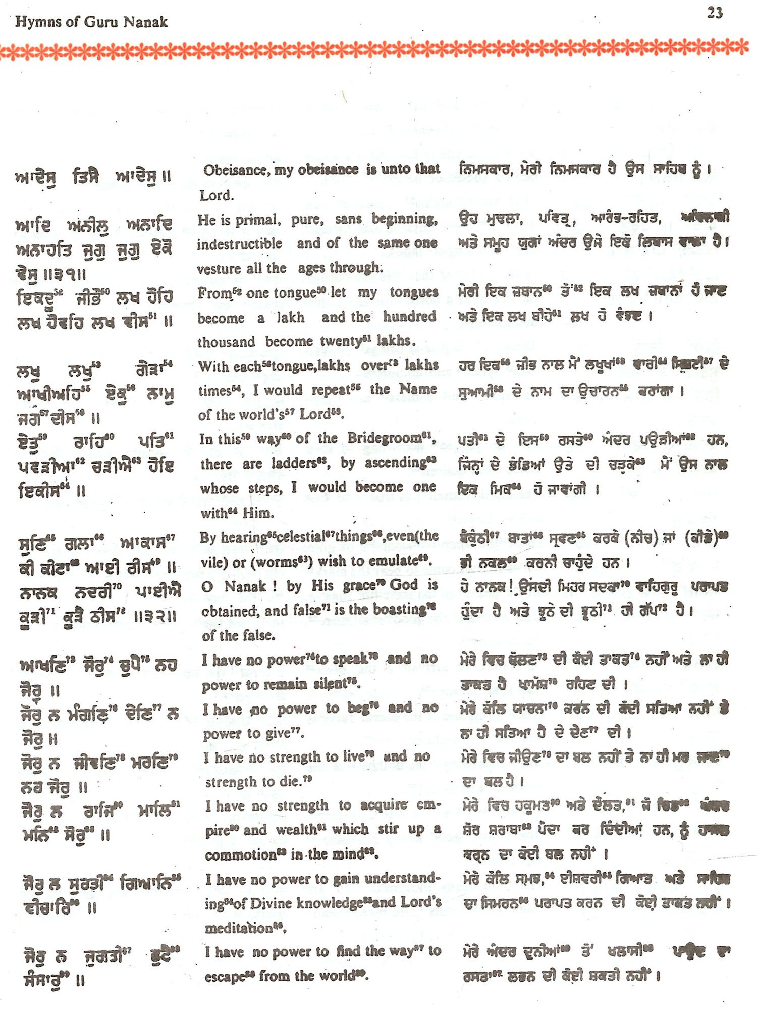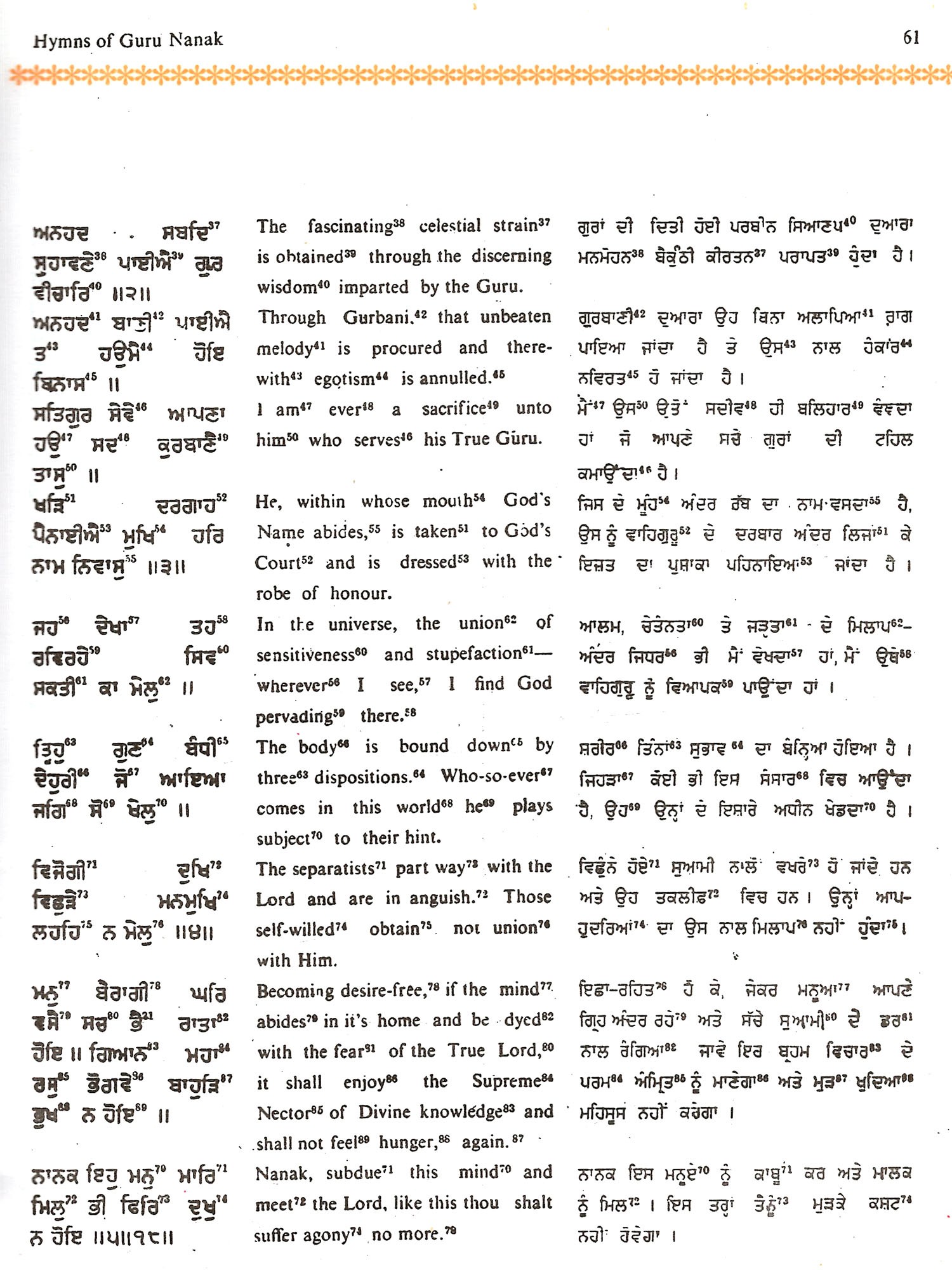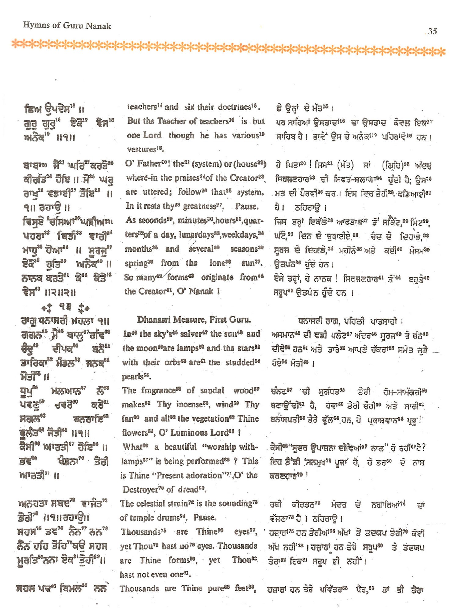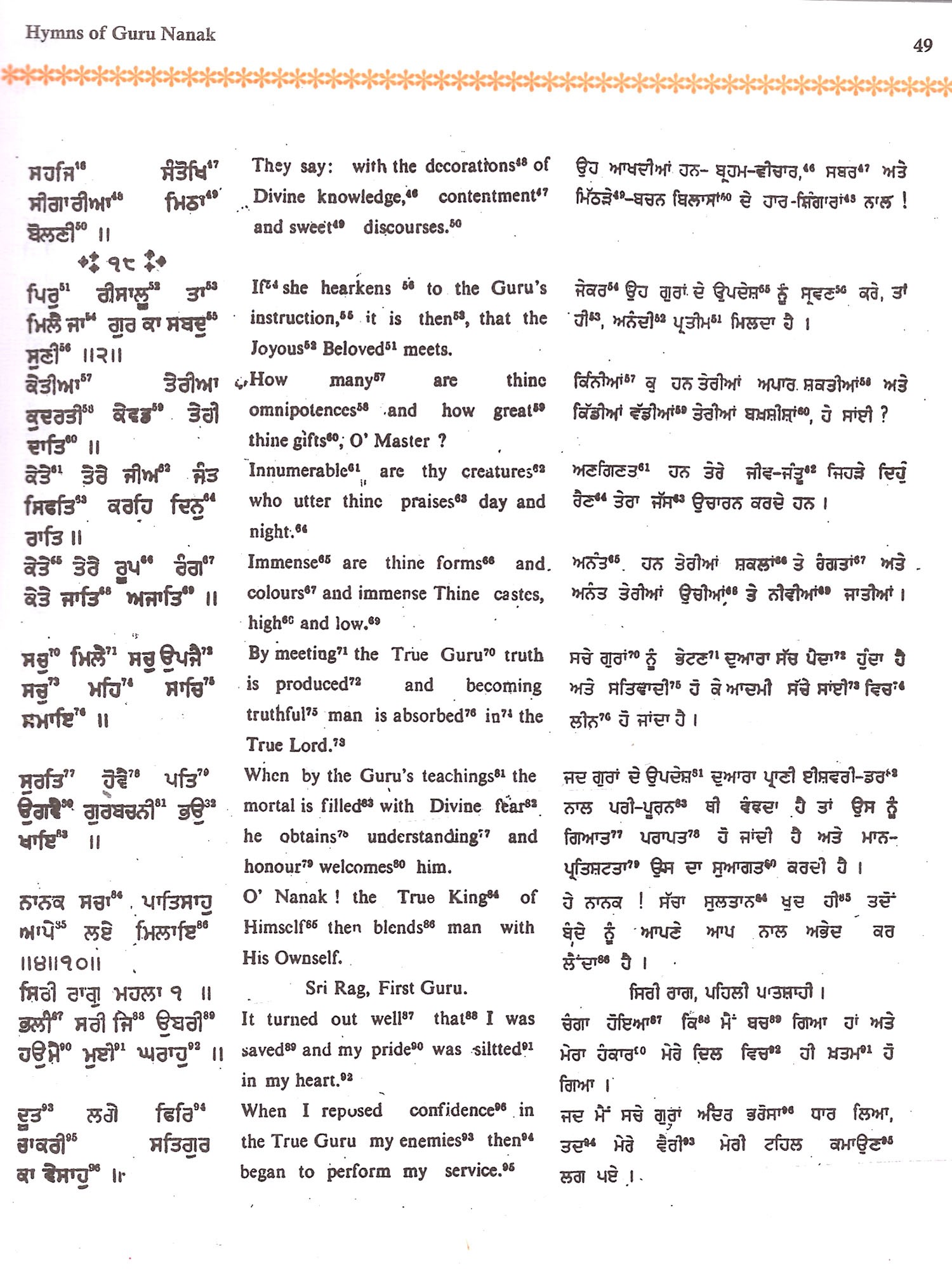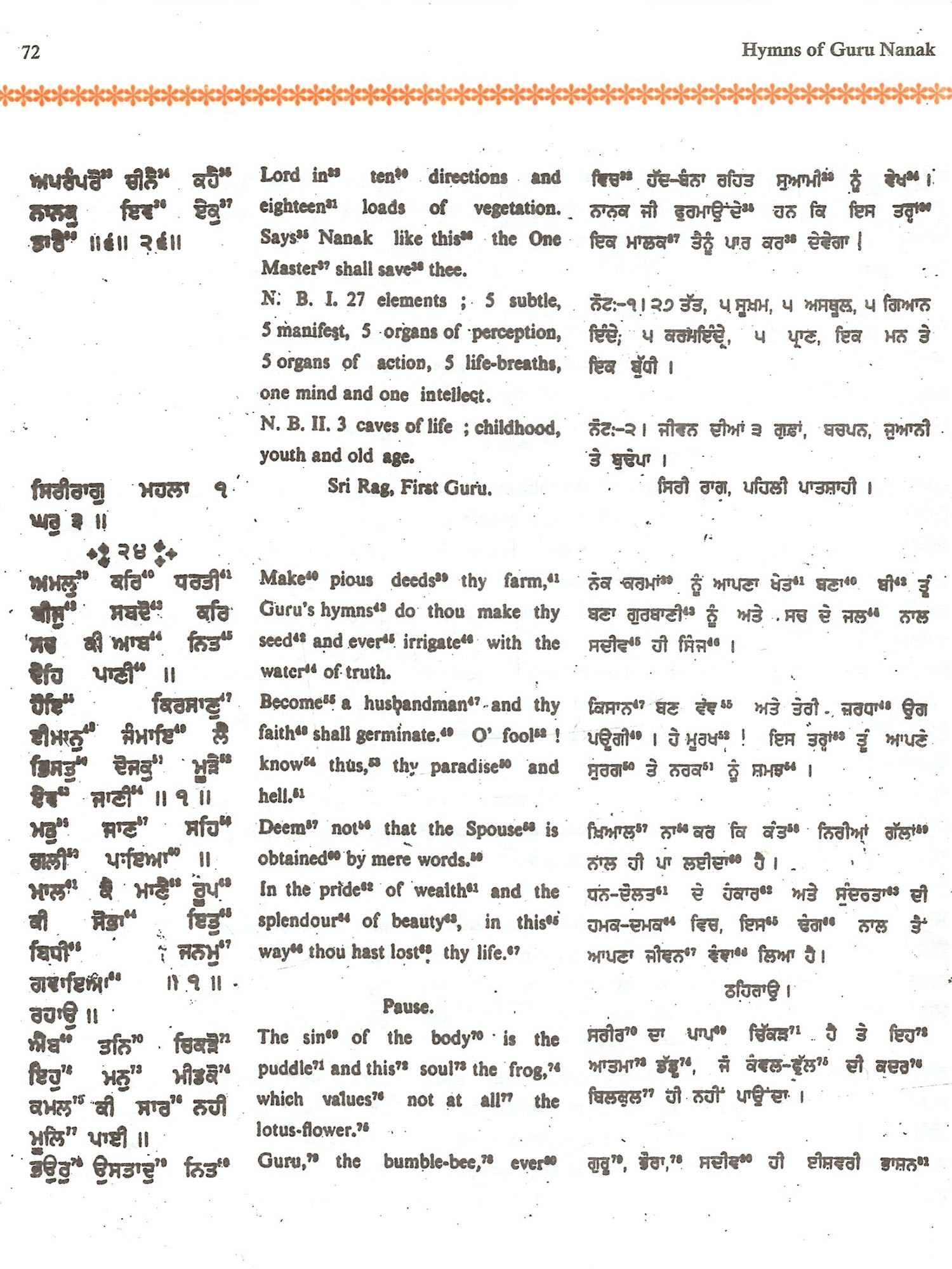 Language Department. Punjab takes immense pleasure and feels blessed to bring out yet another roprint of the book "Hymns Of Guru Nanak" on the auspicious occasion of 550 birth anniversary of Guru Nanak Dev H. The book was which was earlier published in the year 1972. The humble effort behind this publication is to disseminate the Word & Teachings of Guru Nanak Sahih who was a great philosopher, poet, traveler, social leveler, mass communicator and an advocate of humanism: I hope that this publication will prove to be a great source of enligtucsment, spiritual healing, guidance & motivation for scholars. Literary enthusiasts, seekers of truth as well as common masses. For each Hymn, along with Punjabi translation the English version is also provided for those who are not well-versed in Punjabi language.