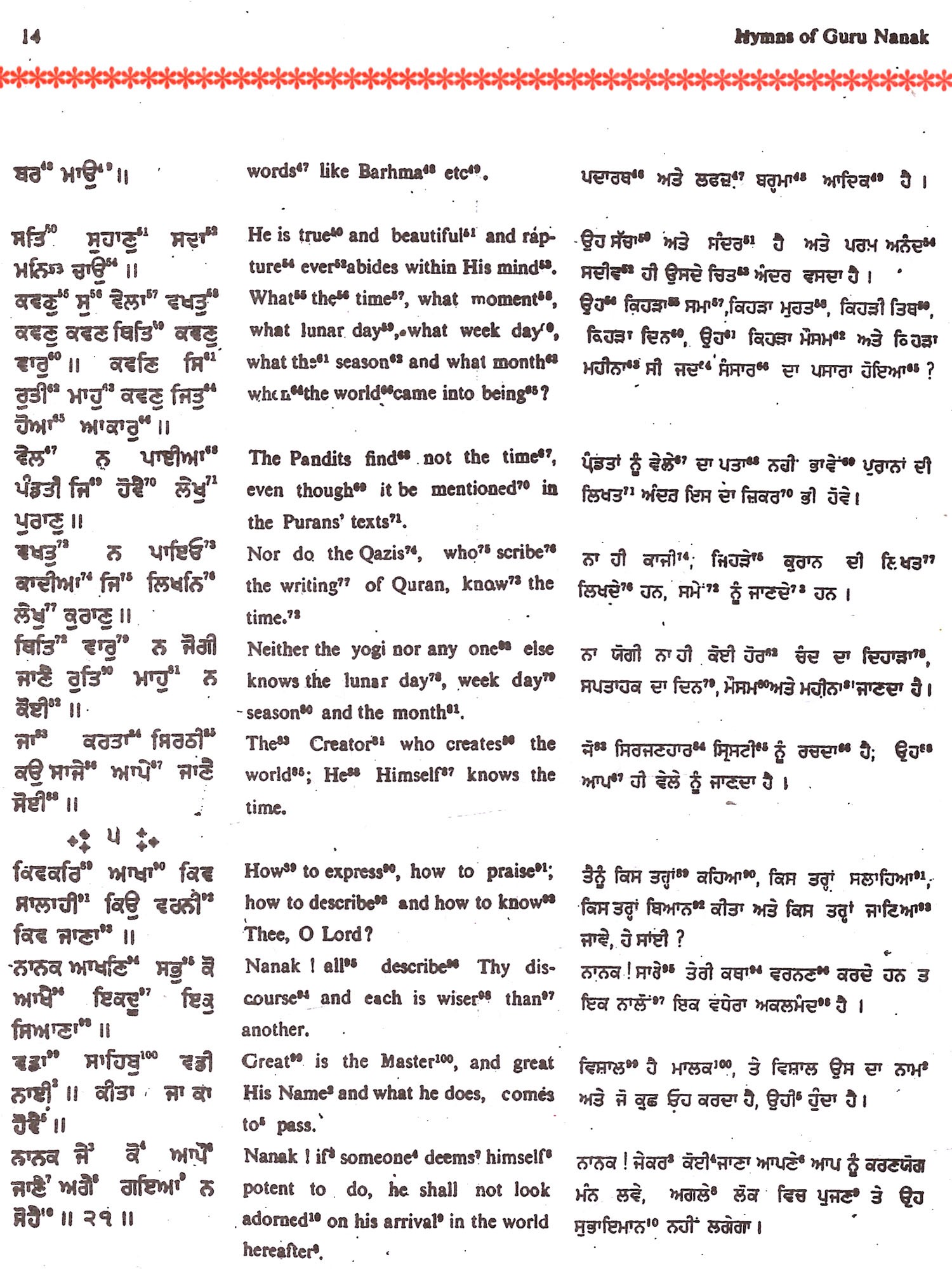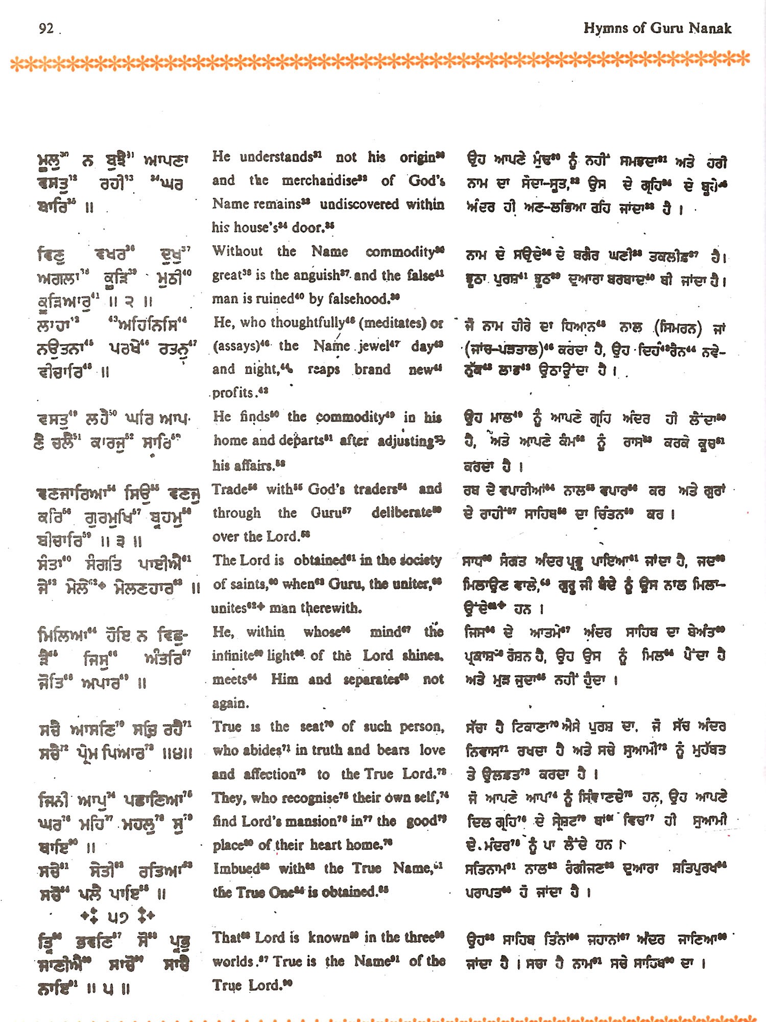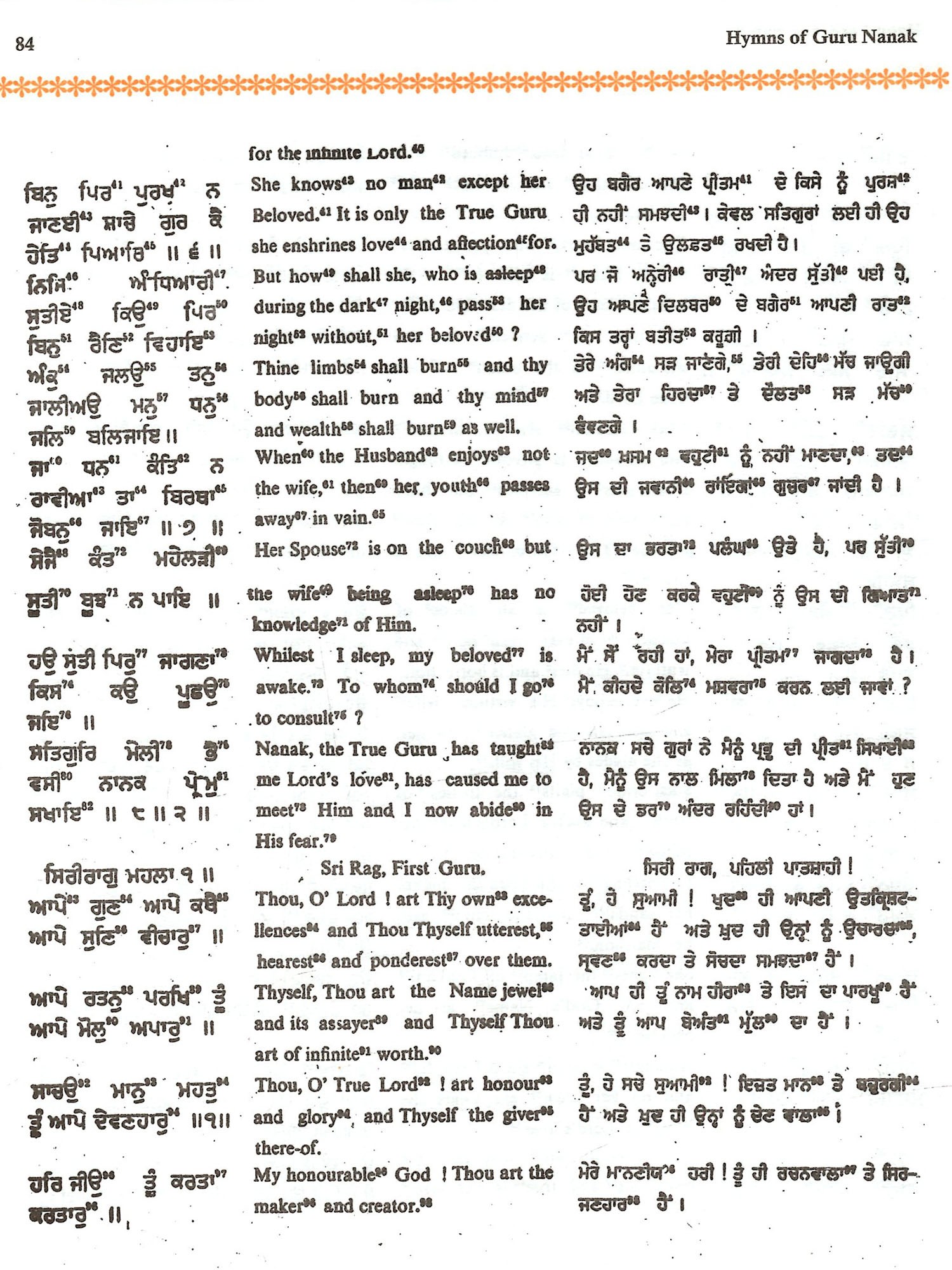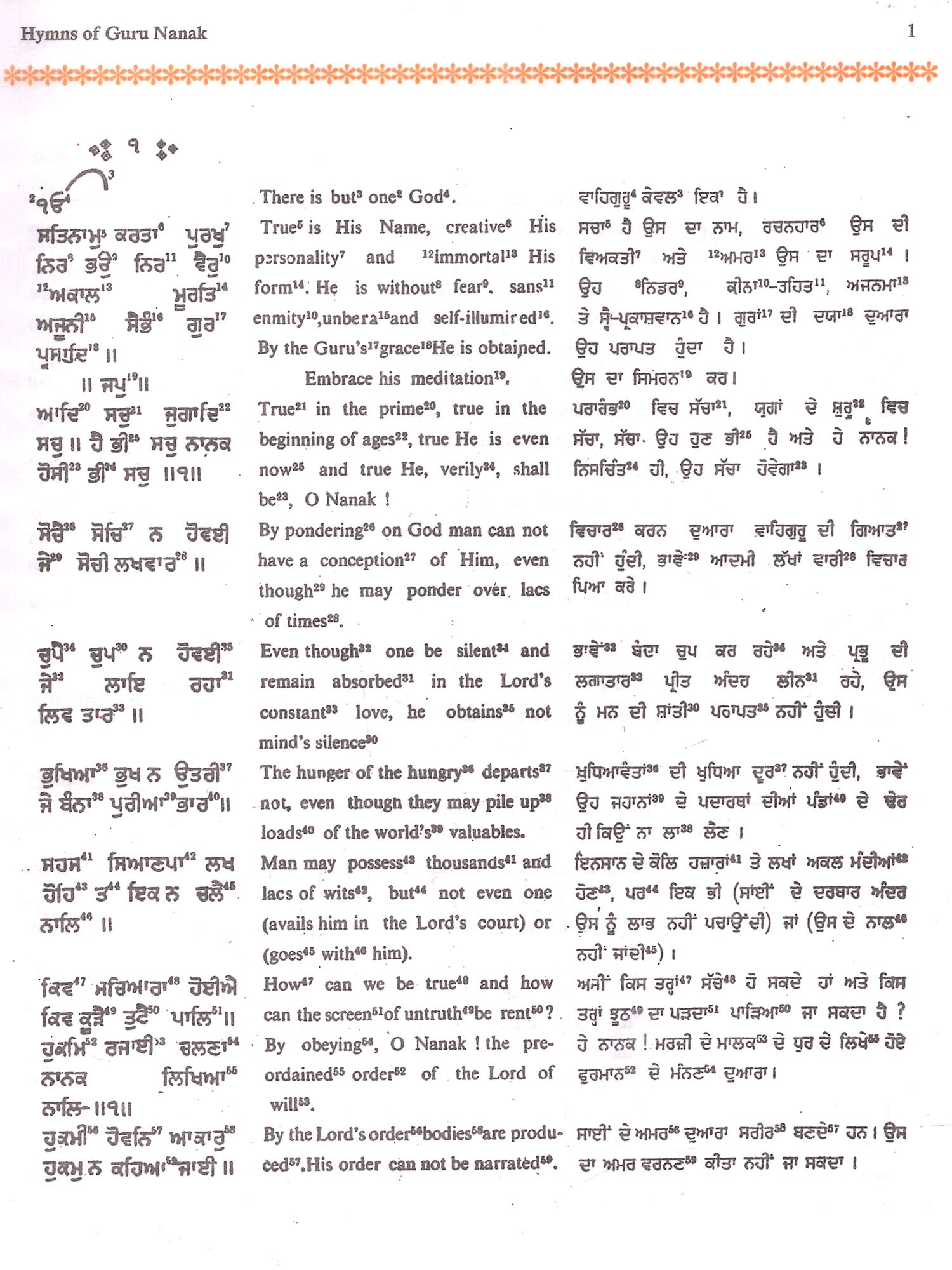 Language Department. Punjab takes immense pleasure and feels blessed to bring out yet another roprint of the book "Hymns Of Guru Nanak" on the auspicious occasion of 550 birth anniversary of Guru Nanak Dev H. The book was which was earlier published in the year 1972. The humble effort behind this publication is to disseminate the Word & Teachings of Guru Nanak Sahih who was a great philosopher, poet, traveler, social leveler, mass communicator and an advocate of humanism: I hope that this publication will prove to be a great source of enligtucsment, spiritual healing, guidance & motivation for scholars. Literary enthusiasts, seekers of truth as well as common masses. For each Hymn, along with Punjabi translation the English version is also provided for those who are not well-versed in Punjabi language.