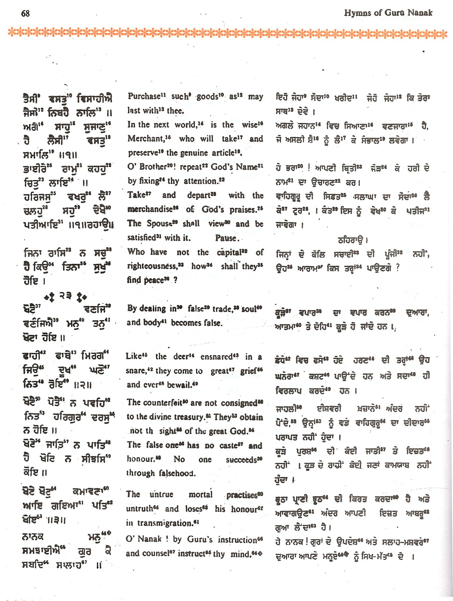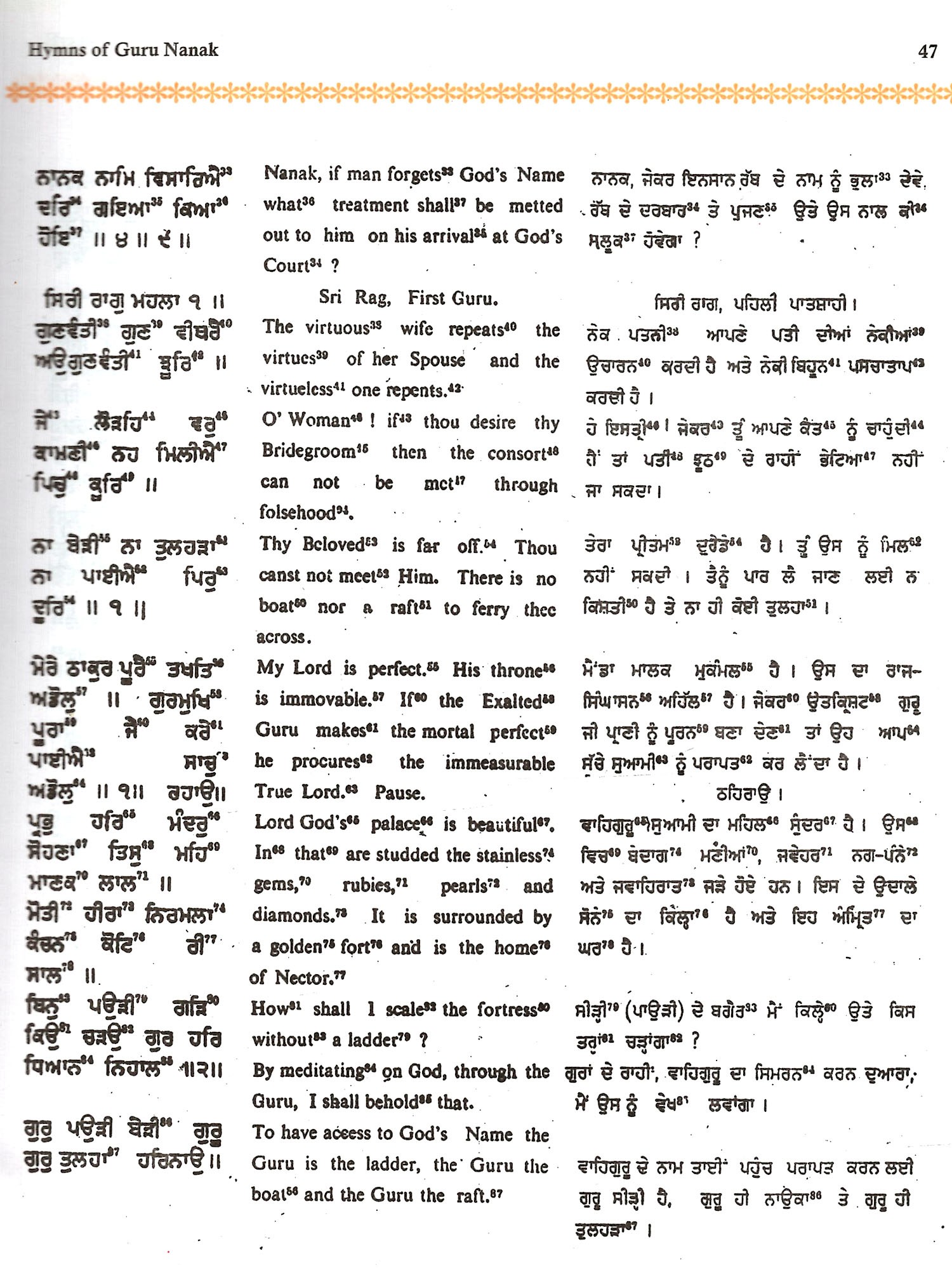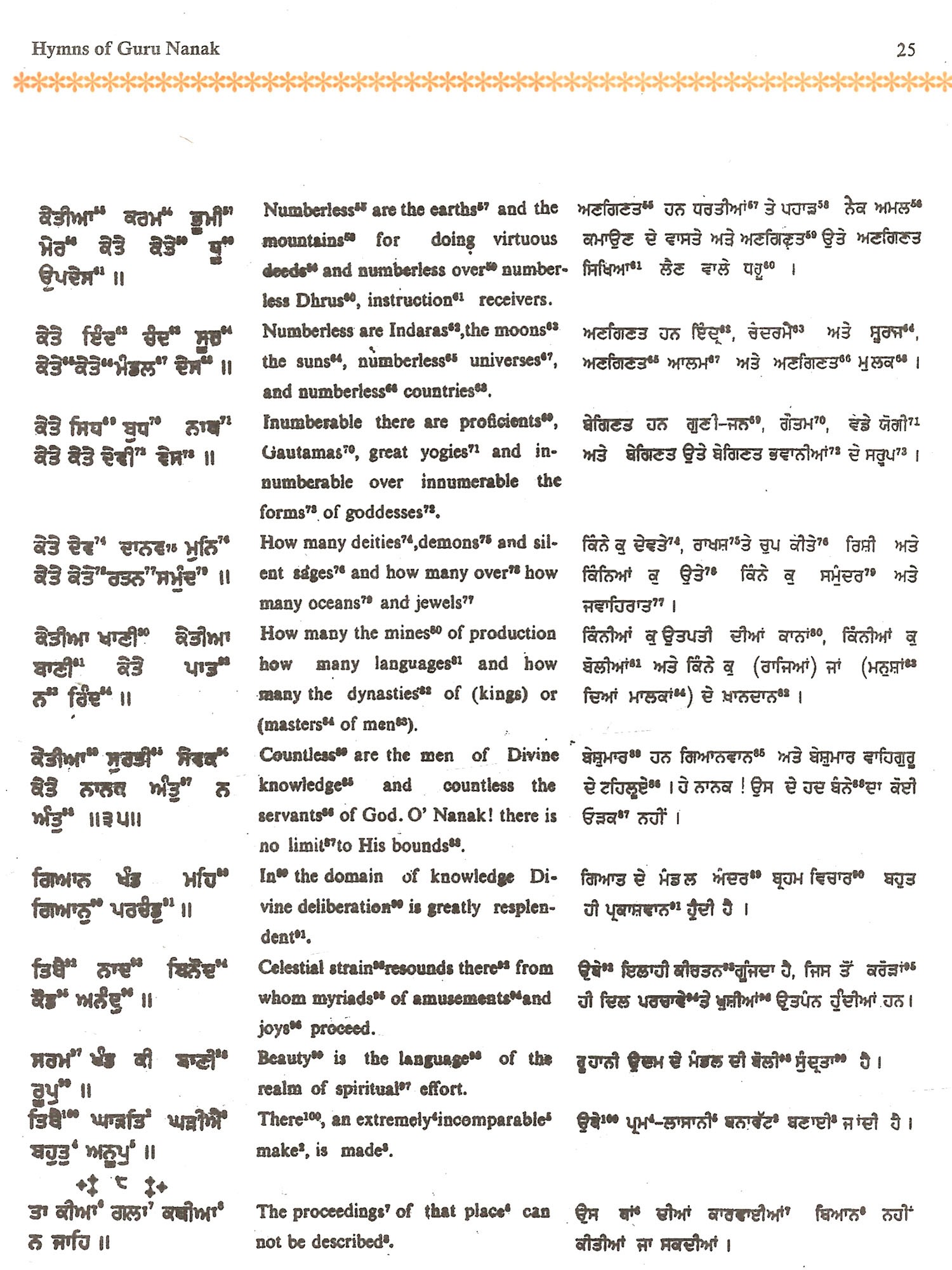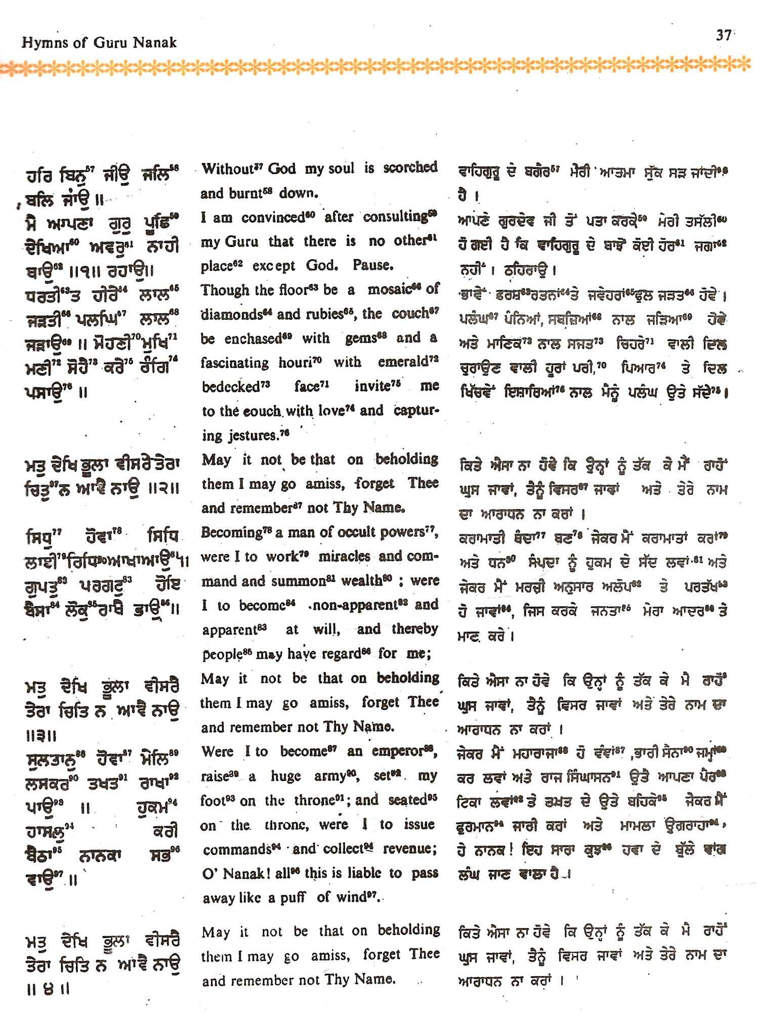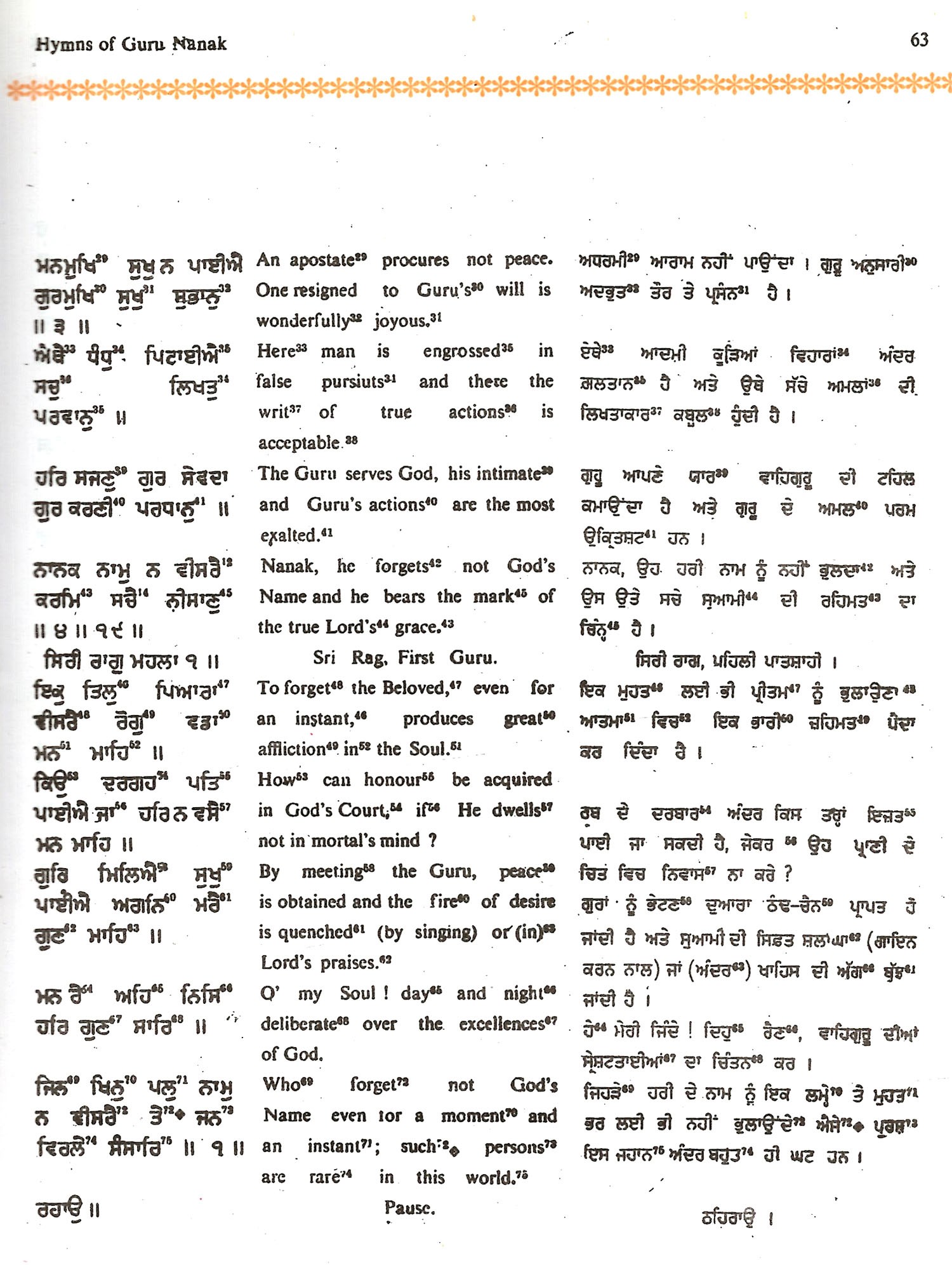 Language Department. Punjab takes immense pleasure and feels blessed to bring out yet another roprint of the book "Hymns Of Guru Nanak" on the auspicious occasion of 550 birth anniversary of Guru Nanak Dev H. The book was which was earlier published in the year 1972. The humble effort behind this publication is to disseminate the Word & Teachings of Guru Nanak Sahih who was a great philosopher, poet, traveler, social leveler, mass communicator and an advocate of humanism: I hope that this publication will prove to be a great source of enligtucsment, spiritual healing, guidance & motivation for scholars. Literary enthusiasts, seekers of truth as well as common masses. For each Hymn, along with Punjabi translation the English version is also provided for those who are not well-versed in Punjabi language.