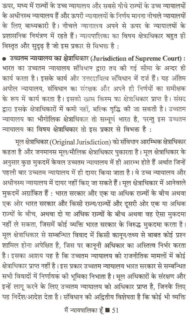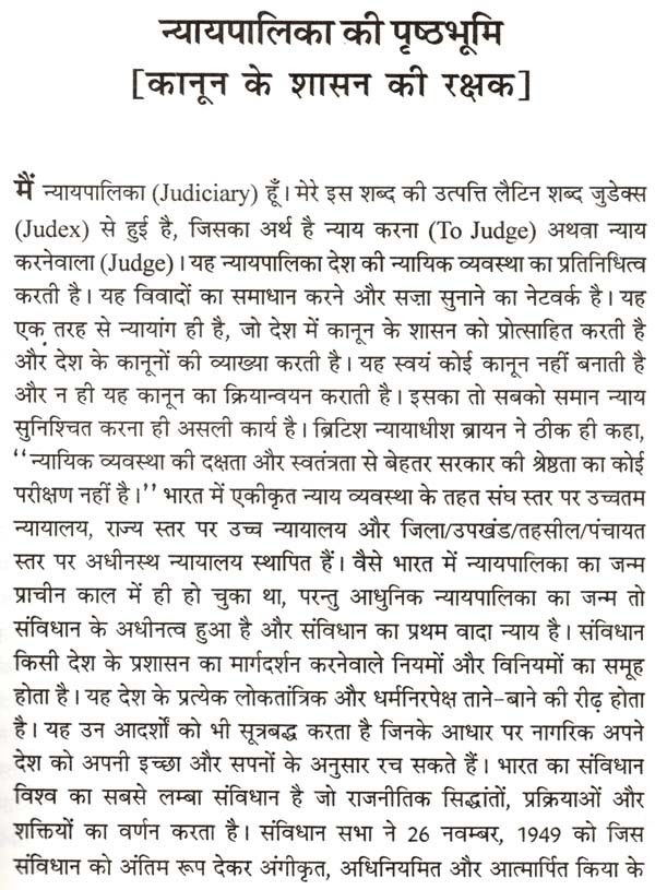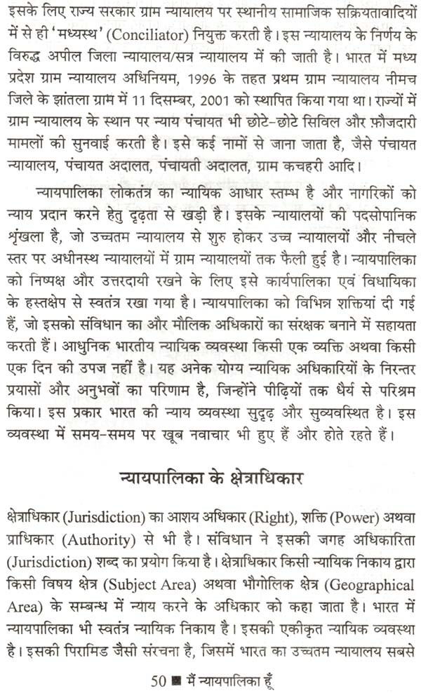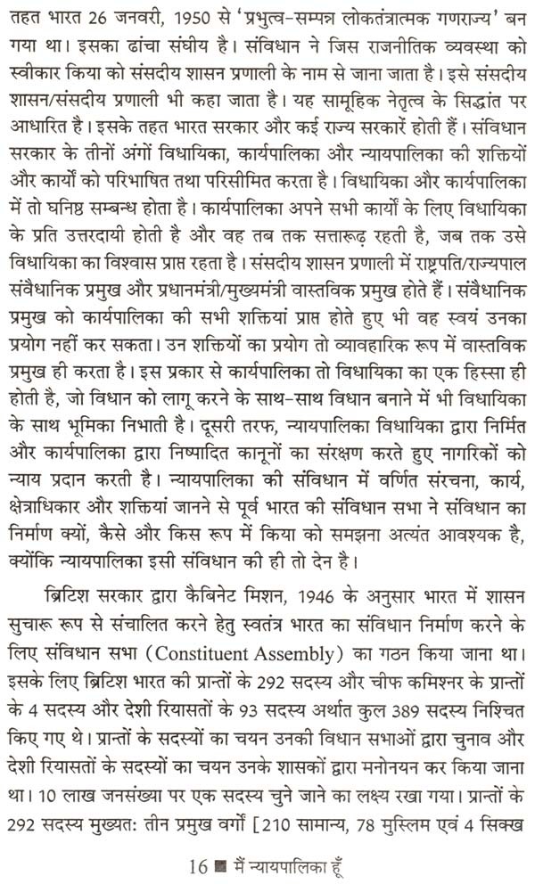 सरकार के तीनों अंग विधायिका, कार्यपालिका और न्यायपालिका अपनी-अपनी भूमिका बखूबी निभाते हैं। संसदीय शासन प्रणाली में विधायिका और कार्यपालिका एक दूसरे की पूरक और न्यायपालिका स्वतंत्र होती है। न्यायिक व्यवस्था तो पूरे देश के लिए एक समान ही है अर्थात भारत में एकीकृत न्यायिक व्यवस्था है। इसमें नीचे से ऊपर की ओर अधीनस्थ न्यायालय, उच्च न्यायालय और उच्चतम न्यायालय होते हैं। इस प्रकार से देश में विभिन्न स्तरों पर उपस्थित न्यायालयों को सामूहिक रूप से न्यायपालिका कहा जाता है। यह नागरिकों के लिए आकर्षण का विषय होती है। पुस्तक में इसी न्यायपालिका के प्राचीन काल से आधुनिक काल तक के इतिहास पर दृष्टिपात करने के बाद इसकी संरचना, न्यायिक व्यवस्था और न्यायिक प्रक्रिया का सरल एवं सरस भाषा में विशद विवेचन किया गया है ताकि नागरिक विधि से ओतप्रोत होते हुए न्यायपालिका के बारे में बेहतर ज्ञान प्राप्त कर अपने अधिकारों की रक्षा कर सकें। वैसे भी स्वस्थ लोकतंत्र में नागरिकों को यह जानने का अधिकार है कि न्यायपालिका उनके अधिकारों के लिए क्या-क्या दायित्व कैसे-कैसे और कब-कब निभाती है। इसी के मद्देनजर पुस्तक 'मैं न्यायपालिका हूँ' की मनमोहक शैली में रचना की गई है। साहित्यकार ने अपने चालीस वर्षीय सेवाकाल के दौरान सभी स्तर के न्यायालयों के कोर्टरूम में राजकीय और निजी मामलों के संदर्भ में अनेक बार उपस्थिति के समय न्यायिक व्यवस्था एवं प्रक्रिया सम्बन्धी अर्जित अनुभवों और अखबारी ज्ञान के आधार पर इसे समकालीन और आधुनिक स्वरूप प्रदान करने के लिए भागीरथ प्रयास किया है। फिर भी, यह सर्वतः पूर्ण नहीं मानी जा सकती है। यह तो व्यक्तिगत ज्ञान की उन्नति के लिए ही है। यह भारत के सभी नागरिकों के लिए बहुत ही उपयोगी है। पुस्तक की बहिन 'मैं विधायिका हूँ' ने अच्छी खासी बहुप्रियता हासिल की है। यह पुस्तक कैसी बन पड़ी का निर्णय तो आपको ही करना है।