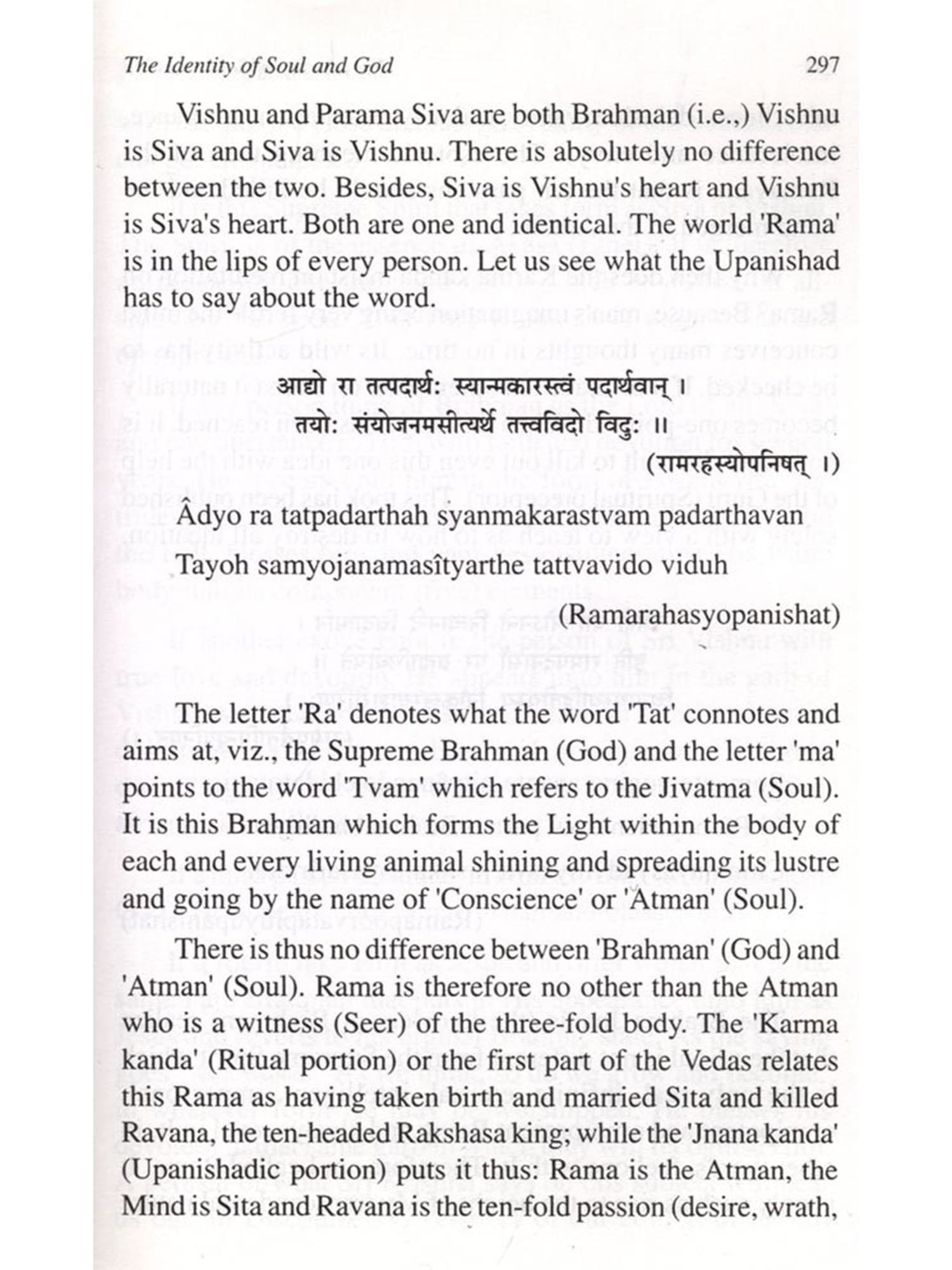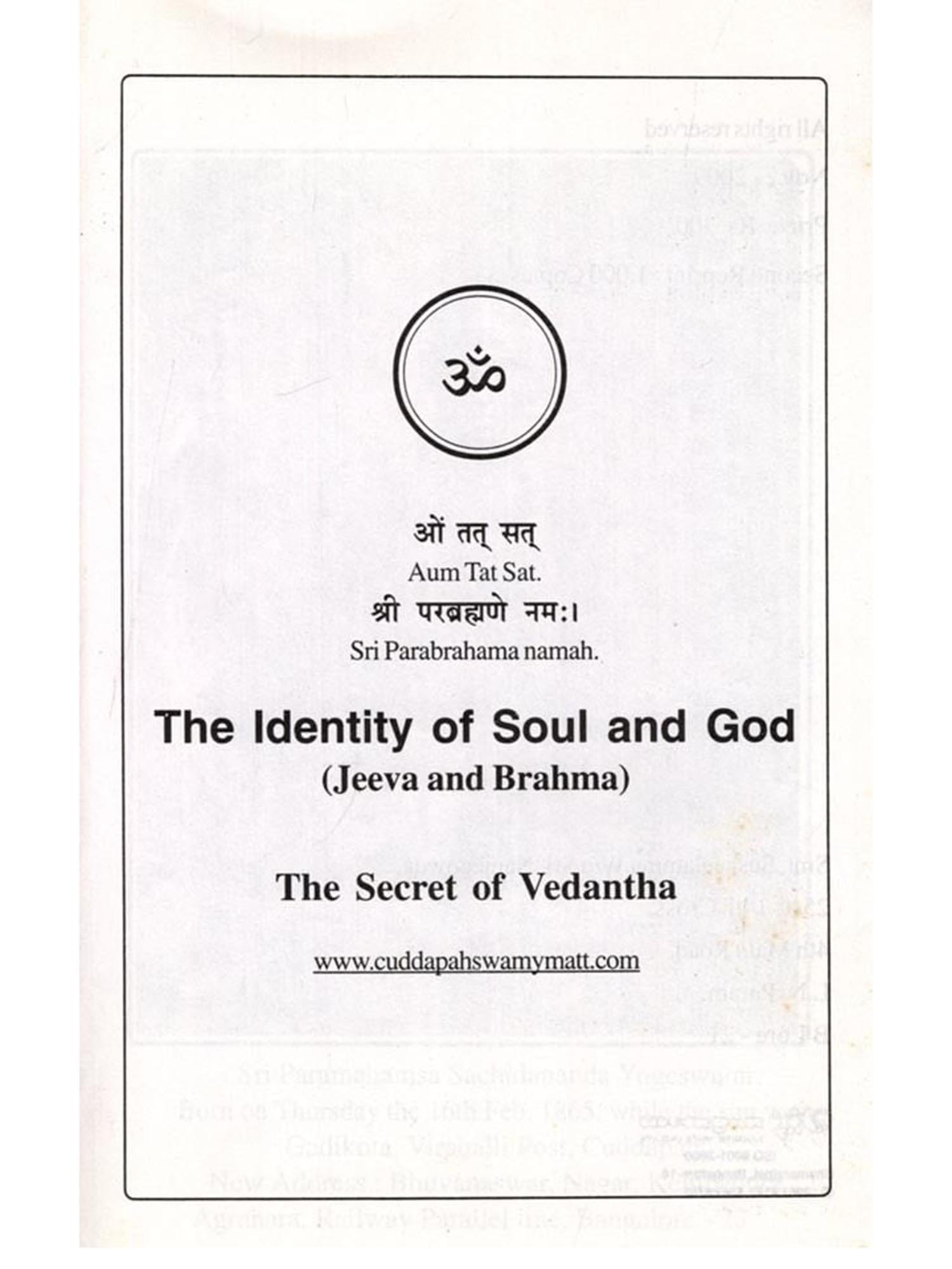 This inimitable book - The Identity of Jiva and Brahma (Soul and God) the "Secret of the Vedanta", discloses all the most important in its kind, it has the great dignity and force of truth behind, having been written by a spiritual giant who has rent the veil that conceals the real Man and come in contact with the Spiritual Truth, by one who is a Jivan Mukta, an Avadhuta, a Paramahamsa, i.e., one who has mastered that most invincible Hamsa and realised Brahma on this very mundane world. To him who has realised the Unqualified, Universal-Intelligence-Bliss common to all Religions, there is no difference of caste, creed or religion and his watch-word has ever been "Openness" or ("Vettaveli"). He has shown in his own self most clearly that the Realisation of the one great idea the Divinty in man - is the most practical thing in life, attainable by the destruction of all ideation.