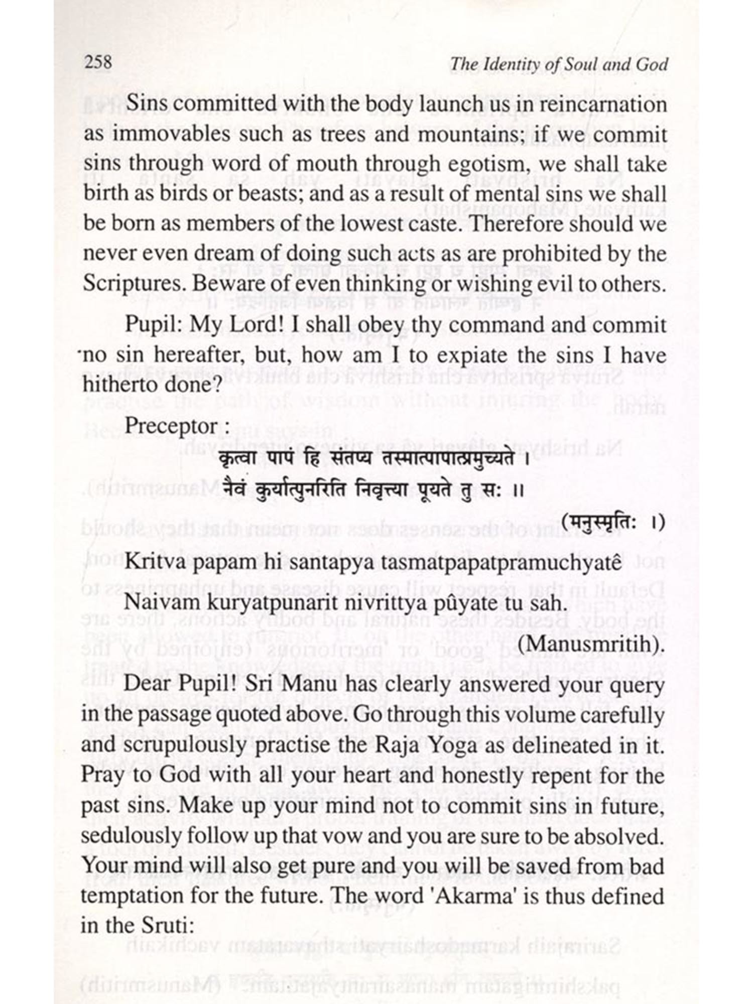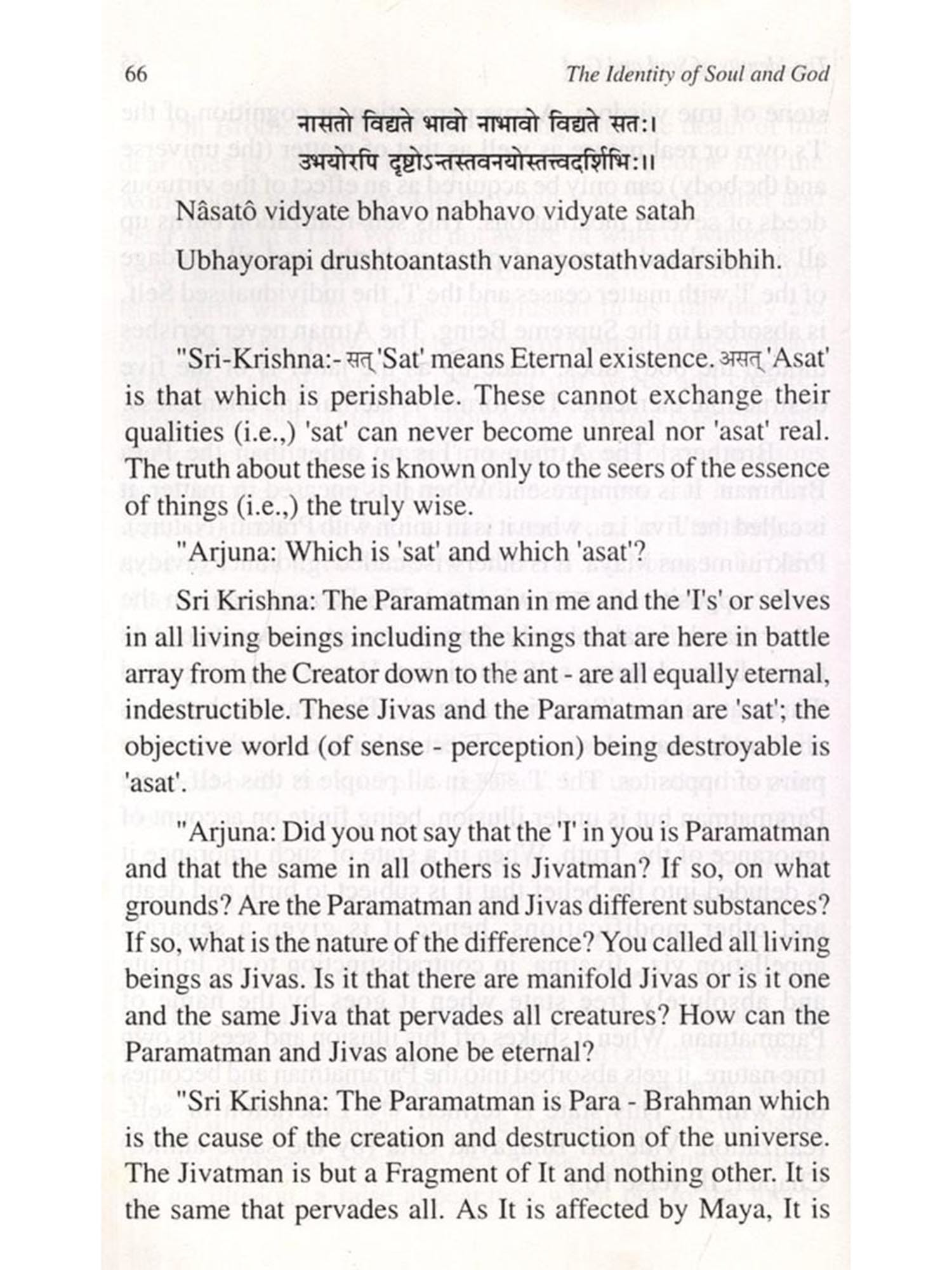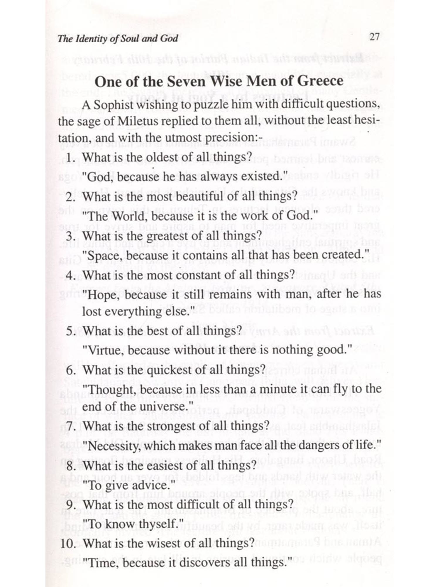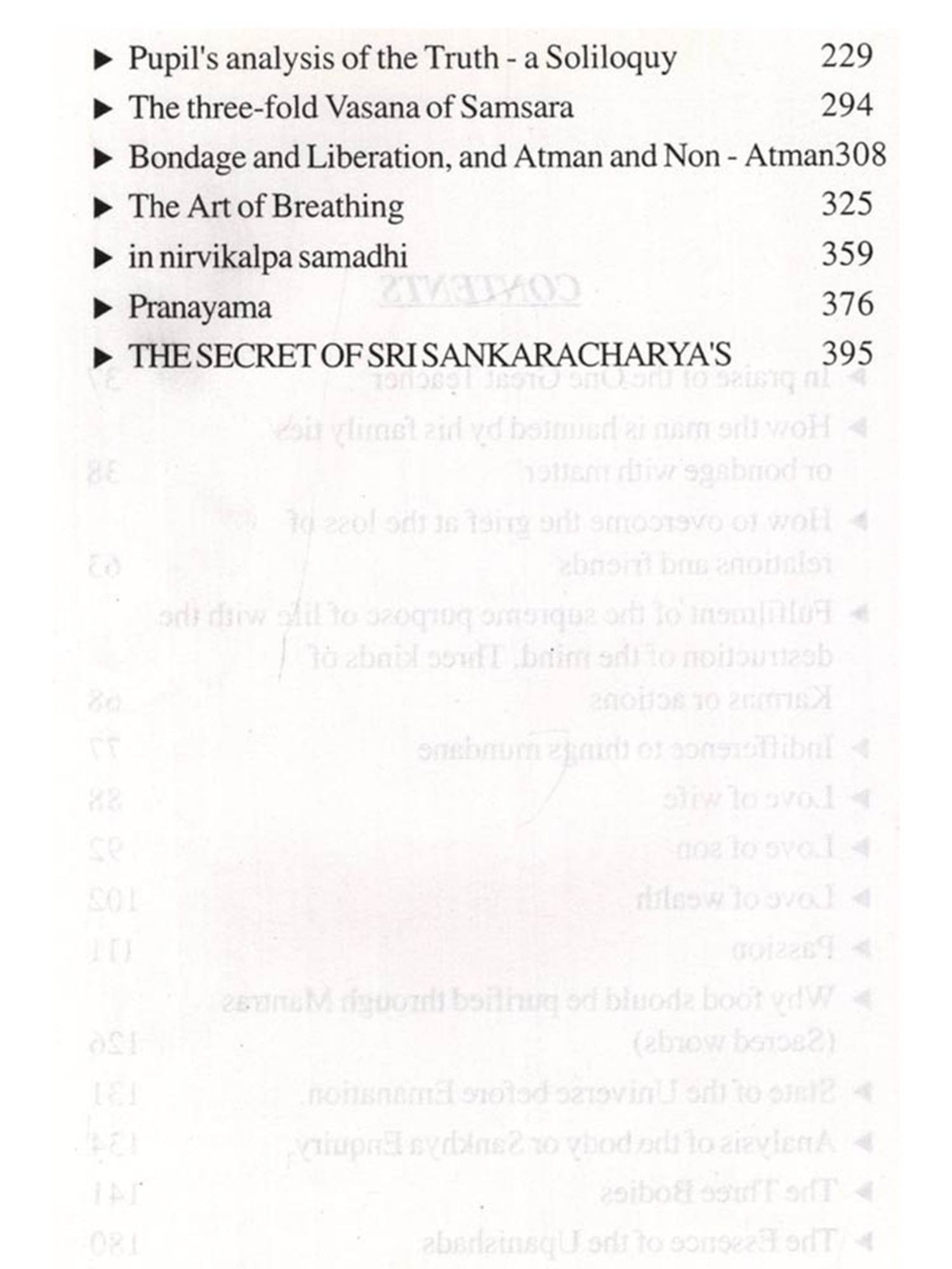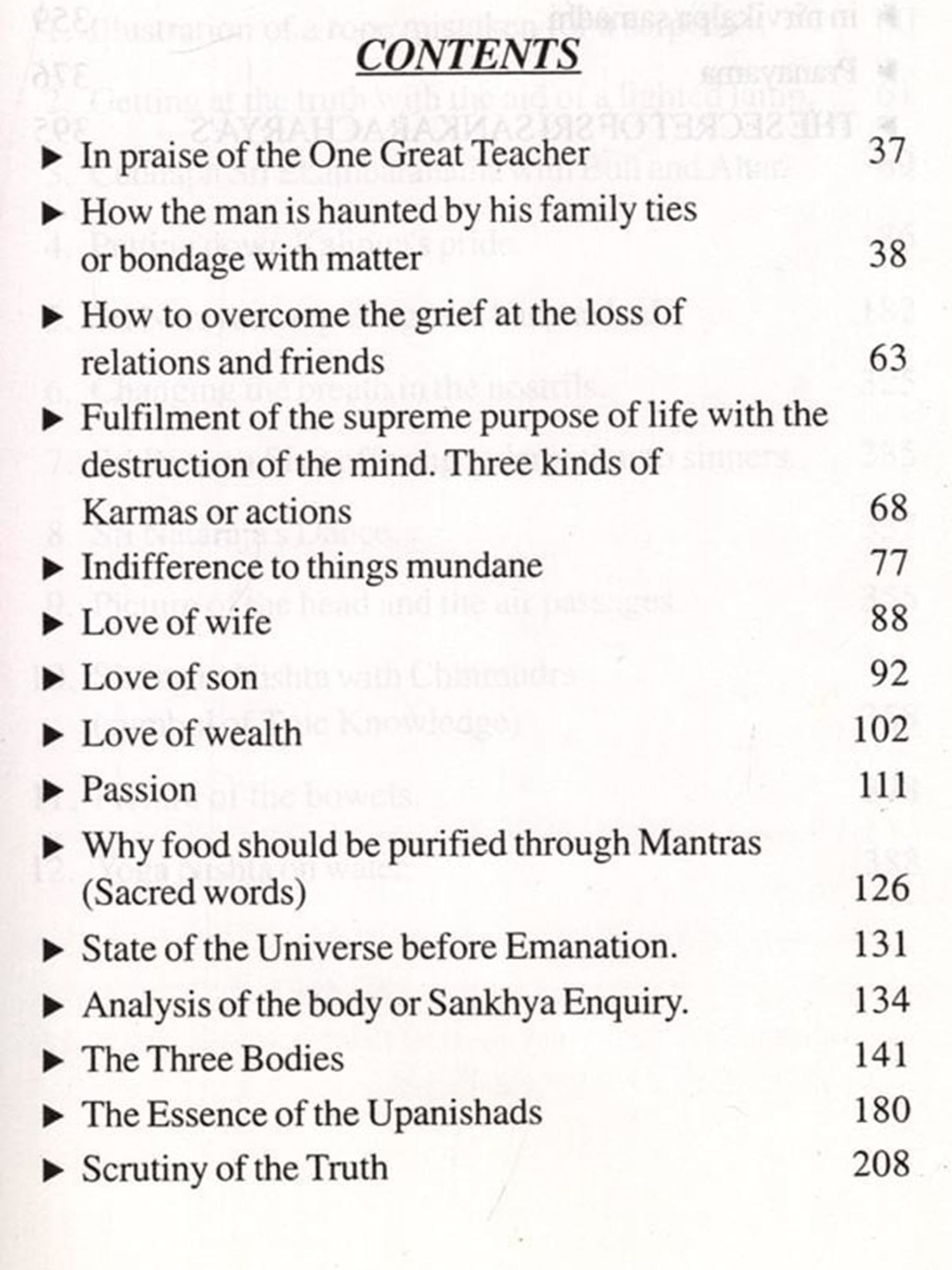 Through this valuable book, he has laid open to the world at large how man is haunted by numerous and various bonds on earth, how to fulfil the supreme purpose of life with the destruction of the mind, what the state of the universe was before Evolution and what our body truly is with all its attachments. In a short but clear way he has explained in a few chapters the three-fold bodies of man, the combination of the five elements and the composition of the gross body and the inner senses, the three qualities, the different states of consciousness and then the quint-essence of the teachings of the Upanishads. Next, he has explained most lucidly at great length the real meaning of 'caste'. Thus, many-sided in its excellence, this book is easily understandable by all men and women, even by an average boy or girl and contains apt, numerous and valuable quotations from most of the Upanishads, Puranas, Ithihasas etc., including that most rare and precious of the priceless teachings of the Great Hindu EPIC-the Sri Bhagavad Gita.
