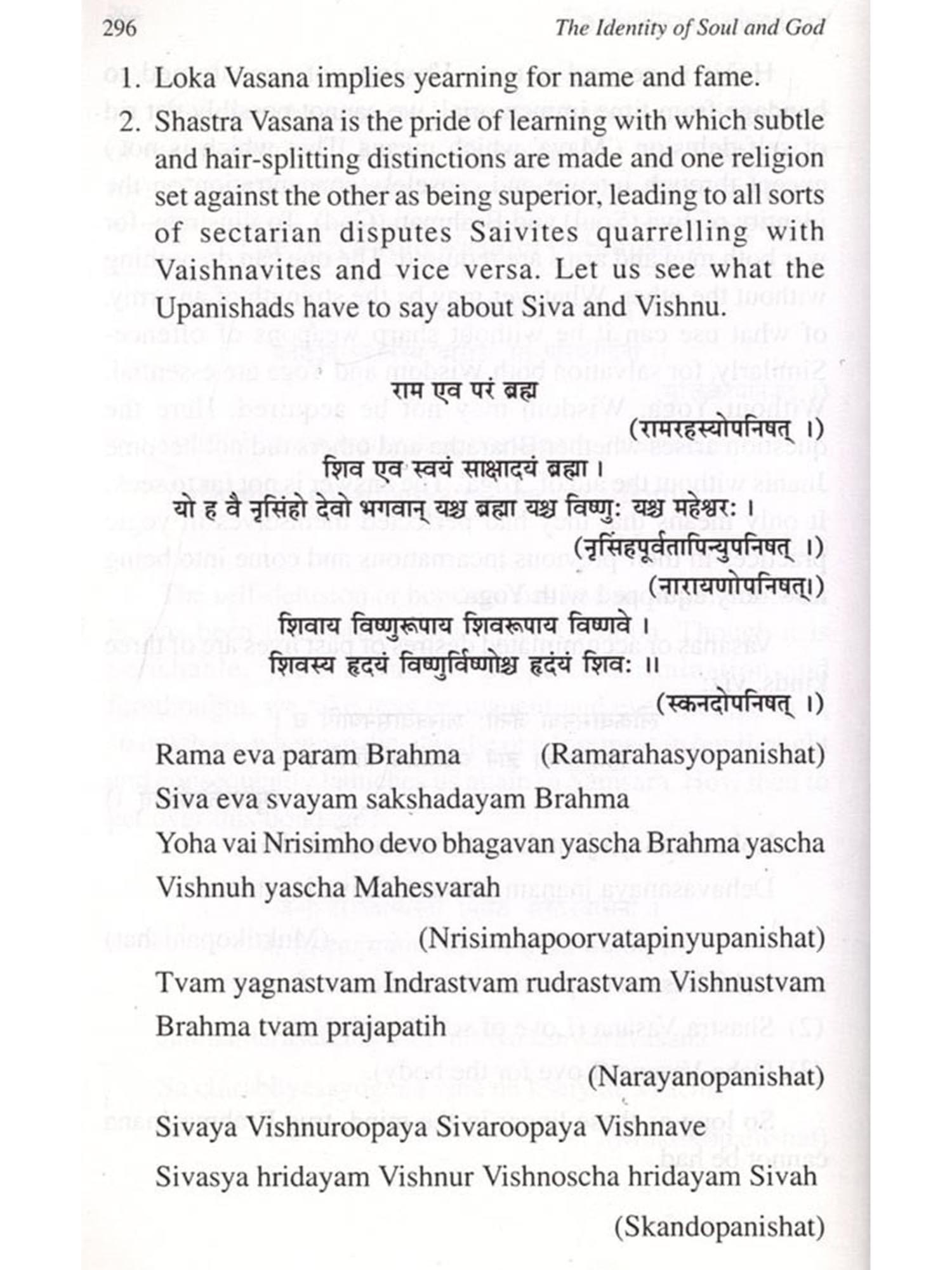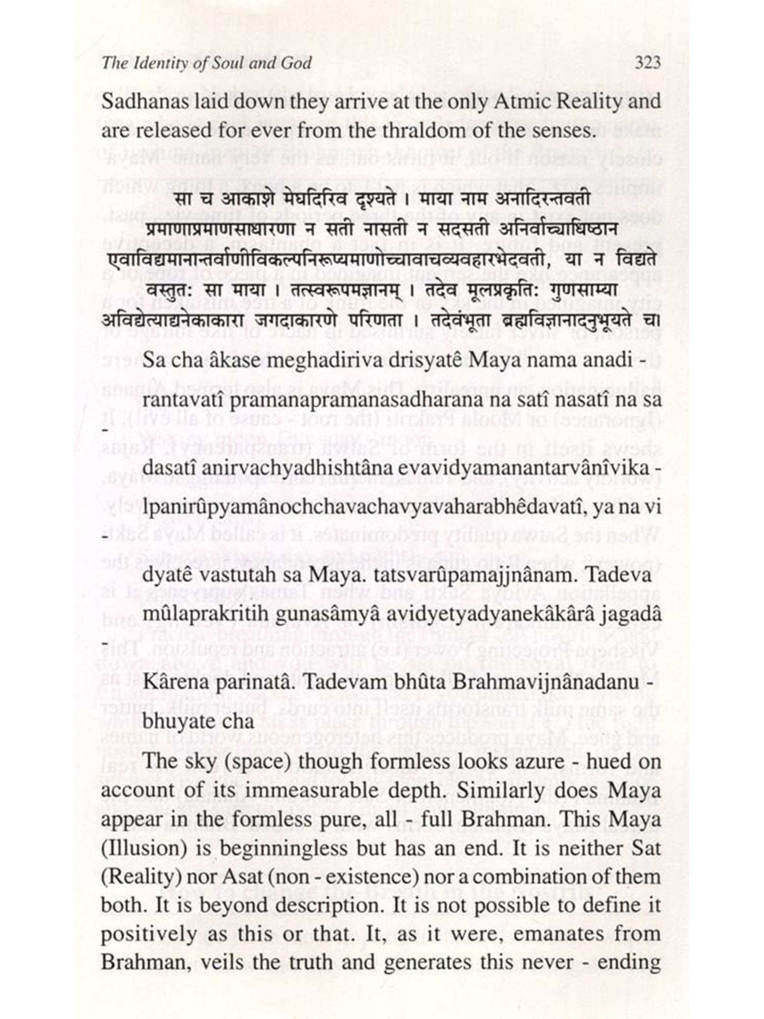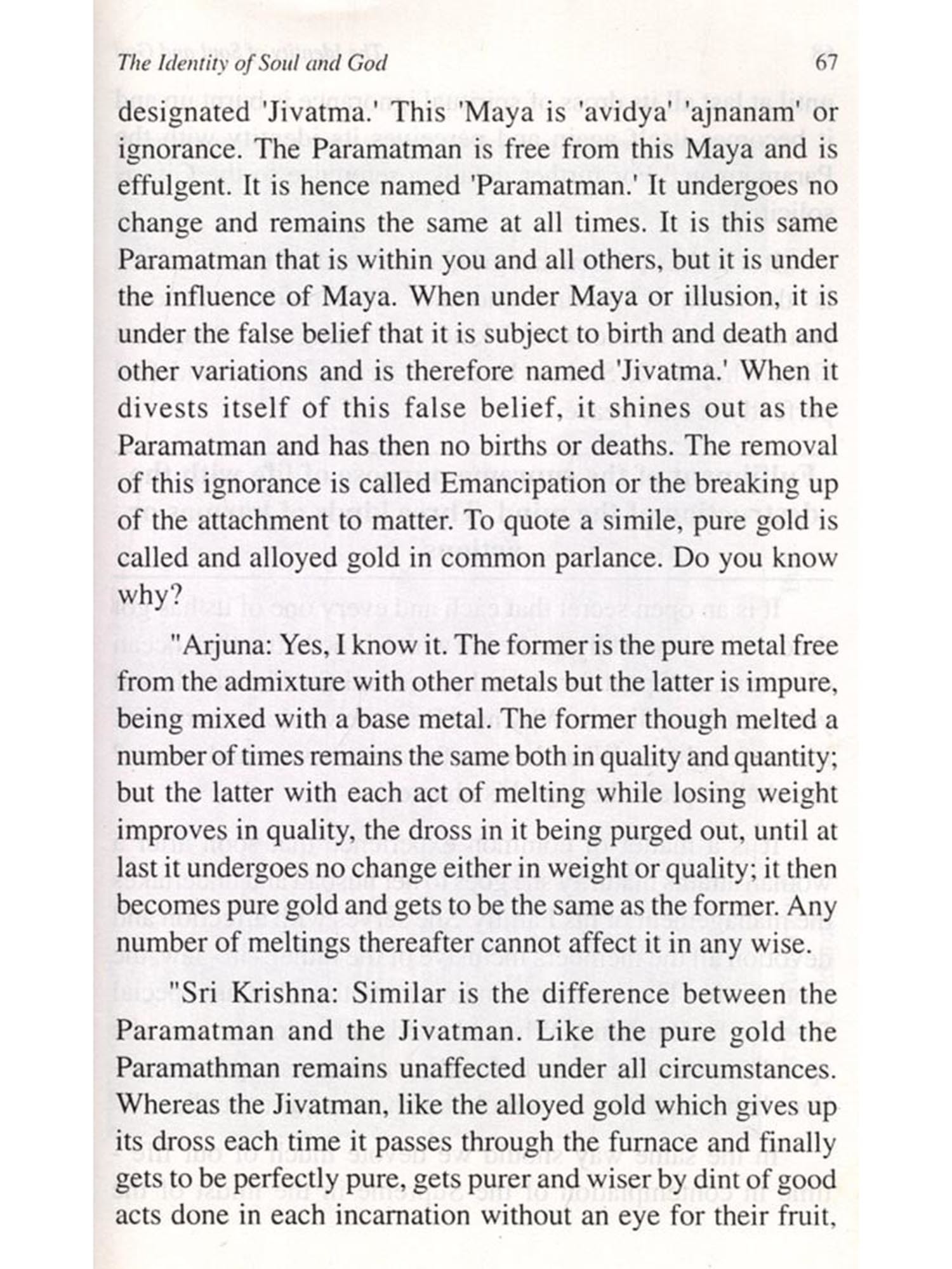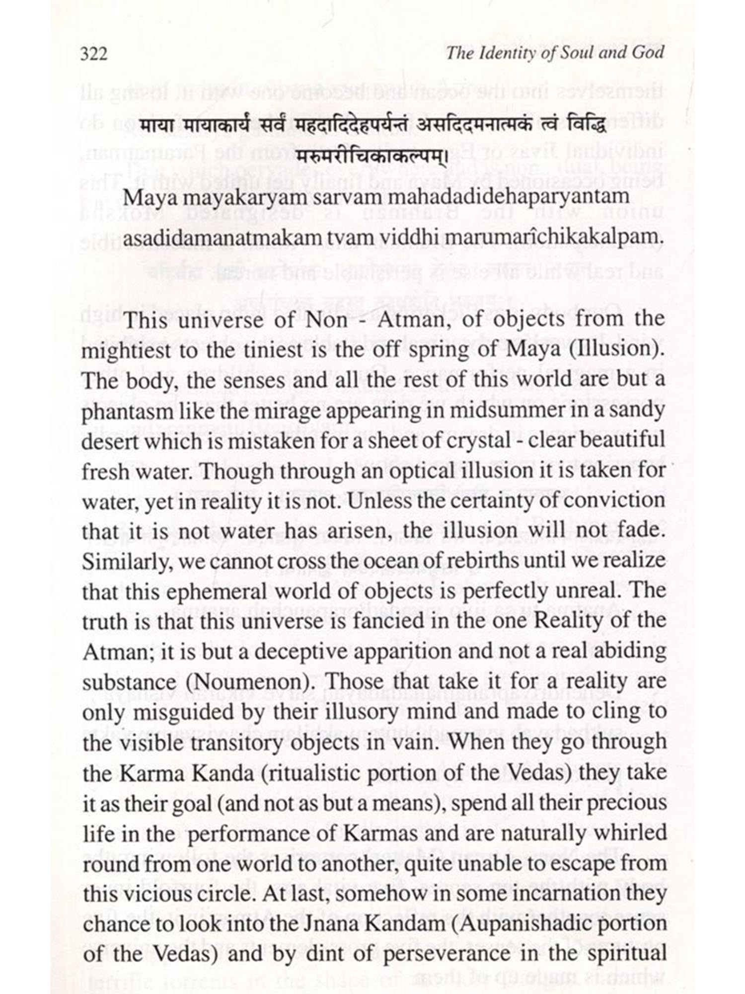It is usual to localise the position of the crescent moon with reference to the branch of a tree and that of Arundhati Devi, the ideal of chastitiy and wife of Sri Vasishtha, with reference to the stars in the constellation called the 'Big Bear'; so, does this 'Identity of Soul and God the secret of the Vedanta' point to the Brahma the Subtlest of the subtle. Ignorant of the identity of the immortal personal Soul and Para Brahman (the Universal Soul) and mistaking the ephemeral body which is a compound of the five elements for the eternal principle, people do acts of merit and sin and to enjoy the fruits thereof take births ad infinitum in various sorts of wombs and undergo all sorts of pleasure and pain. No one can extricate himself from this endless cycle of births and deaths until he realises that "he and Brahman are one."Deluded by Maya (nescience) all men and women in the world fall into the bottomless abyss of Samsara and suffer from the diseases of avarice and Lust, not knowing how to attain Eternal Bliss which they always yearn for. They may well he compared to the foolish elephant which for the sake of a few blades of grass falls into the khedda (ditch) and is captivated for ever.