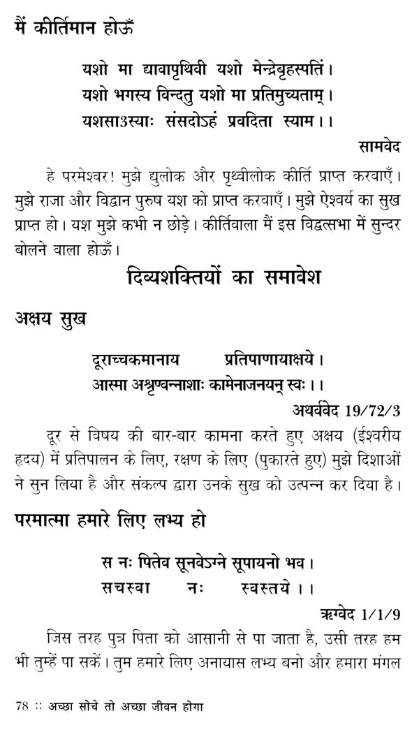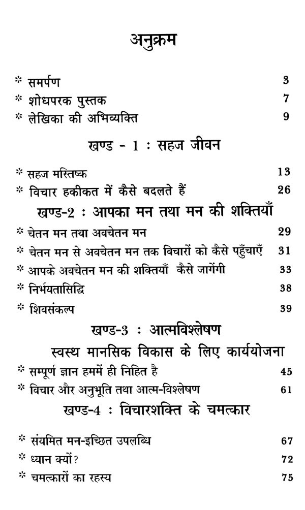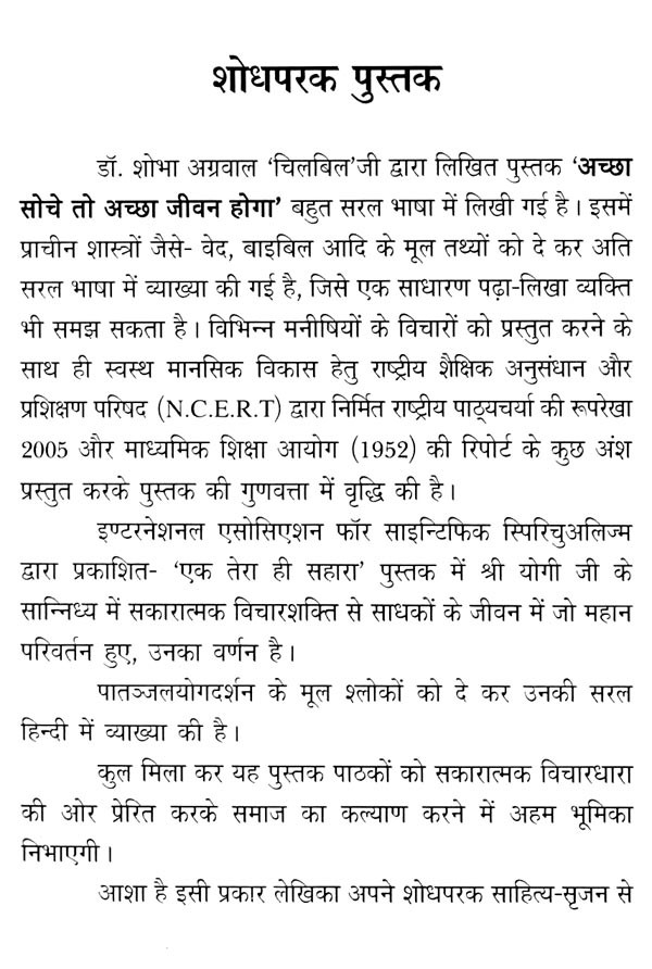 पुस्तक में वेदों के आधारभूत मन्त्रों को सरल भाषा में प्रस्तुत किया गया है। इसमे प्राचीन शास्त्रों जैसे- गीता, बाइबिल व उपनिषदों आदि के भी उद्धरण दिए गए हैं, जिसे एक साधारण पढ़ा-लिखा व्यक्ति भी समझ सकता है। विभिन्न मनीषियों के विचारों को प्रस्तुत करने के साथ ही राष्ट्रीय शैक्षिक अनुसंधान और प्रशिक्षण परिषद (N.C.E.R.T) द्वारा निर्मित राष्ट्रीय पाठ्यचर्या की रूपरेखा के सन्दर्भों को वर्णित करके बच्चों के सहज व स्वस्थ मानसिक विकास के लिए कार्यायोजना भी दी गई है। पातञ्जलयोगदर्शन के मूल श्लोकों को देकर उनकी सरल हिन्दी में व्याख्या भी दी गई है। मन का प्रभाव मनुष्य की हर गतिविधि पर पड़ता है। सम और विषम दोनों ही परिस्थितियों में मन को कैसे प्रसन्न रखा जाए, इस सम्बंध में विभिन्न शास्त्रों और मनीषियों के चिन्तन को प्रस्तुत किया गया है। यह पुस्तक पाठकों को सकारात्मक विचारधारा की ओर प्रेरित करके समाज का कल्याण करने में अहम भूमिका निभाएगी, ऐसा विश्वास है।