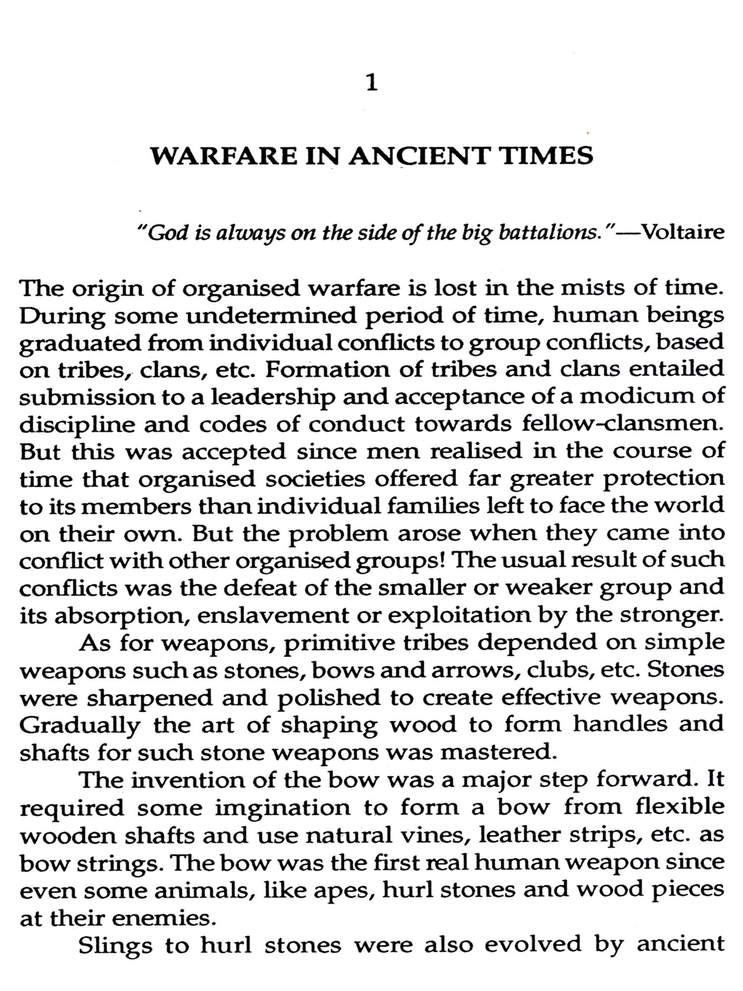 Warfare, though a constant feature of human history, has been strongly affected by various powerful forces un-leashed in the course of time. The development of agriculture led to a large increase in human population due to greater food availability and hence to larger armies. Strong ideological forces like religion and nationalism strengthened the motivation and endurance of fighting groups. The latest and the most powerful force to act on warfare has been the application of science and technology to this field.
