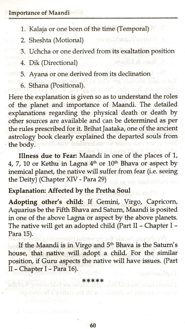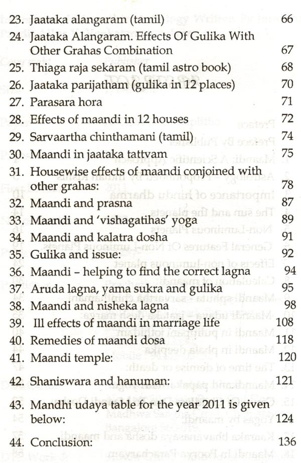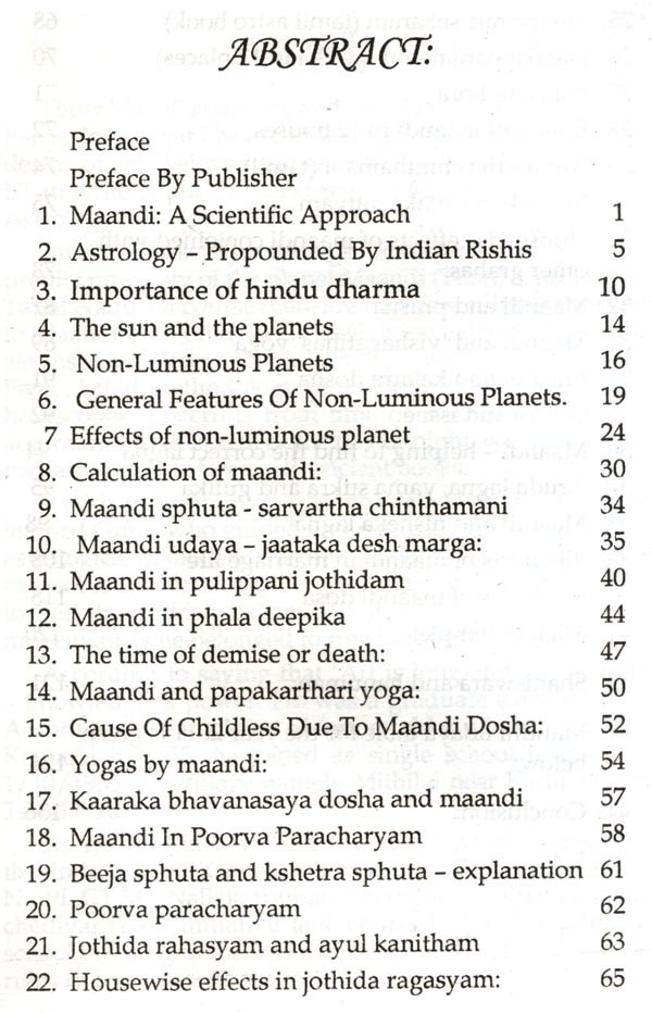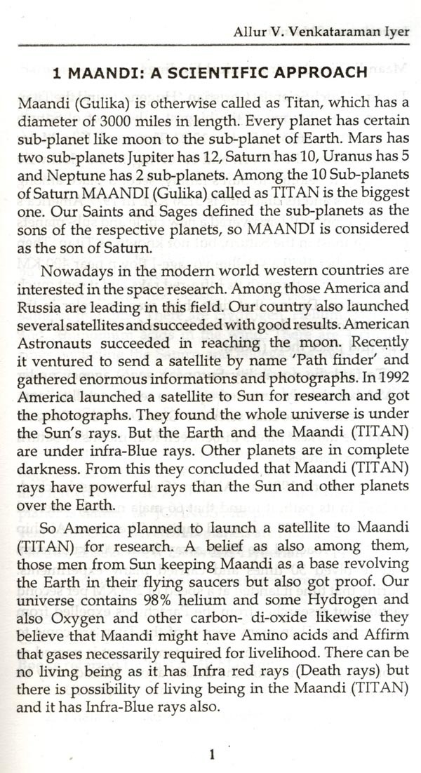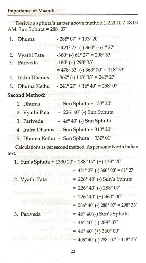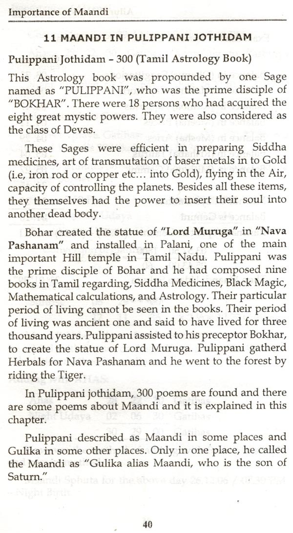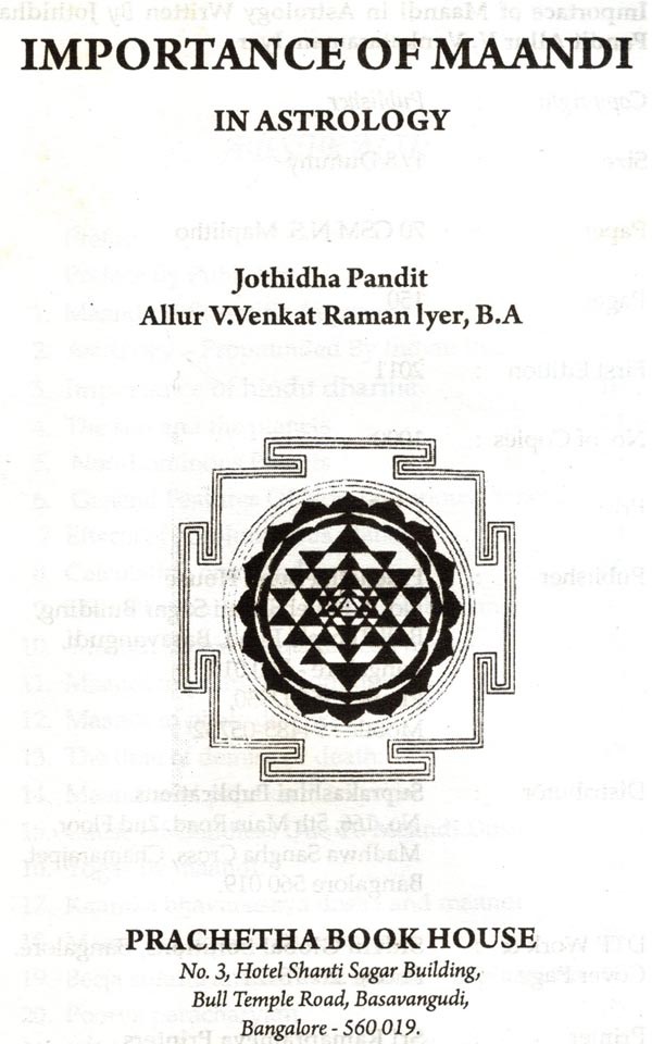 After his retirement he devoted his valuable time for the people who approached regarding astrology, casting and matching of horoscopes to their fullest satisfaction as he had already gained experience in that field by his fore-fathers hereditary from childhood. I have given elaborate illustrations about the opinions rendered by the eminent people in the astrological field from the basic and authen-ticated books for enlightenment of the readers as well as to the astrologers to determine the placement of Maandi to the lucidity and predict the results accordingly.