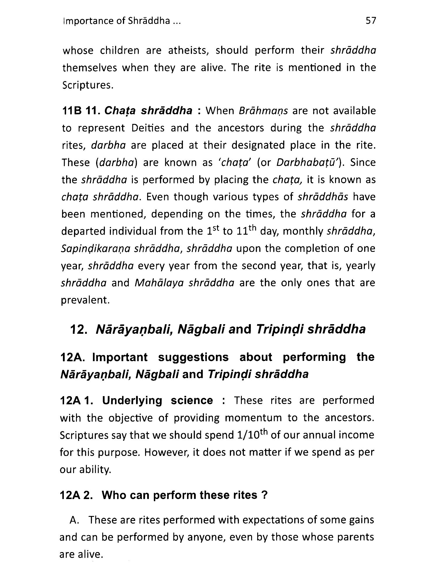 Bharatiya culture says that, just as we serve our parents and close relatives when they are alive as part of abiding by our Dharma, we have certain duties unto them after their death. The shraddha rites provide us with an excellent opportunity to fulfil these duties and repay our debts unto the pitars. The snreootie rites are necessary so that the journey after death of our parents, . who have taken our utmost care during our childhood, becomes comfortable and without any distress, and that they acquire sadgati (Momentum for moving to the next higher region). If snreoane is not performed, the desires of the pitars (Deceased ancestors) remain unfulfilled. Negative energies make easy victims of such desire-riddled pitars and then, enslave them. In all likelihood, they then use them to cause distress to their own family members. By performing shredtibe, we get relieved from the distress caused by the otters, and our life on earth becomes comfortable. If shraddha is performed on a particular day, titht (Date as per the Hindu lunar almanac) and as per the position of the lunar asterisms, then, apart from the duty unto the pitars getting fulfilled, some specific benefit can also be obtained. Through such aspects, the importance and benefits of performing snrsddtie have been elaborated in this Holy text.