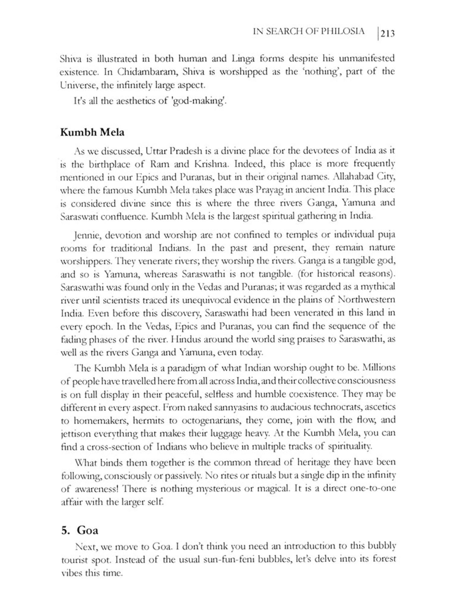 On one hand, I noticed that when talking about spirituality in India, we tend to trip over the branded forms-Yoga and Tantra, which are mistranslated as 'exercises' and 'sex' (or sometimes an extended Ayurvedic massage) respectively in the tourism market. On the other hand, apart from this mistranslated commercial disposition, I could find an undercurrent of spirituality running through almost all cosmopolitan lives. It remains an obsession or a continuing tradition within, around and beyond the hullabaloo of rituals, pilgrimages, god concepts, temples or religion because it doesn't ask anyone to run away from the material world. I met scores of people who were completely involved in the pleasures of the world while leading a spiritual life. I could also make out that this is the one thing that unites 'the manyness of reality', which is India. Every cultural festival ends up being a display of its expressive spectrum of which 'entertainment' and 'enlightenment' makes the two ends.