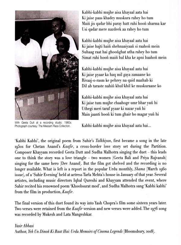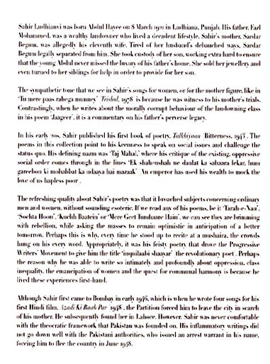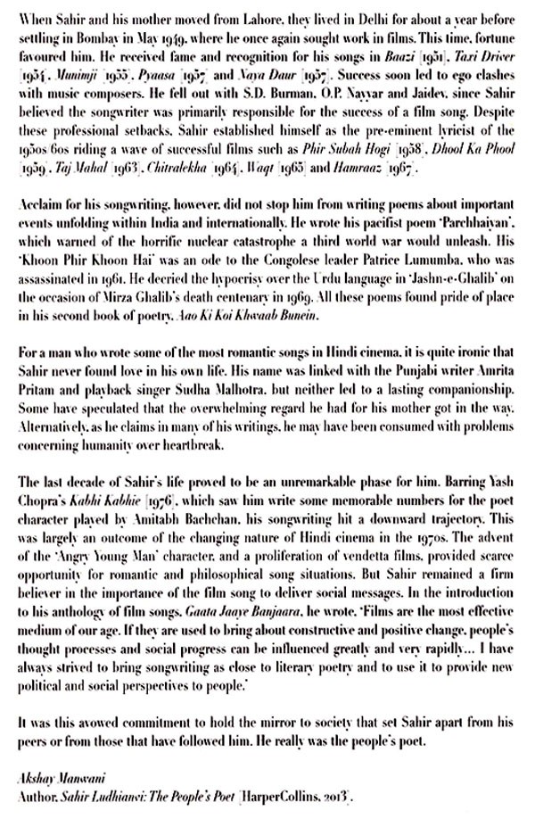 The refreshing quality about Sahir's poetry was that iubroached subjects concerning ordinary men and women without sounding esoteric. If we read any of his poems, be it Tarah-e-Tau’, ‘Sochta Hoon, Kuchh Baatein or Were Geet Tumhaare Hain. we can see they are brimming with rebellion, while asking the masses to remain optimistic in anticipation of a better tomorrow. Perhaps this is why every time he stood up to recite at a mushaira, the crowds hung on his every word. Appropriately, it was his feisty poetry that drove the Progressive Writers' Movement to give him the title inquilaabi shaavar the revolutionary poet. Perhaps the reason why he was able to write so intimately and profoundly about oppression, class inequality, the emancipation of women and the quest for communal harmony is because he lived these experiences first-hand.