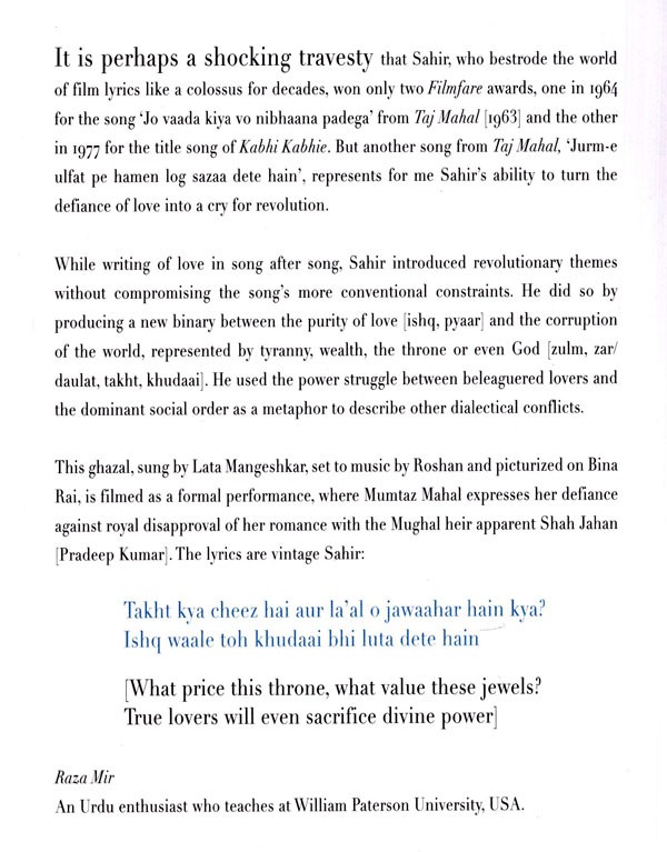 In his early 20s. Sahir published his first book of poetry. Talkhiyaan Bitterness. 190. The poems in this collection point to his keenness to speak on social issues and challenge the status quo. His defining nazm was 'Taj Mahal, where his critique of the existing. oppressive social order comes through in the lines 'Ek shahenshah ne daulat ka sahaara lekar. hum gareebon ki mohabbat ka udaaya hai mazaak' In emperor has used his wealth to mock the love of us hapless poor.