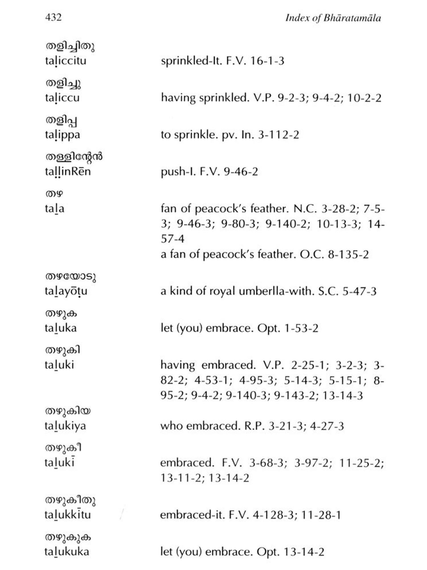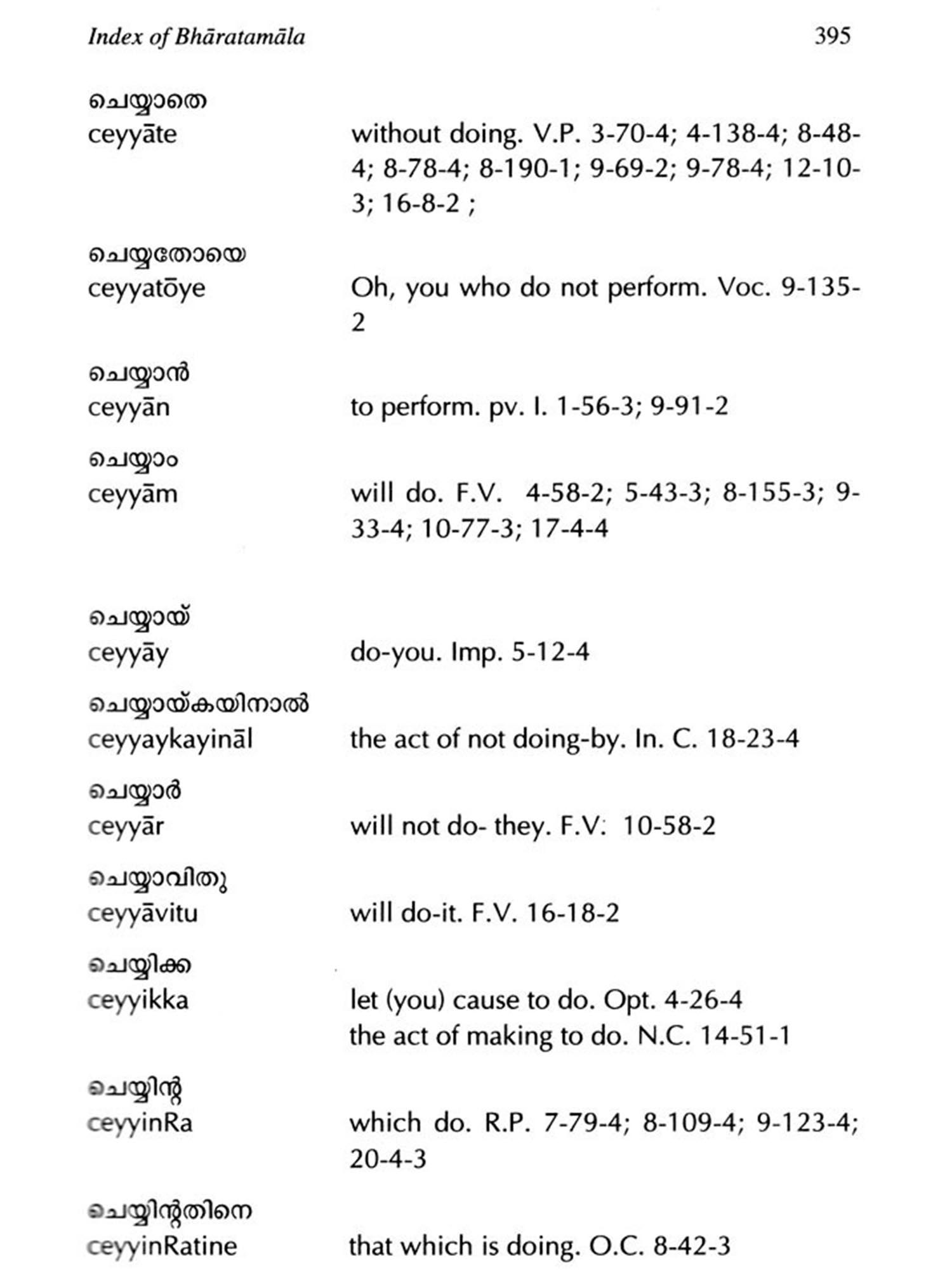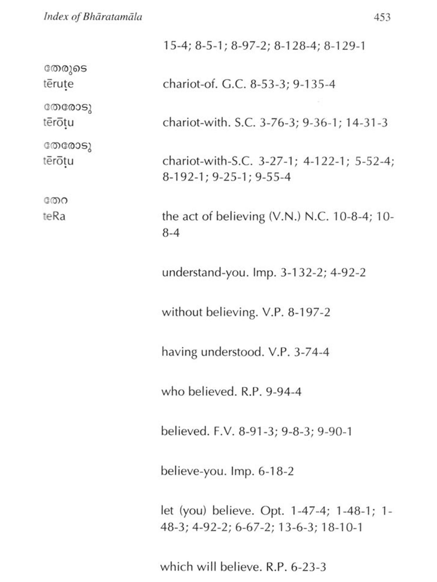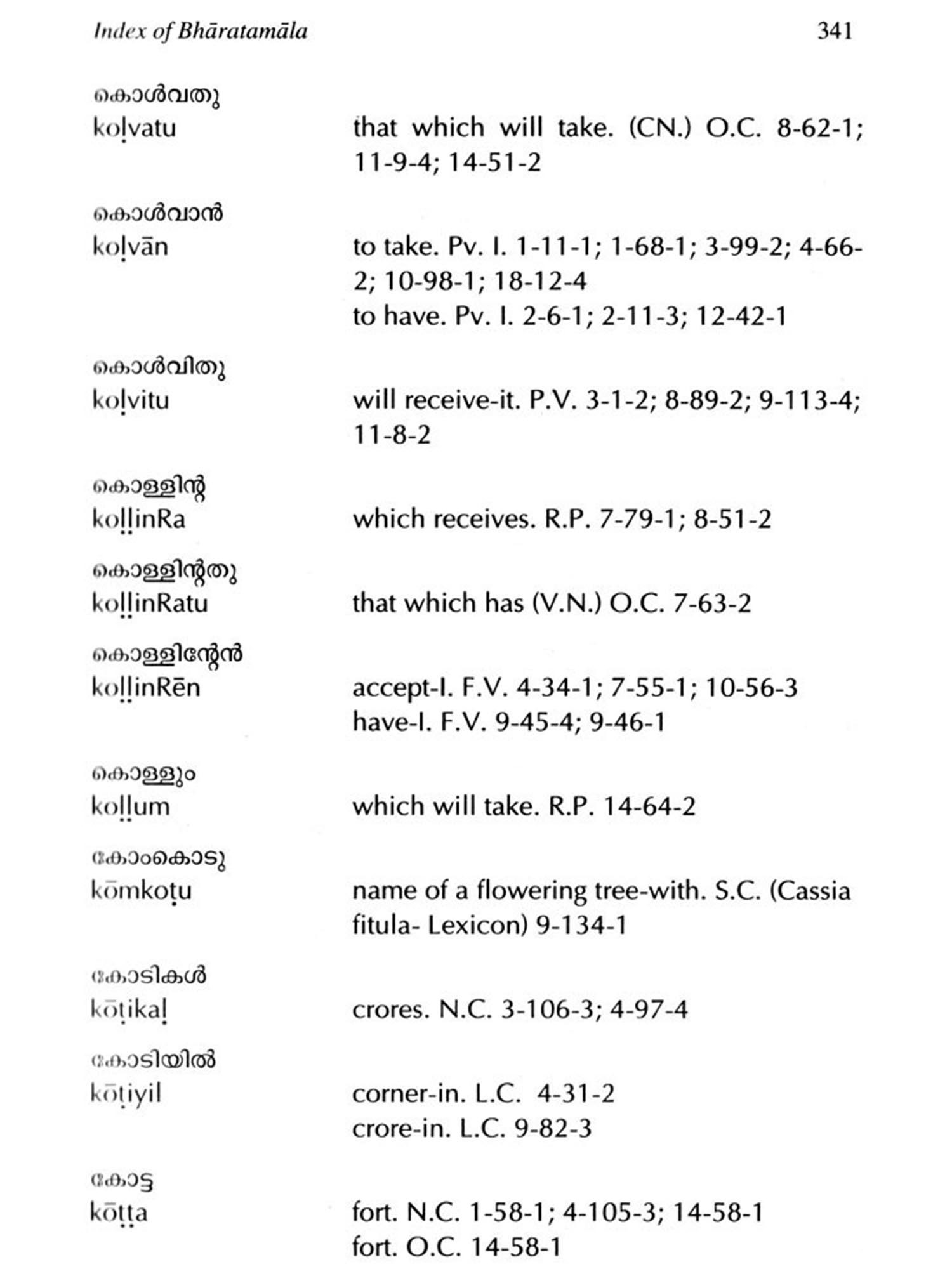 The language of Bharatamala is highly influenced by Sanskrit in all levels except syntax viz., phonological, morphological and lexical. Nouns borrowed from Sanskrit are in abundance and also one can see a good number of nativized Sanskrit verbs in this work. This publication of ISDL, I hope, is a valuable asset for those who are engaged in the studies on the history of Malayalam Language and Literature.