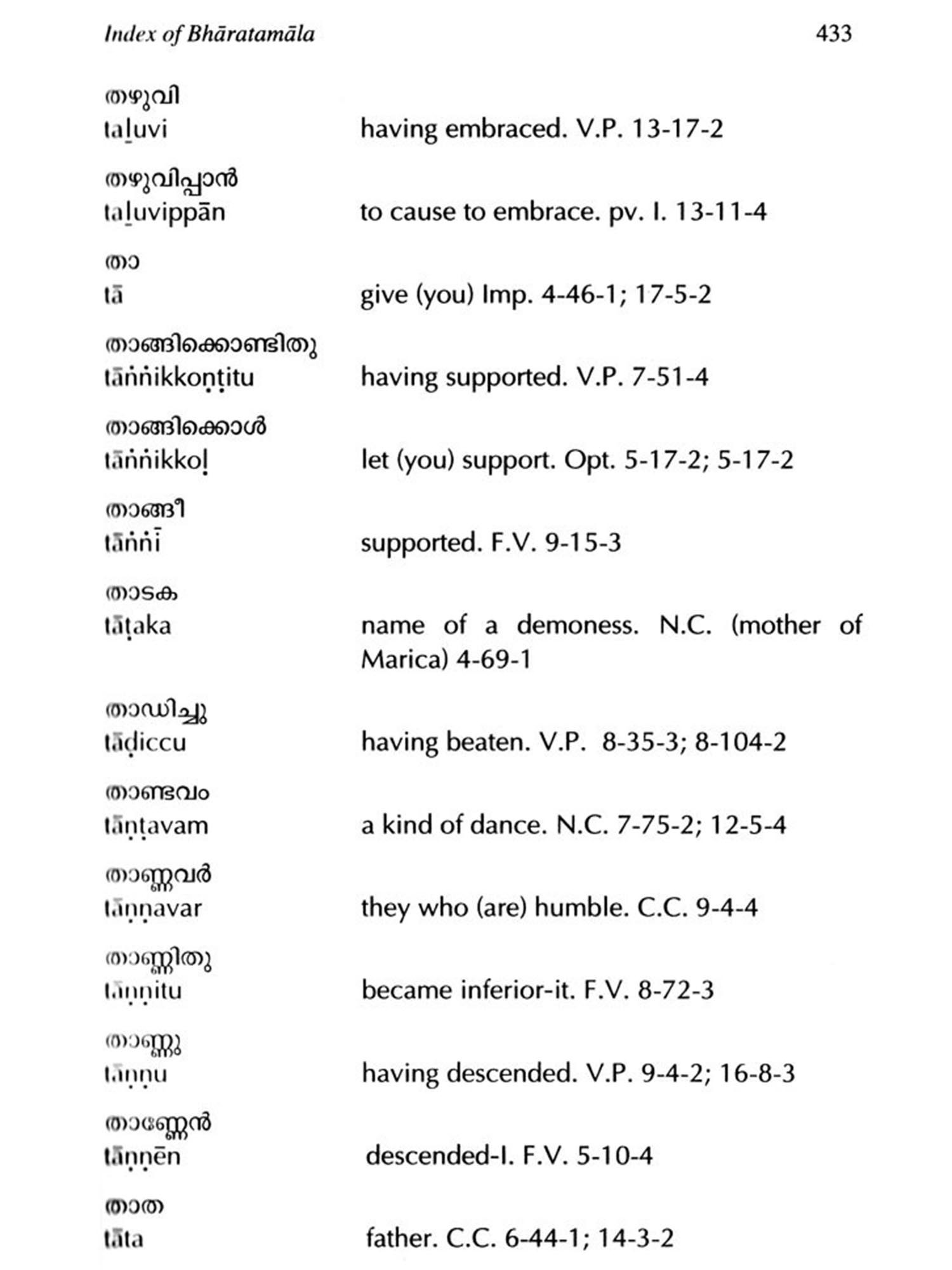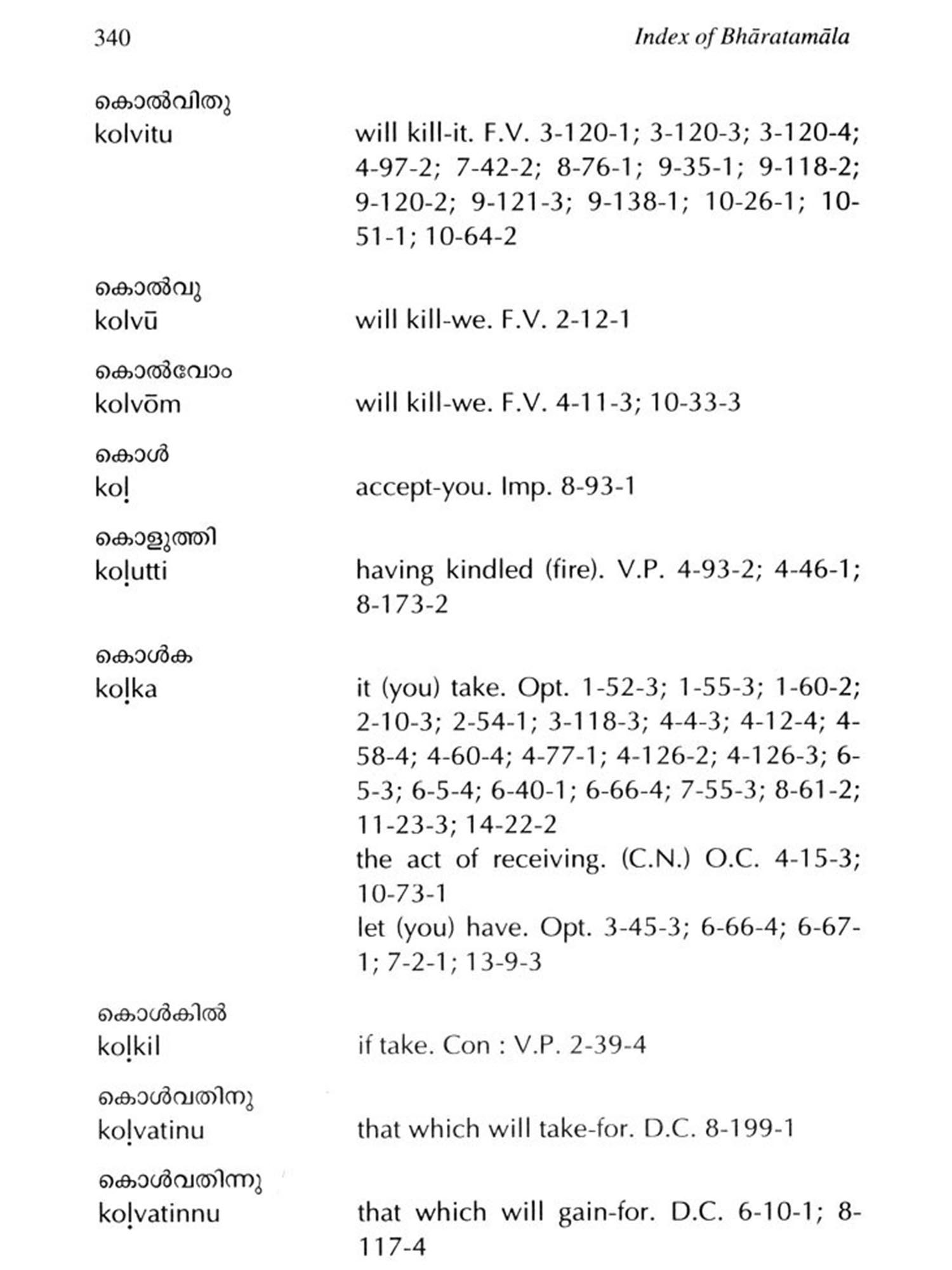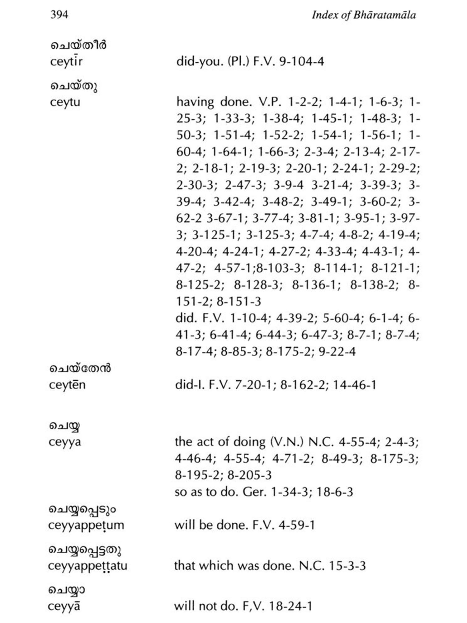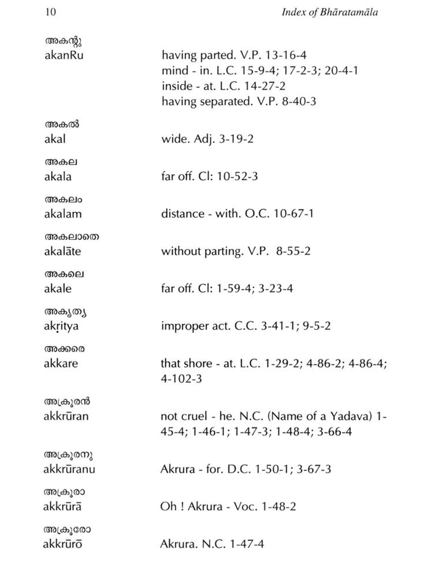The language of Bharatamala is highly influenced by Sanskrit in all levels except syntax viz., phonological, morphological and lexical. Nouns borrowed from Sanskrit are in abundance and also one can see a good number of nativized Sanskrit verbs in this work. This publication of ISDL, I hope, is a valuable asset for those who are engaged in the studies on the history of Malayalam Language and Literature.