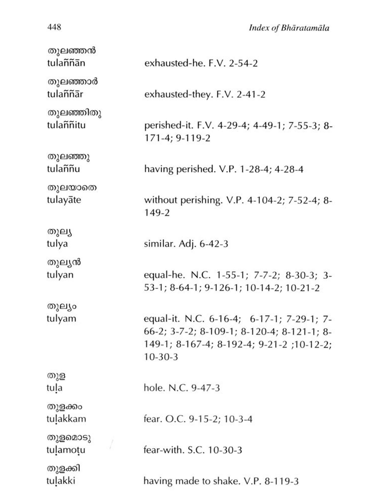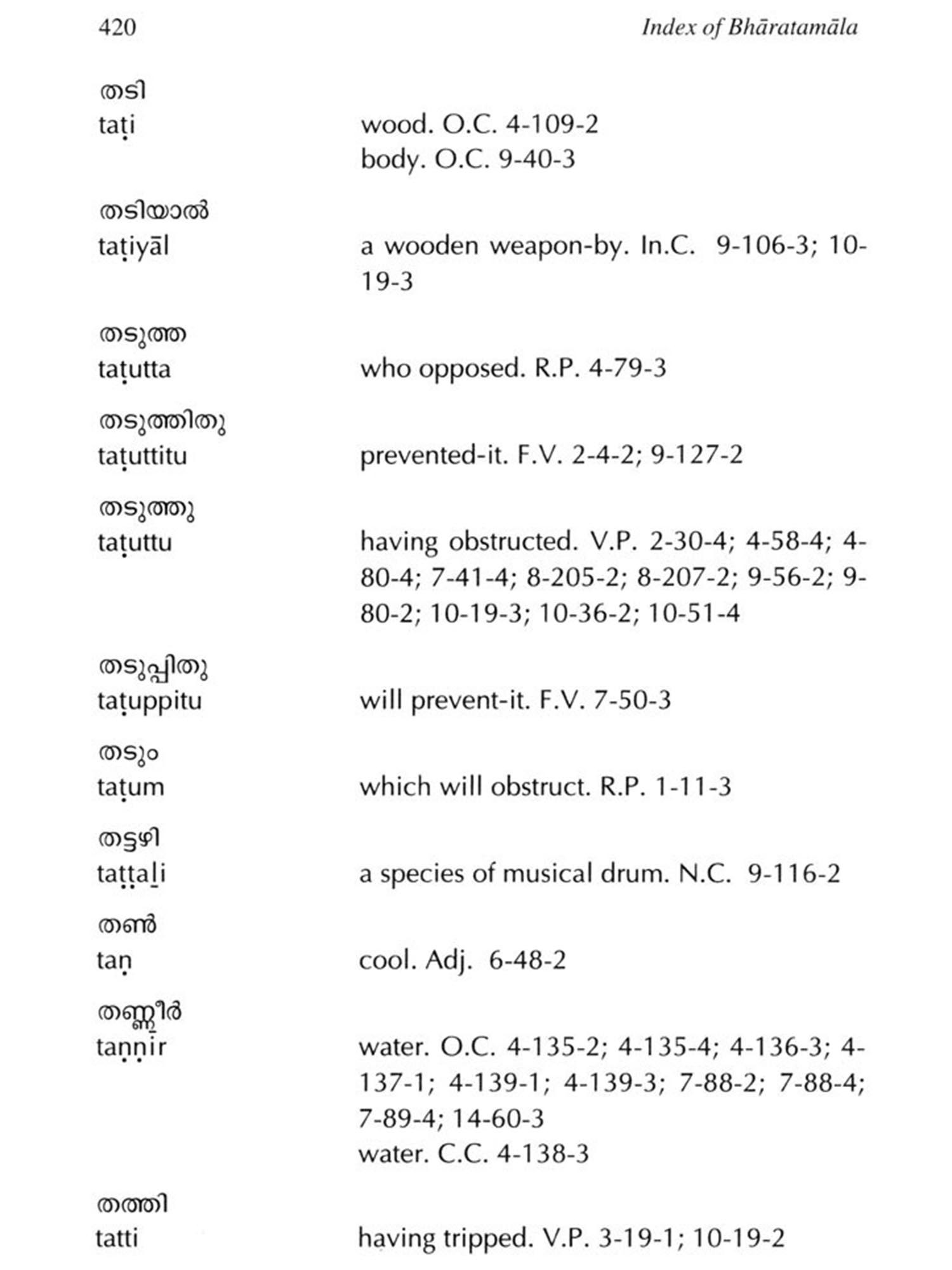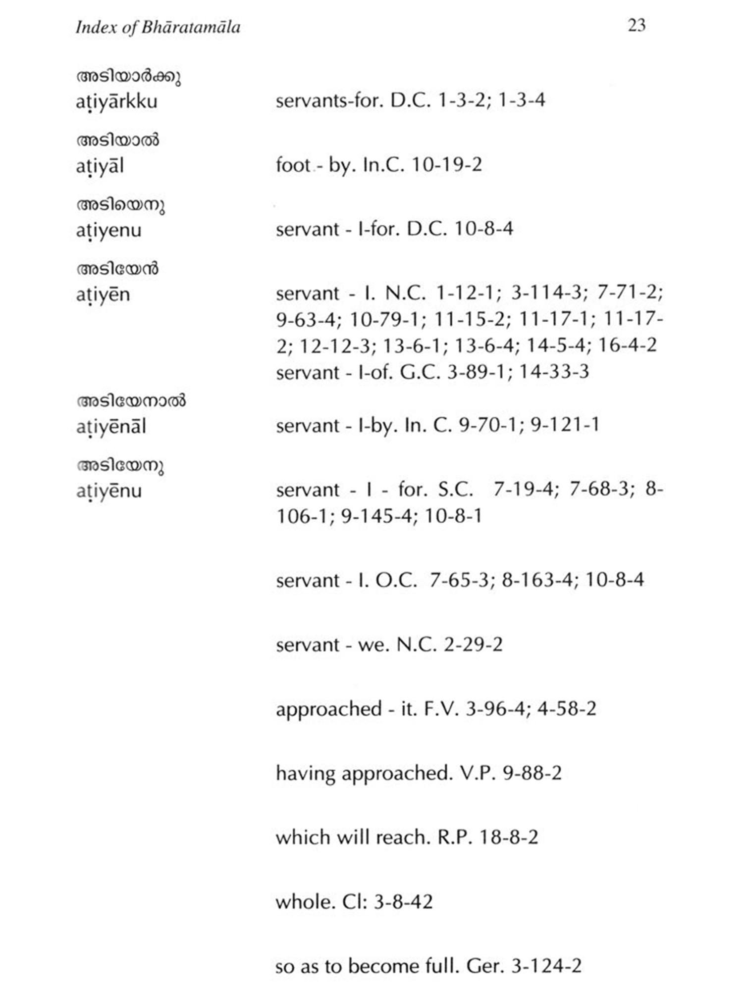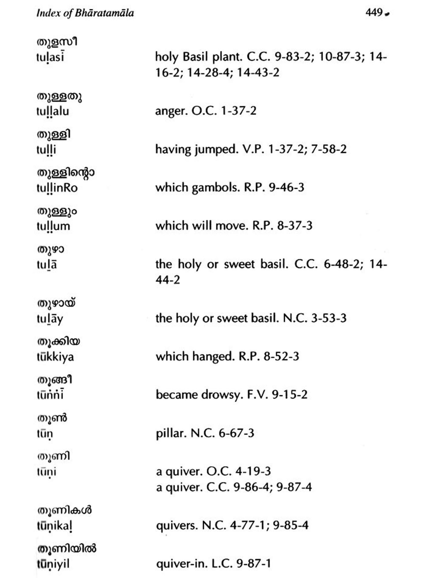 The language of Bharatamala is highly influenced by Sanskrit in all levels except syntax viz., phonological, morphological and lexical. Nouns borrowed from Sanskrit are in abundance and also one can see a good number of nativized Sanskrit verbs in this work. This publication of ISDL, I hope, is a valuable asset for those who are engaged in the studies on the history of Malayalam Language and Literature.