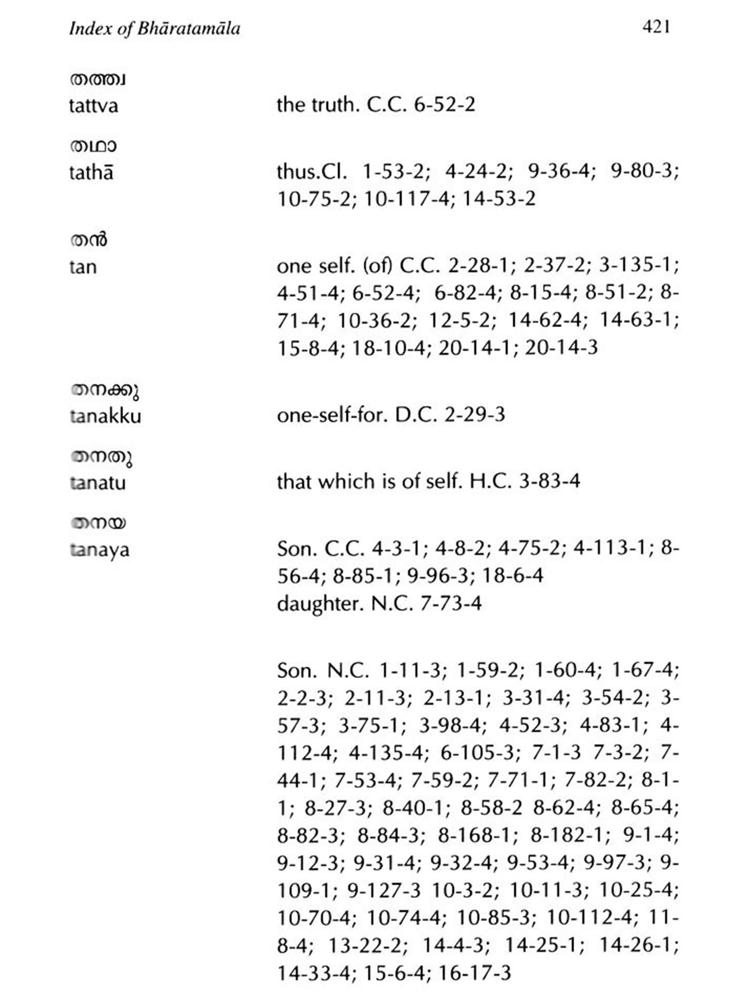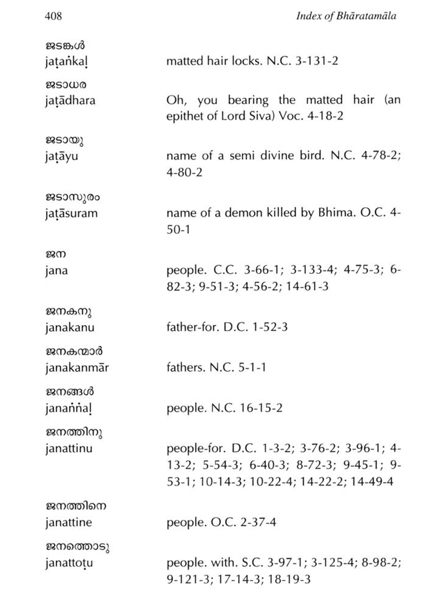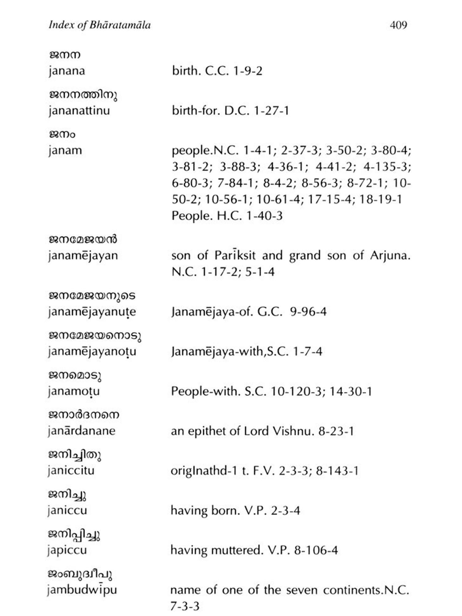 Sankaran the author of Bharatamala is believed to be one among the Niranam trio in the history of Middle Malayalam literature. Sankaran, otherwise known as Vellangaloor Sankaran, is the first poet who translated Mahabharatam into Malayalam. Even though this text is a translation of the Sanskrit epic, it shows the characteristics of an original work. Dr. R. Saraswathy Kutty Amma alias Ponnara Saraswathy, prepared the Index of Bharatamala which dates back to 1400-1437 A.D. as part of her dissertation on 'Descriptive Grammar of Bharatamala' in 1992. The available earliest manuscript goes to 1437 C.E. (612 M.E.). ISDL has a plan to compile relevant materials for the preparation of a historical grammar and early Middle Malayalam lexicon. As part of it, ISDL has decided to publish the indices of all ancient Malayalam classics. The present publication is a partial fulfillment of that aim.