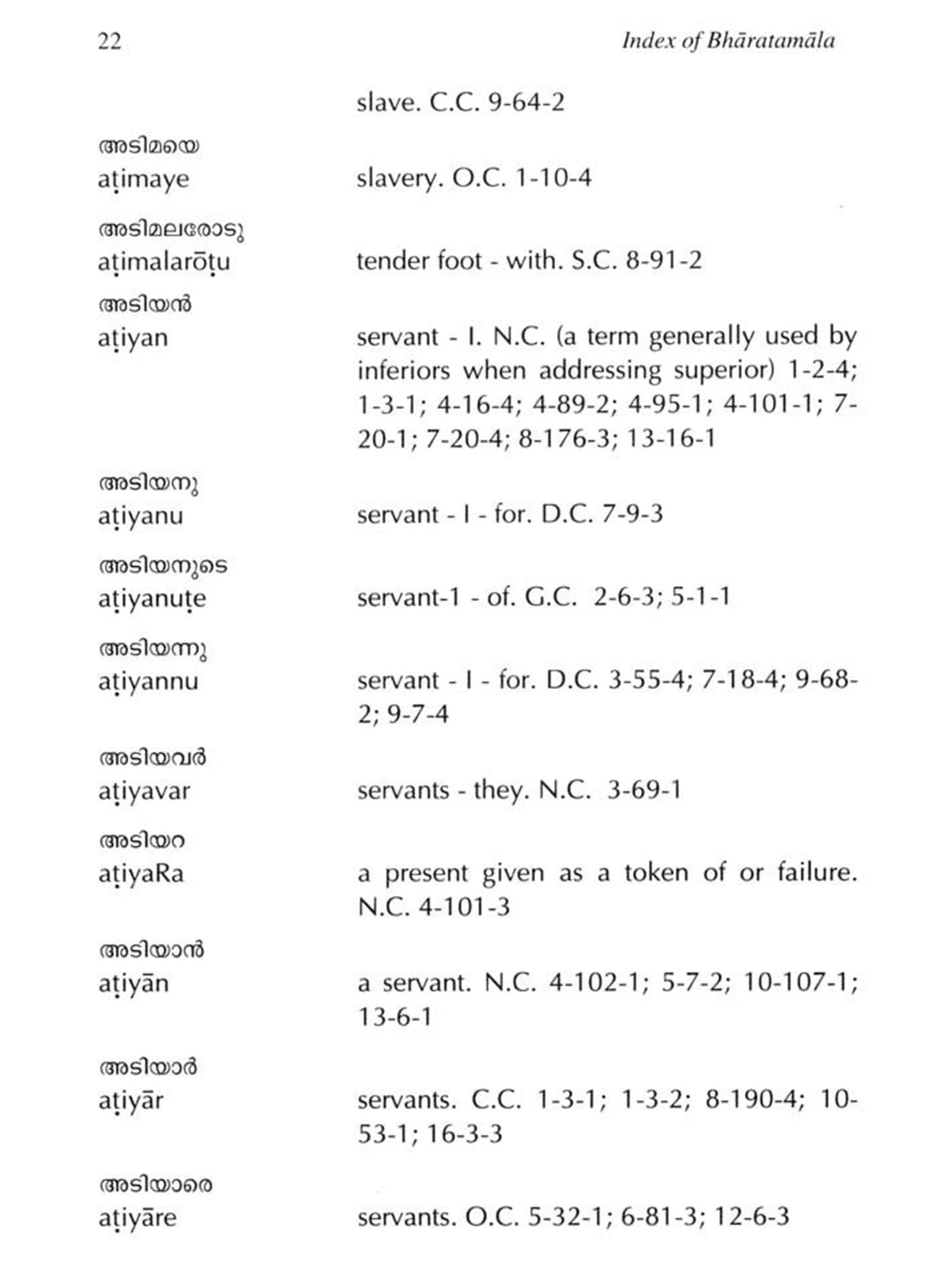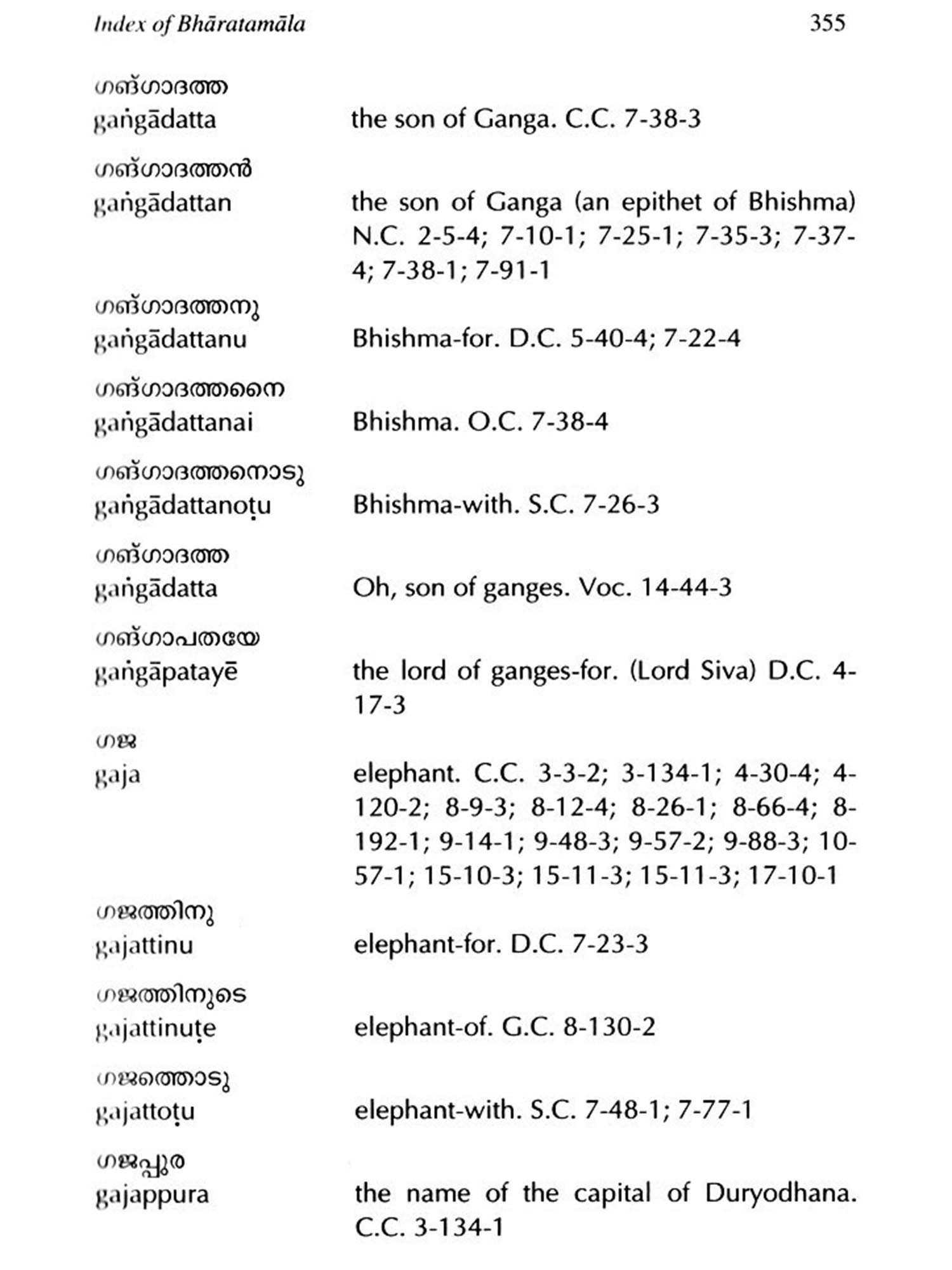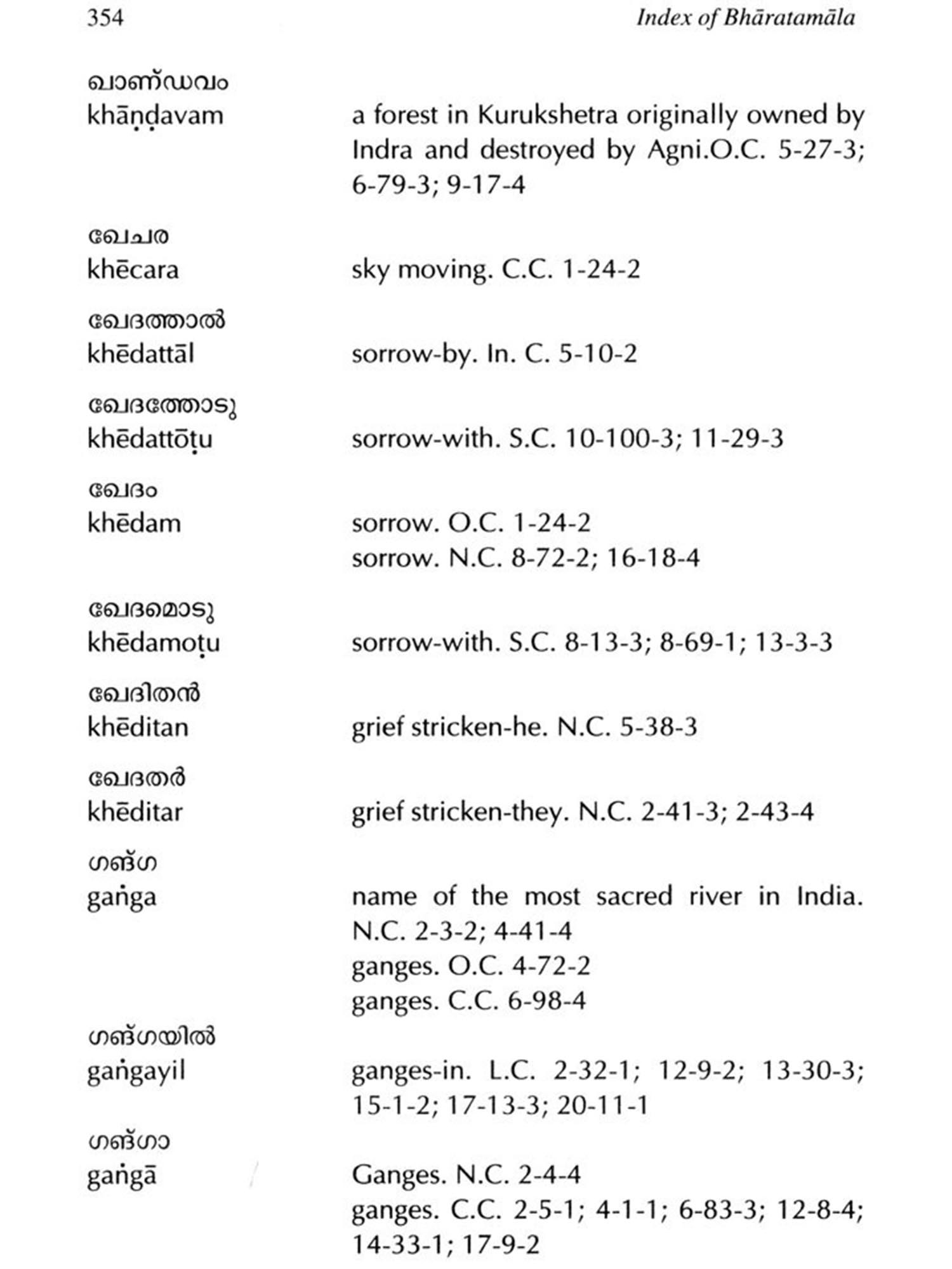 Sankaran the author of Bharatamala is believed to be one among the Niranam trio in the history of Middle Malayalam literature. Sankaran, otherwise known as Vellangaloor Sankaran, is the first poet who translated Mahabharatam into Malayalam. Even though this text is a translation of the Sanskrit epic, it shows the characteristics of an original work. Dr. R. Saraswathy Kutty Amma alias Ponnara Saraswathy, prepared the Index of Bharatamala which dates back to 1400-1437 A.D. as part of her dissertation on 'Descriptive Grammar of Bharatamala' in 1992. The available earliest manuscript goes to 1437 C.E. (612 M.E.). ISDL has a plan to compile relevant materials for the preparation of a historical grammar and early Middle Malayalam lexicon. As part of it, ISDL has decided to publish the indices of all ancient Malayalam classics. The present publication is a partial fulfillment of that aim.