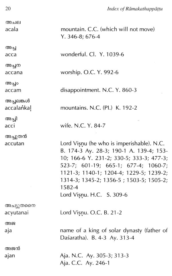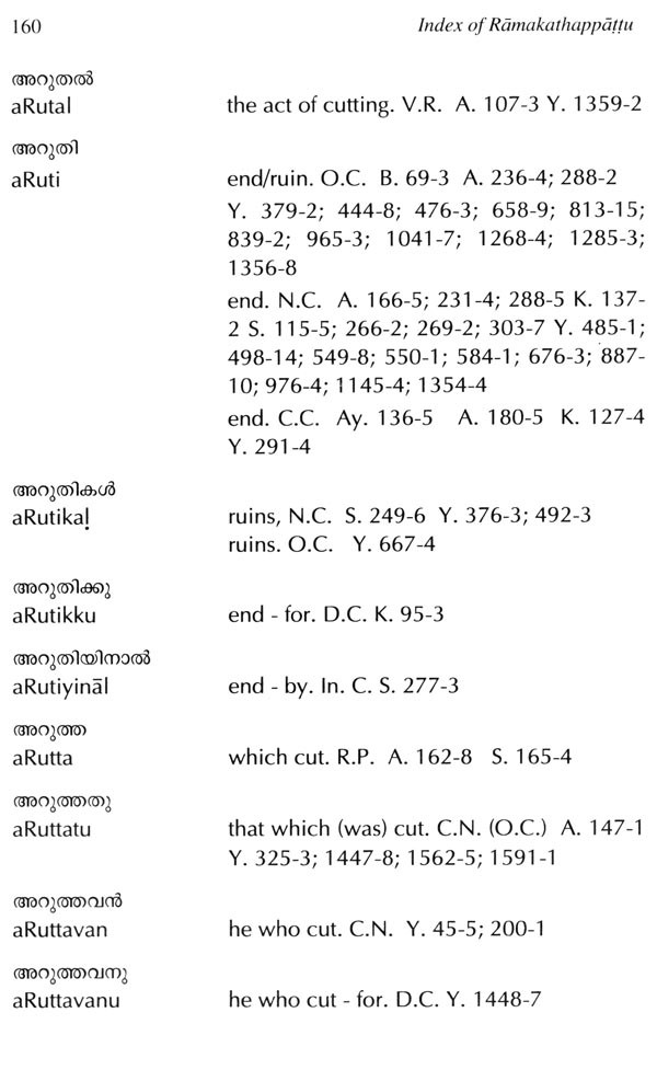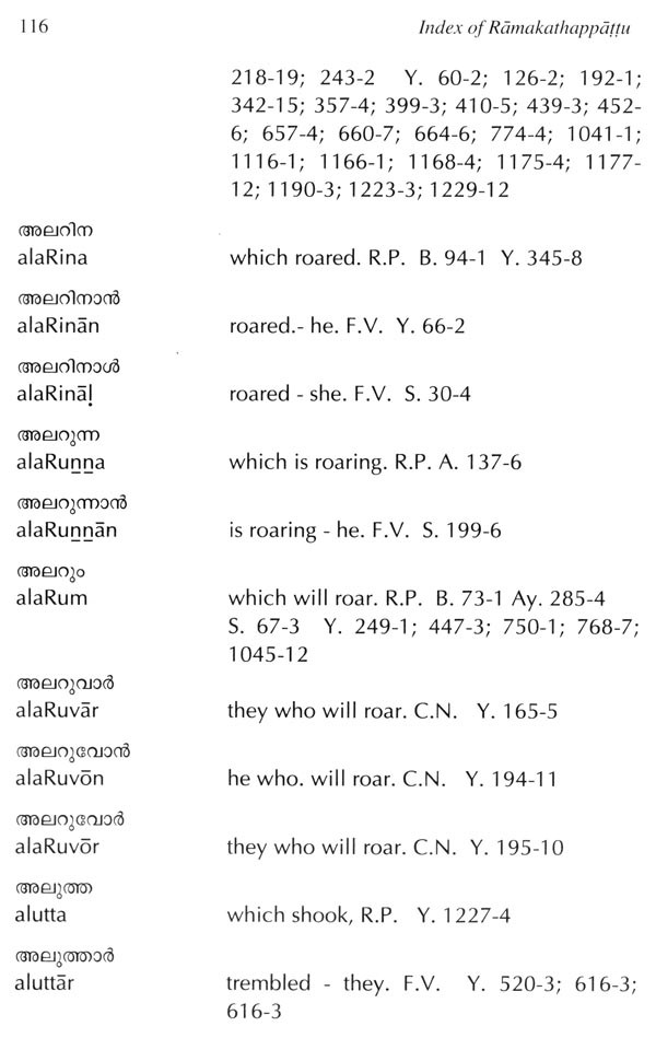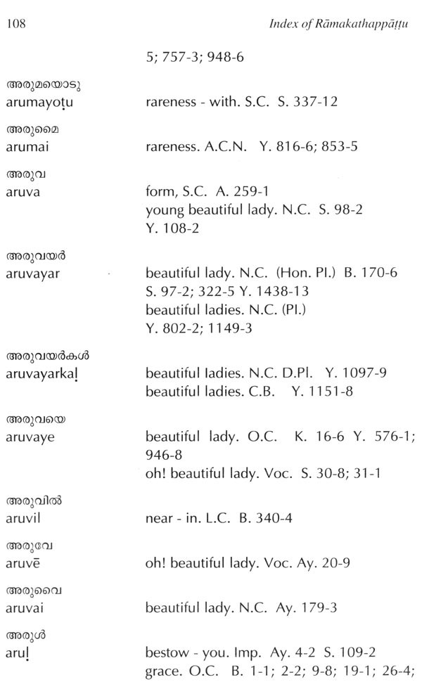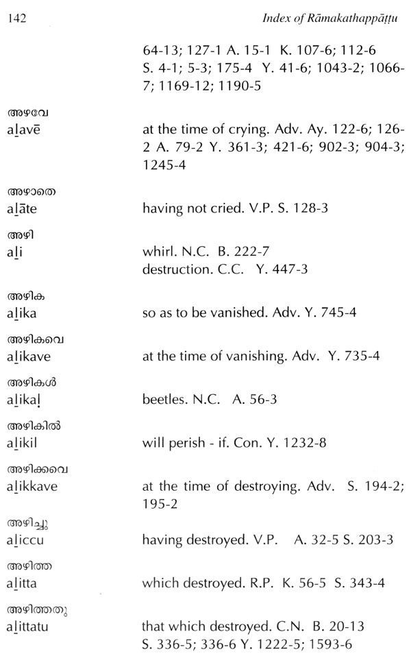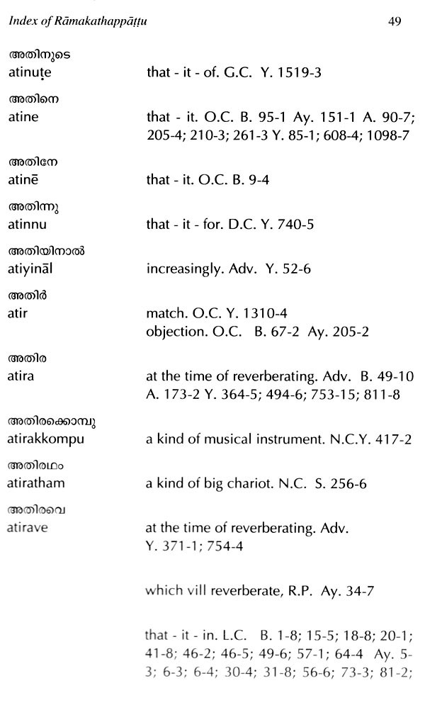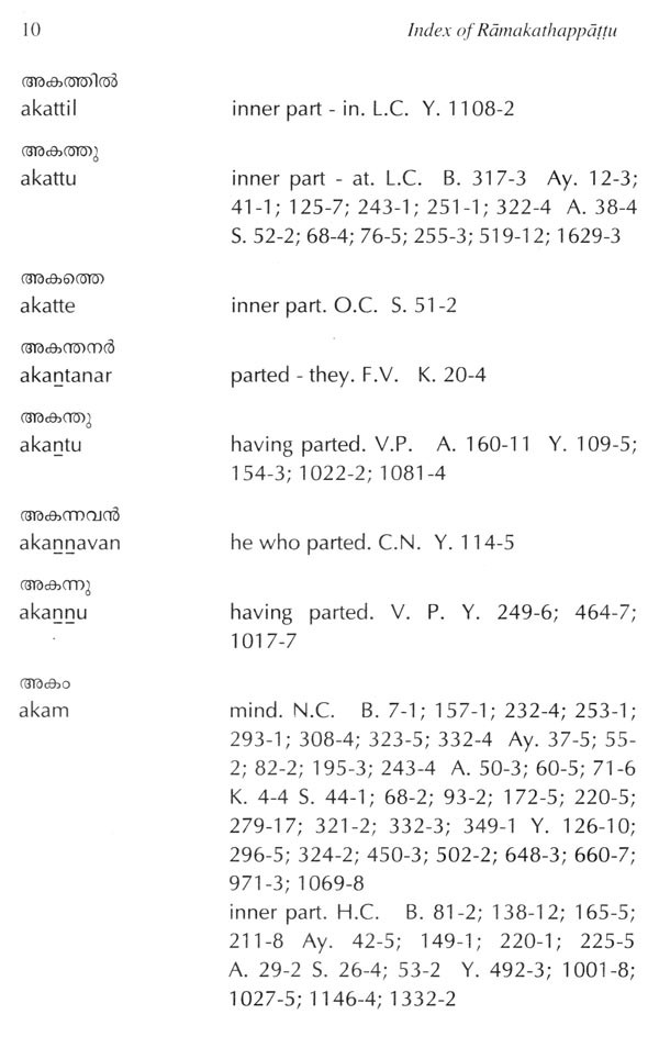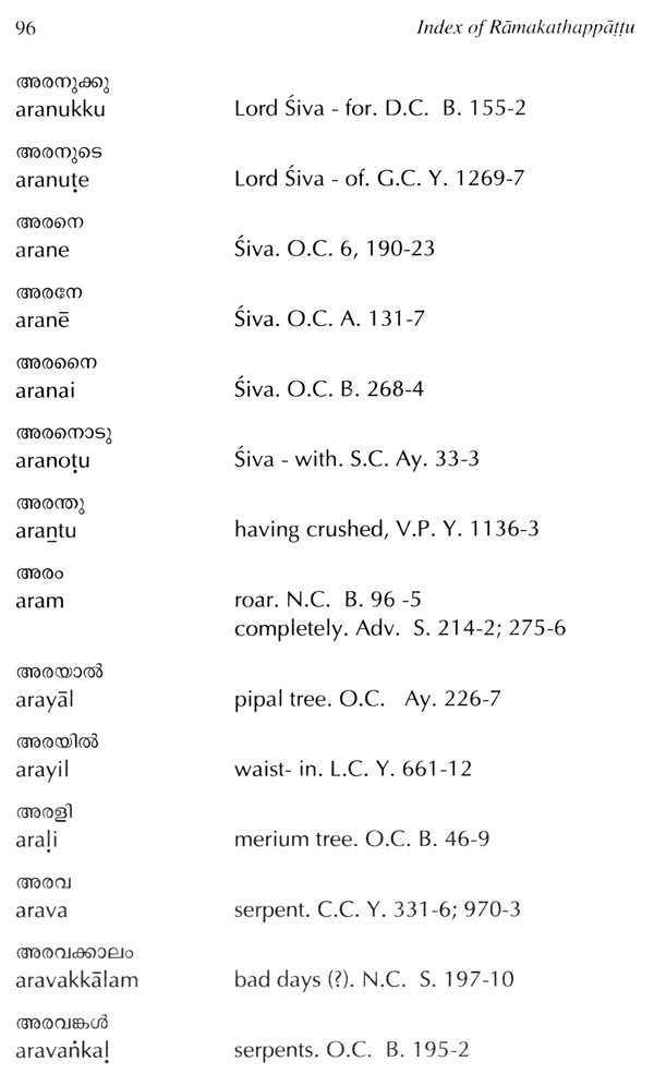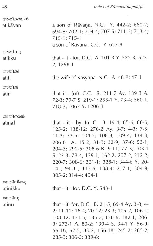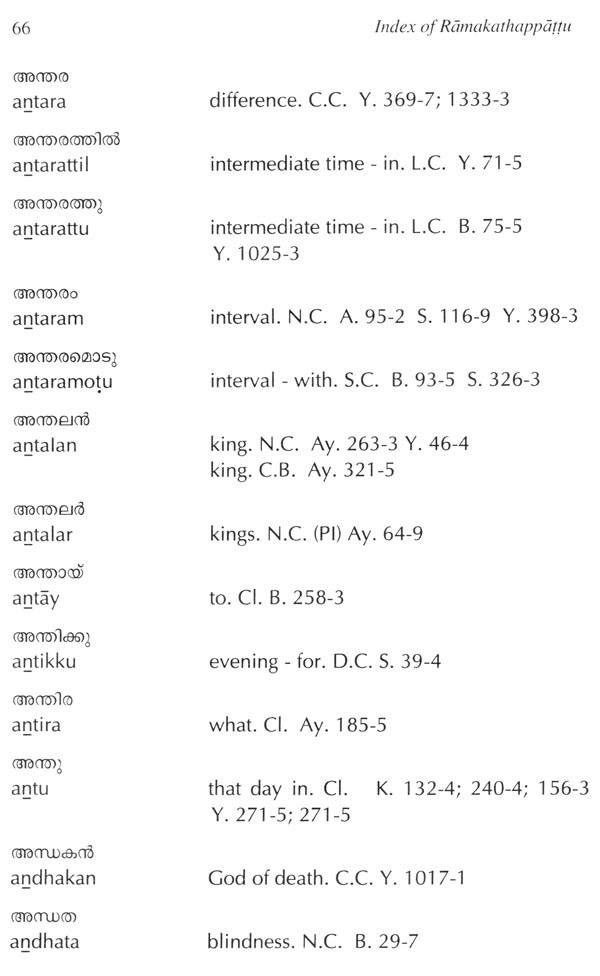 The Index published here is the second part of the Ph.D. dissertation titled 'A Linguistic Study on Ramakathappattu submitted to the University of Kerala by Smt. G. Sulekha, Professor (Rtd.), T.K.M. Art's College, Karikodu, Kollam in 1977. Linguistically the language used in Ramakathappattu exhibits the dialectal features of a southern bilingual area in the erstwhile princely state of Travancore. The present work due to its bilingual features and having a history of about six centuries is quite significant from the linguistic point of view which prompted the ISDL to publish this grammatical index of Ramakathappattu. The source of this index is Ramakathappattu published by Dr. P.K. Narayana Pillai in two volumes in 1970. In the composition of this song the poet Ayyippiļļa asan followed Valmiki Ramayana by and large.