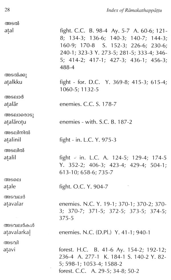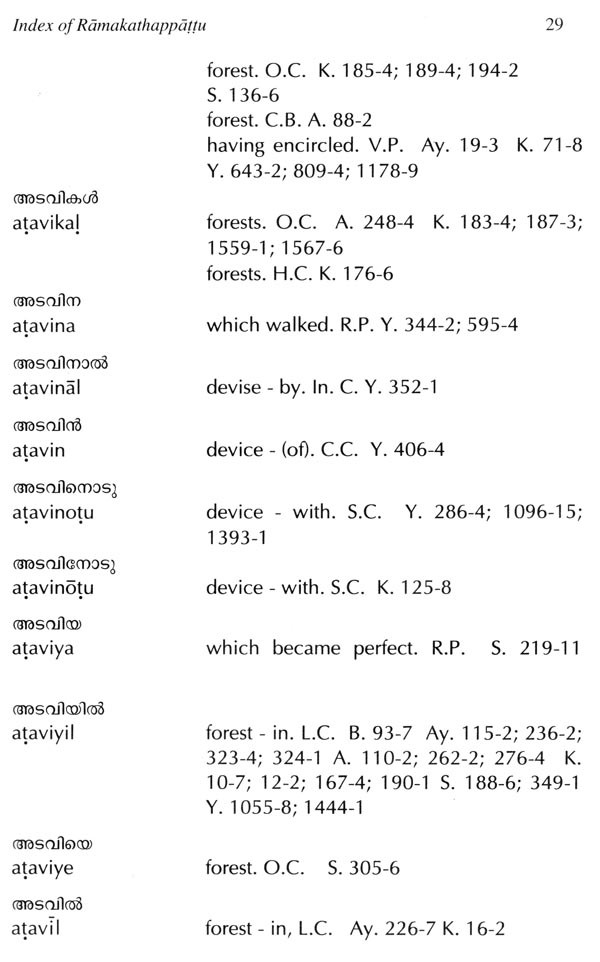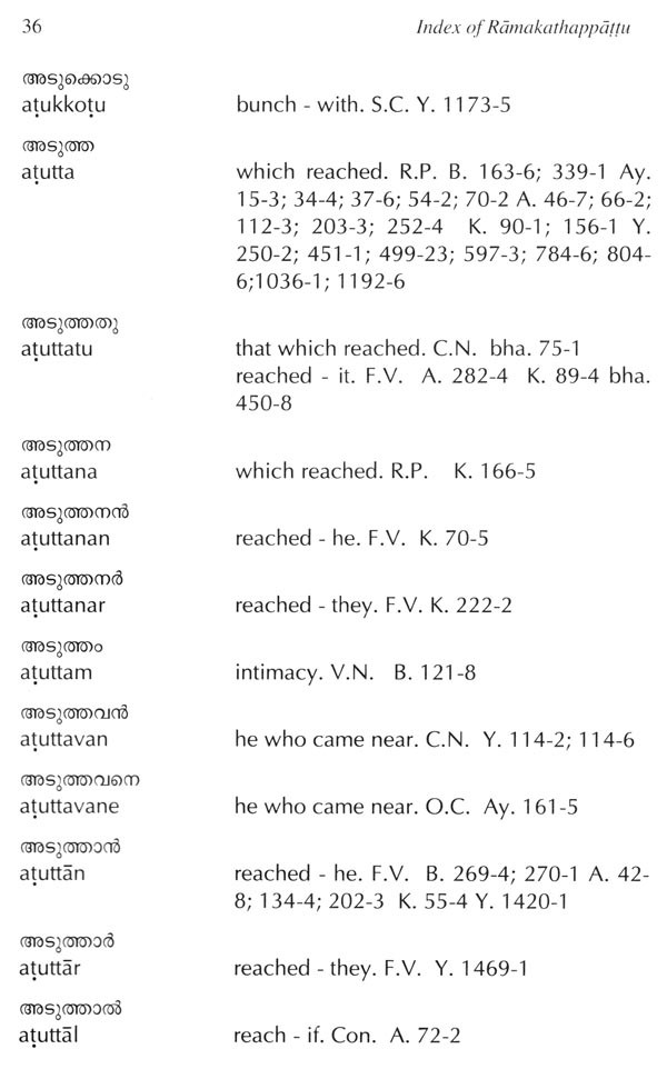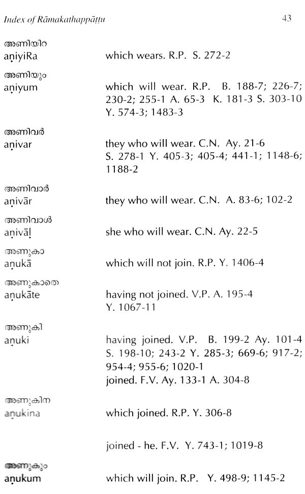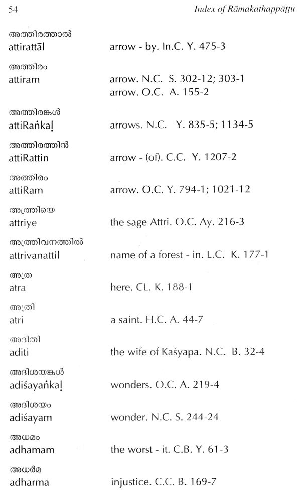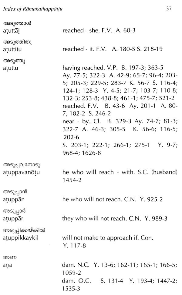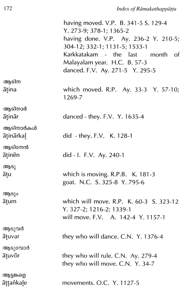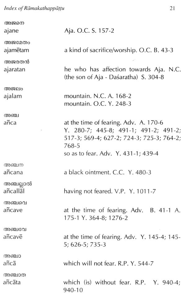 International School of Dravidian Linguistics had already published the grammatical indices of ancient Malayalam classical works such as Ramacaritam, Bhasakautaliyam and Kannassa Ramayanam. By publishing all the indices of ancient Malayalam works, ISDL aims to prepare a historical grammar and lexicon for Malayalam language. Indeed, Index of Ramakathappattu is a valuable source material for the attainment of the above goal. I thank Smt. G. Sulekha on behalf of ISDL for giving permission to publish the grammatical index of Ramakathappattu.