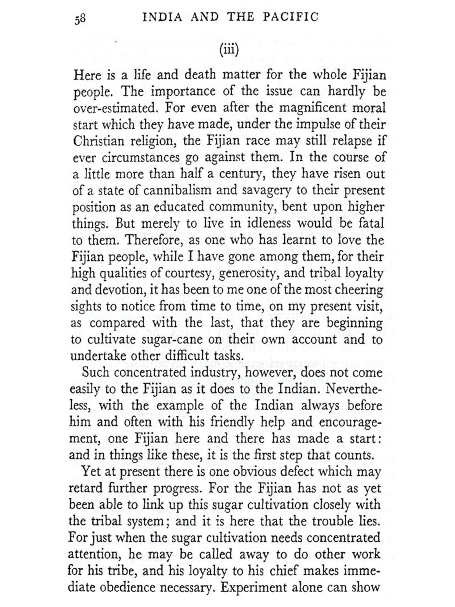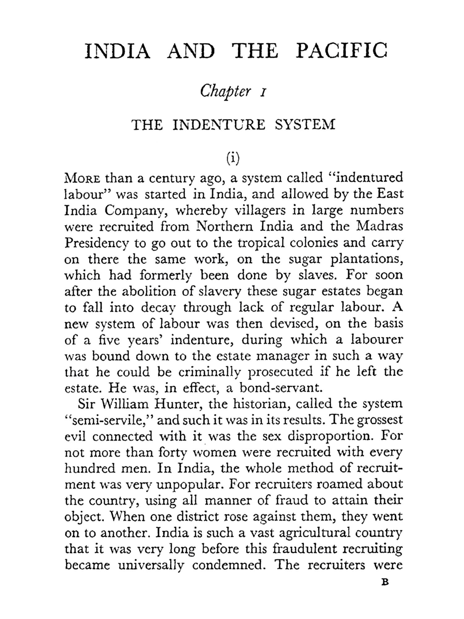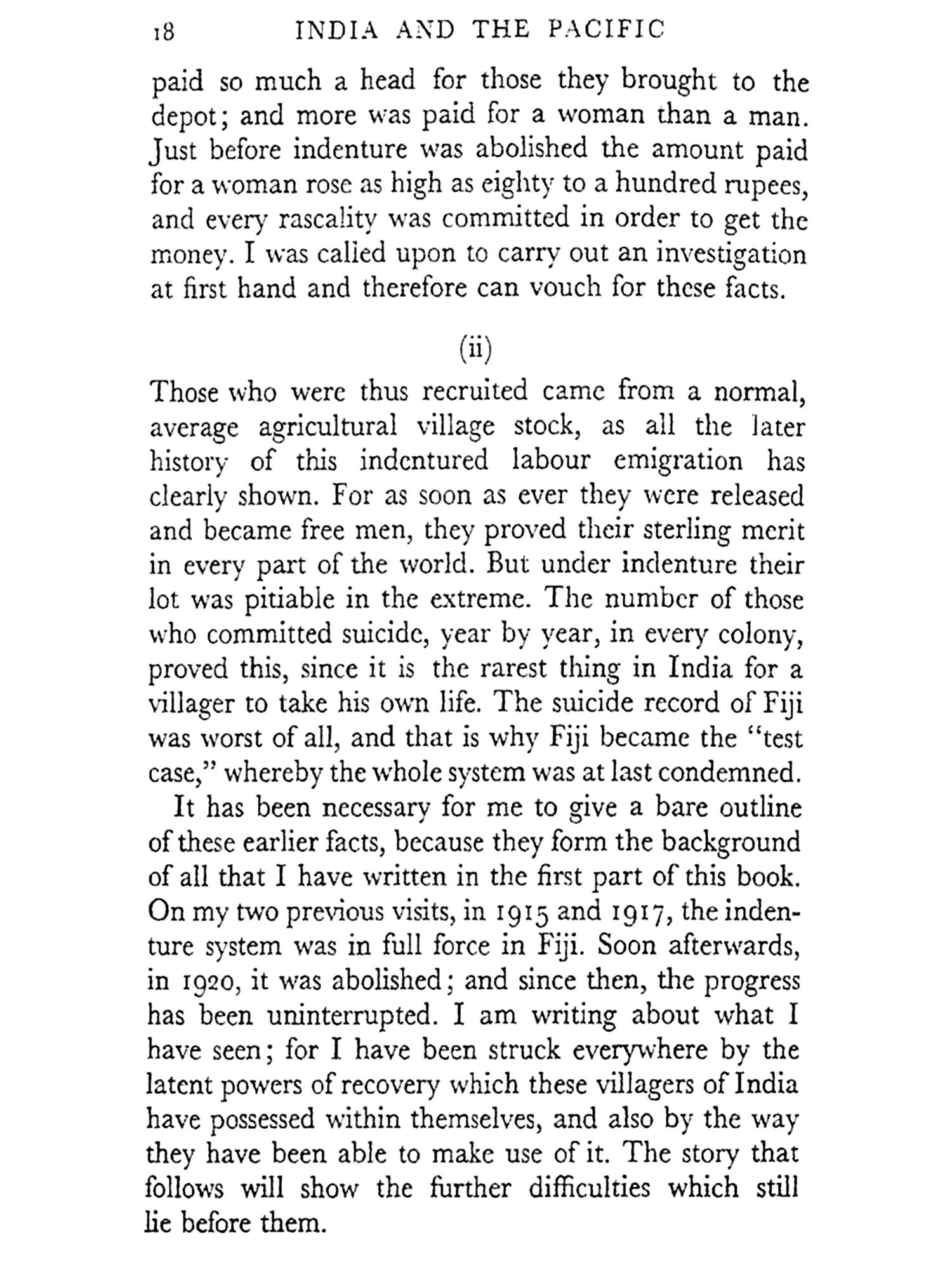 On two previous occasions, in 1915 and 1917, I had been asked by the Indian leaders to go out to Fiji, in the centre of the South Pacific, to enquire into the conditions of Indian indentured labour recruited for those islands. My friend, Mr. W. W. Pearson, accompanied me on the former of these two visits and we wrote a joint report, on our return, strongly condemning the indenture system as leading inevitably to moral degradation.