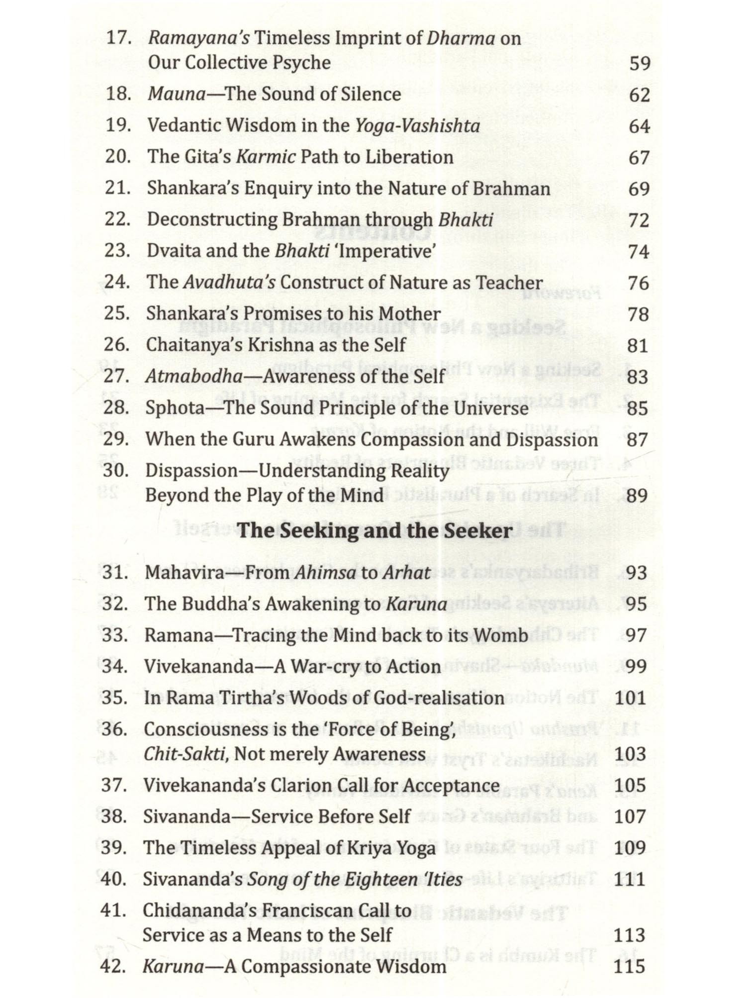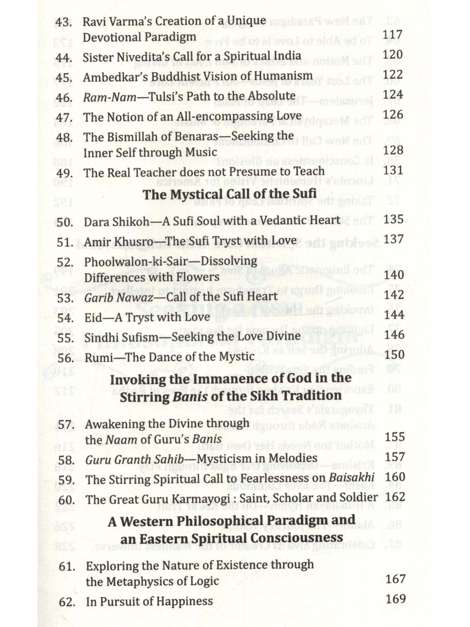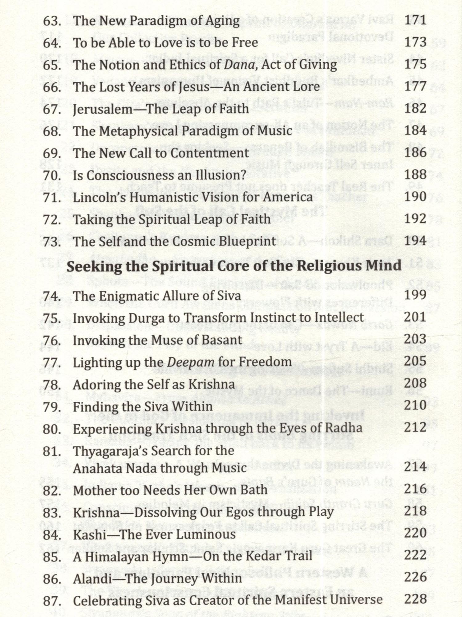 This journey of reflection and contemplation on the ancient T philosophical texts, this deep dive into the spiritual seeking of the evolved souls, traces its source to an early July morning at the Sivananda Ashram at Rishikesh in 1996, wherein Swami Chidamanda Saraswati, President of the Divine Life Society/Sivananda Ashram, "Initiated" me into the mysterious dimension of the intellect beyond the mind. I remember being asked to read the Atma-Bodha of Adi Sankara to understand the difference between the fluctuating transitory nature of the mind, with which I seemed besieged then, and the inner Consciousness which is the Silent source from where the mind itself arises. This 'initiation' set me on a path of reflection and writing for the next nearly 30 years, triggering off an intellectual and a spiritual journey which made me delve not only into the Vedantic-Upanishadic texts, but took me on a "pilgrimage of the mind from which there is no return", as J. Krishnamurti was wont to say. I had already been a student of Philosophy and Comparative Religions, having been under the tutelage of Prof. Huston Smith, Professor Emeritus of Religious Studies at Syracuse university and University of California, Berkeley, USA, and author of the best-selling classic work, The Religions of Man (also titled The World's Religions). Professor Huston Smith's tutelage for a few months at the Youth Seminar on World Religions in 1984 had a profound influence on my understanding of the core of all religious traditions, whether Eastern or Semitic traditions. But this particular meeting with Swamiji later, too, kindled a fire for plunging into Indic Philosophy, especially Vedantic thought. The meeting stoked a latent desire to The a free souf ex well, though that will have to watt perhaps the mitnit to be completely free of alagad responsibidines Subsequently, I was drawn to Indo-known places fos, which I'd never heard of earther, to feel inspired to understand and write afresh on these profound Indic texts of wisdom, these referencs pesänts of understanding what enlightenment is all about. Nevasa in the Ahmednagar district of Maharashtra, was one such a place i was drawn to in 1997 on a visit to Shirdi, which turned out to be the place where the famous Marathi saint poet of the Nath and Varkari tradition, Sant Dnyaneshwar had written his epic commentary the Bhagavad Gita, the naneswari or Bhavarth Dipika, interpreting the Gita in the light of Vedantic philosophy. This too set me on a journey of India's Philosophic Quest, as I prayed for inspiration to write on our ancient philosophical and mystical traditions. On Around the same time, but a little earlier, in 1996, The Times of India introduced the Speaking Tree Column on its Editorial page, at the initiative of Smt. Indu Jain, a column devoted exclusively to matters of Spirituality, faith and Philosophy, with a focus on Indian thought. This Speaking Tree column branched out later into a complete paper in itself later, before the Covid phase forced it to close down, but the Column has stayed on the Editorial page to date I am deeply indebted to the Times of India, deeply thankful to the Speaking Tree for giving me this wonderful opportunity, this wonderful platform to express my reflections on the philosophical and spiritual traditions of Indic thought, as well as the Western philosophical paradigm. Its been a great privilege to have been writing for the Speaking Tree, and all of the 87 pieces, barring one, have been published in the Speaking Column/Paper, of the Times of India over the last nearly 30 years. This journey with the Speaking Tree has been a great experience, and I wish to thank all the Editors who put such tremendous faith in my writing, and which too became the trigger to search for more themes, more subjects within Indic and Western thought. I must add also that the Word-limit set by the Editors was a great challenge too, as it becomes difficult to encapsule the core of a text or a tradition or an evolved Master.