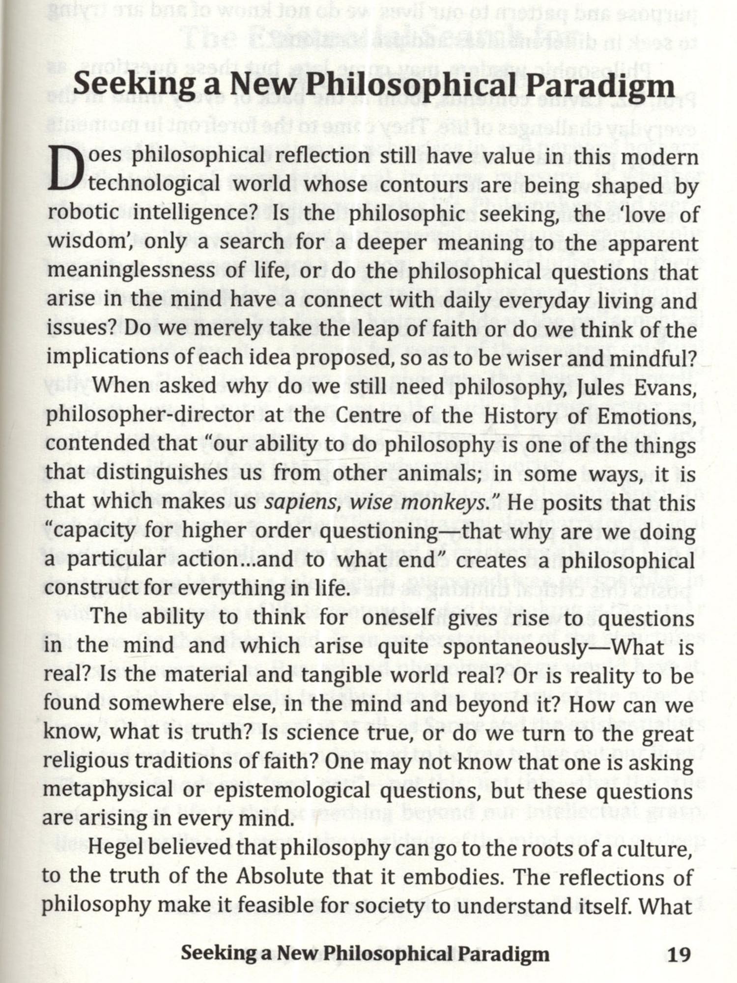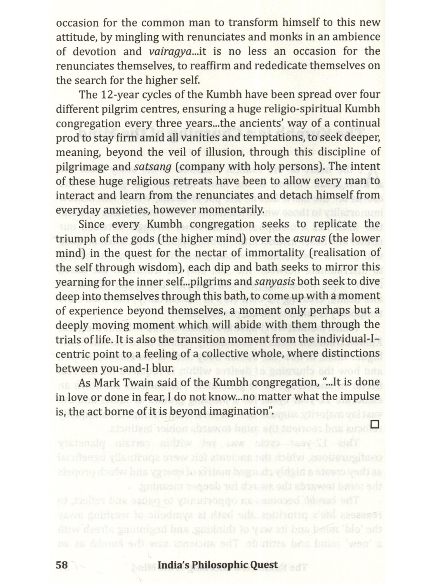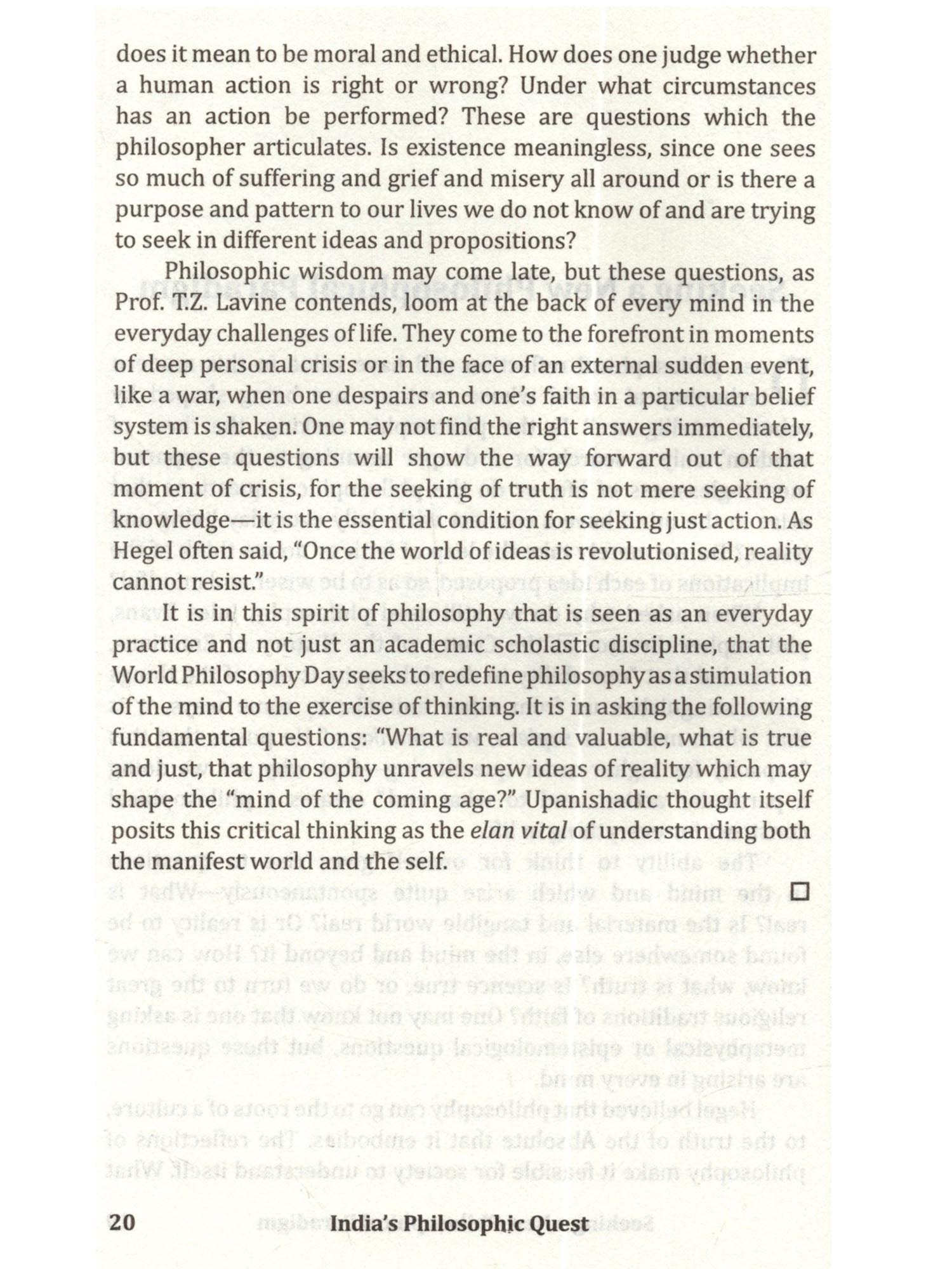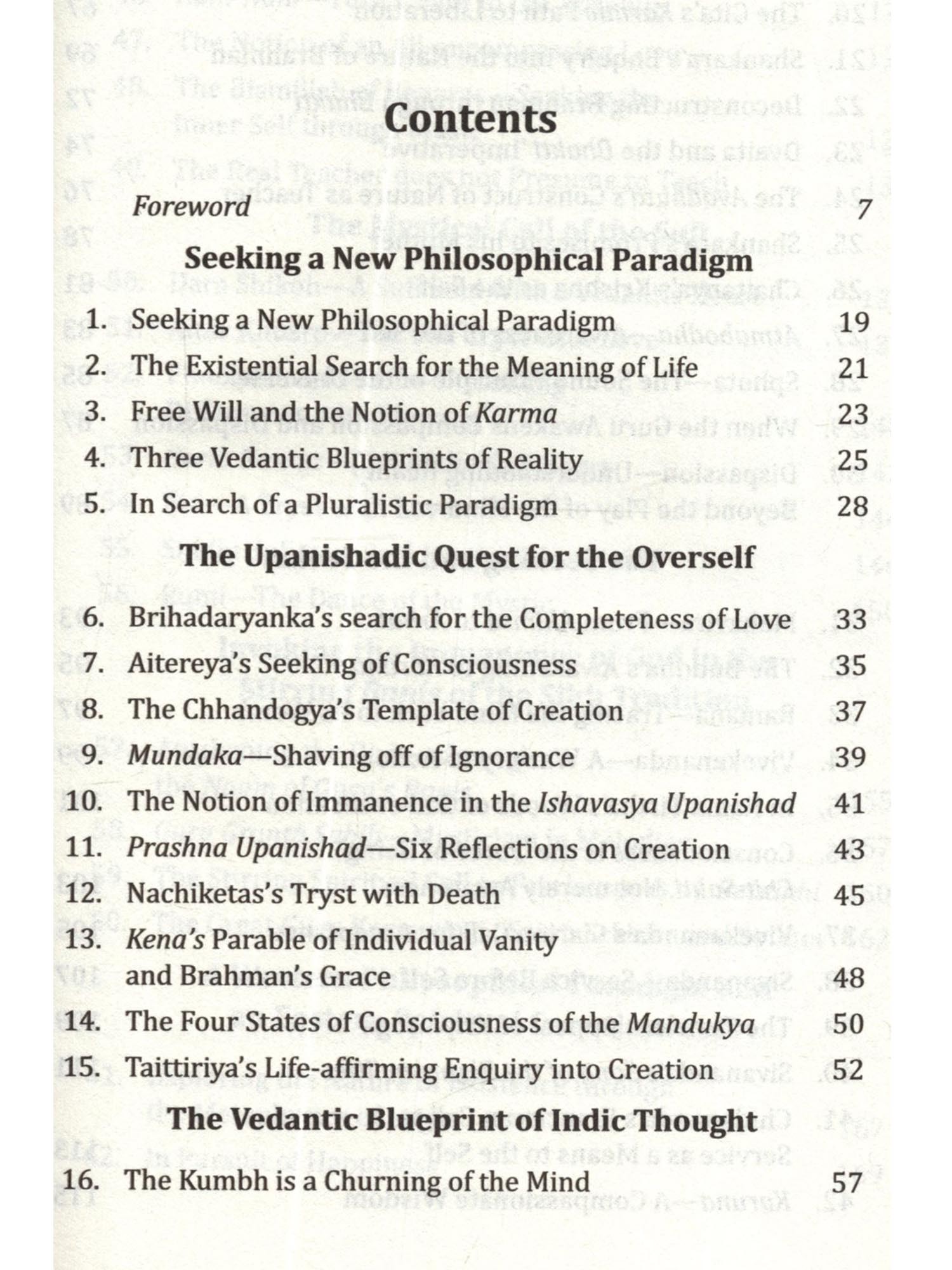 This journey of reflection and contemplation on the ancient T philosophical texts, this deep dive into the spiritual seeking of the evolved souls, traces its source to an early July morning at the Sivananda Ashram at Rishikesh in 1996, wherein Swami Chidamanda Saraswati, President of the Divine Life Society/Sivananda Ashram, "Initiated" me into the mysterious dimension of the intellect beyond the mind. I remember being asked to read the Atma-Bodha of Adi Sankara to understand the difference between the fluctuating transitory nature of the mind, with which I seemed besieged then, and the inner Consciousness which is the Silent source from where the mind itself arises. This 'initiation' set me on a path of reflection and writing for the next nearly 30 years, triggering off an intellectual and a spiritual journey which made me delve not only into the Vedantic-Upanishadic texts, but took me on a "pilgrimage of the mind from which there is no return", as J. Krishnamurti was wont to say. I had already been a student of Philosophy and Comparative Religions, having been under the tutelage of Prof. Huston Smith, Professor Emeritus of Religious Studies at Syracuse university and University of California, Berkeley, USA, and author of the best-selling classic work, The Religions of Man (also titled The World's Religions). Professor Huston Smith's tutelage for a few months at the Youth Seminar on World Religions in 1984 had a profound influence on my understanding of the core of all religious traditions, whether Eastern or Semitic traditions. But this particular meeting with Swamiji later, too, kindled a fire for plunging into Indic Philosophy, especially Vedantic thought. The meeting stoked a latent desire to The a free souf ex well, though that will have to watt perhaps the mitnit to be completely free of alagad responsibidines Subsequently, I was drawn to Indo-known places fos, which I'd never heard of earther, to feel inspired to understand and write afresh on these profound Indic texts of wisdom, these referencs pesänts of understanding what enlightenment is all about. Nevasa in the Ahmednagar district of Maharashtra, was one such a place i was drawn to in 1997 on a visit to Shirdi, which turned out to be the place where the famous Marathi saint poet of the Nath and Varkari tradition, Sant Dnyaneshwar had written his epic commentary the Bhagavad Gita, the naneswari or Bhavarth Dipika, interpreting the Gita in the light of Vedantic philosophy. This too set me on a journey of India's Philosophic Quest, as I prayed for inspiration to write on our ancient philosophical and mystical traditions. On Around the same time, but a little earlier, in 1996, The Times of India introduced the Speaking Tree Column on its Editorial page, at the initiative of Smt. Indu Jain, a column devoted exclusively to matters of Spirituality, faith and Philosophy, with a focus on Indian thought. This Speaking Tree column branched out later into a complete paper in itself later, before the Covid phase forced it to close down, but the Column has stayed on the Editorial page to date I am deeply indebted to the Times of India, deeply thankful to the Speaking Tree for giving me this wonderful opportunity, this wonderful platform to express my reflections on the philosophical and spiritual traditions of Indic thought, as well as the Western philosophical paradigm. Its been a great privilege to have been writing for the Speaking Tree, and all of the 87 pieces, barring one, have been published in the Speaking Column/Paper, of the Times of India over the last nearly 30 years. This journey with the Speaking Tree has been a great experience, and I wish to thank all the Editors who put such tremendous faith in my writing, and which too became the trigger to search for more themes, more subjects within Indic and Western thought. I must add also that the Word-limit set by the Editors was a great challenge too, as it becomes difficult to encapsule the core of a text or a tradition or an evolved Master.