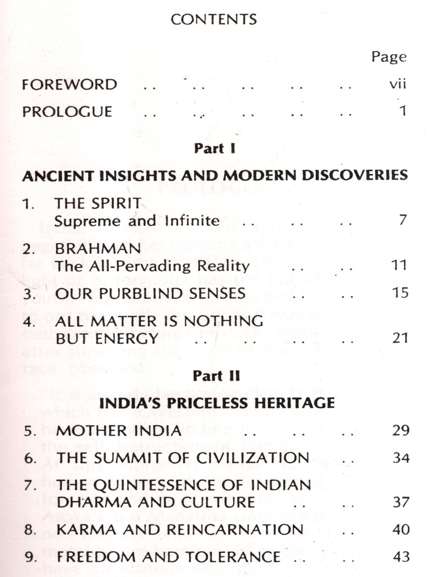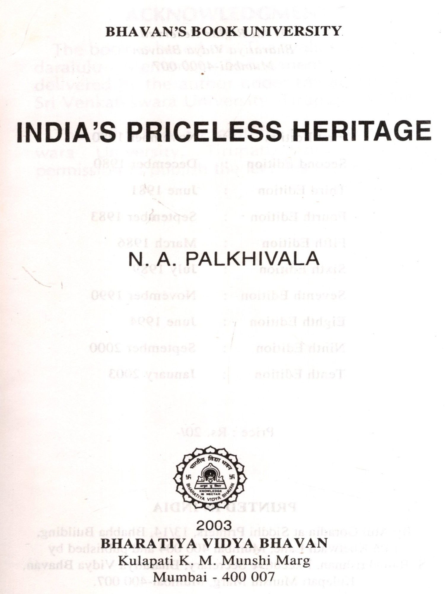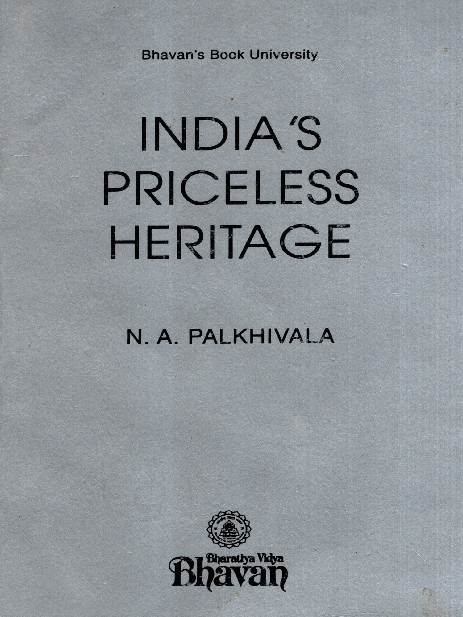The reader of this little book by Shri Palkhi-vala will get a glimpse into this science and technique, into this supreme science and technique, para vidya, as our Mundaka Upanishad describes it. And very aptly the book has been titled "India's Priceless Heritage". And the reader will not fail to be impressed that the writer writes from conviction, and not from scholar-ship, not like the spoon that serves the soup not knowing its taste itself!