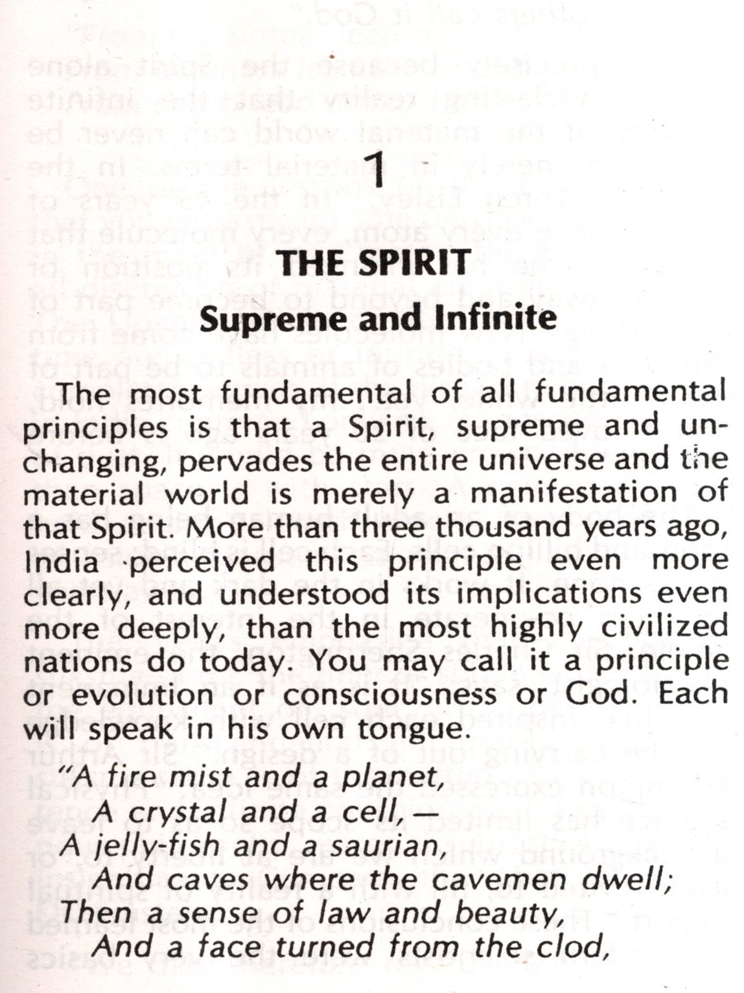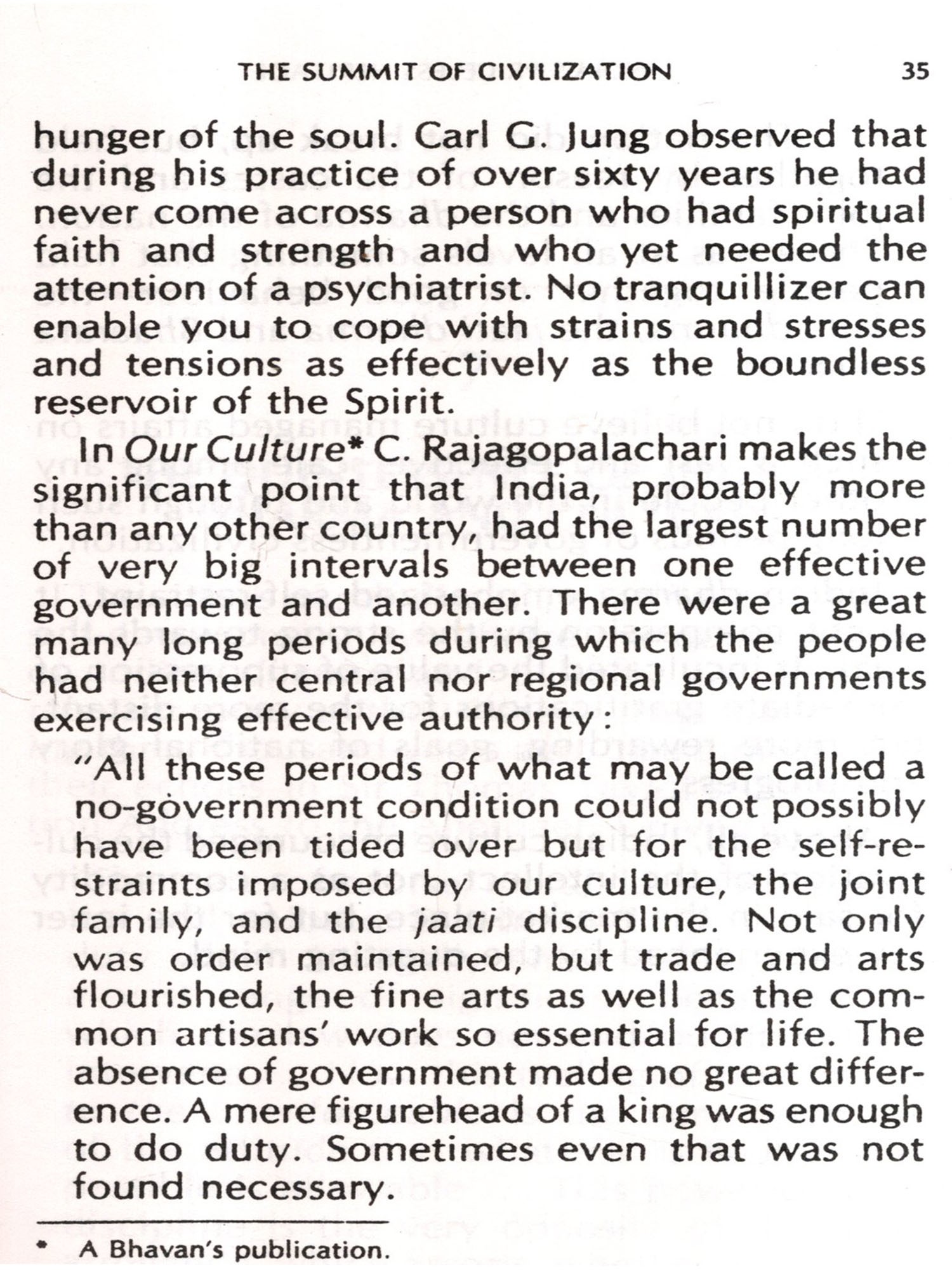 Shri Nani A. Palkhivala has earned a name for himself in his professional field of law and jurisprudence. But he has understood the dis tinction made by psychologist Carl Jung of Zurich between achievement, on the one hand, and culture or personality, on the other, or as our Vedanta expresses it, between function, on the one hand, and being, on the other. And Jung warns that he who carries over to the second half of human life the philosophy of the first half, namely, achievement -all that constitutes worldly success-and makes that second half "merely a pitiful appendage of life's morning", must pay a heavy price for doing so with damage to the soul, with diminution of personality, with inner poverty of spirit. For, "money-making, social existence, family, and posterity are nothing but plain nature-not culture. Culture lies beyond the purpose of nature." And there is a human growth beyond the purposes of plain nature; this is the spiritual nature of man, the manifestation of the para prakrti, or higher nature, as the Gita expresses it in its eighth chapter. This spiritual growth is the privilege and opportunity of every human being; and India has developed the science and technique of it to perfection.