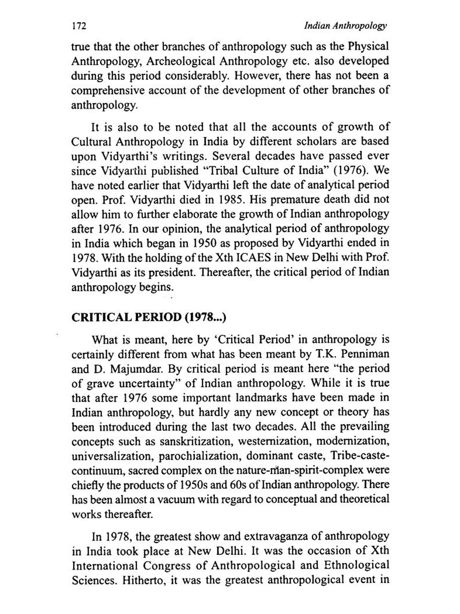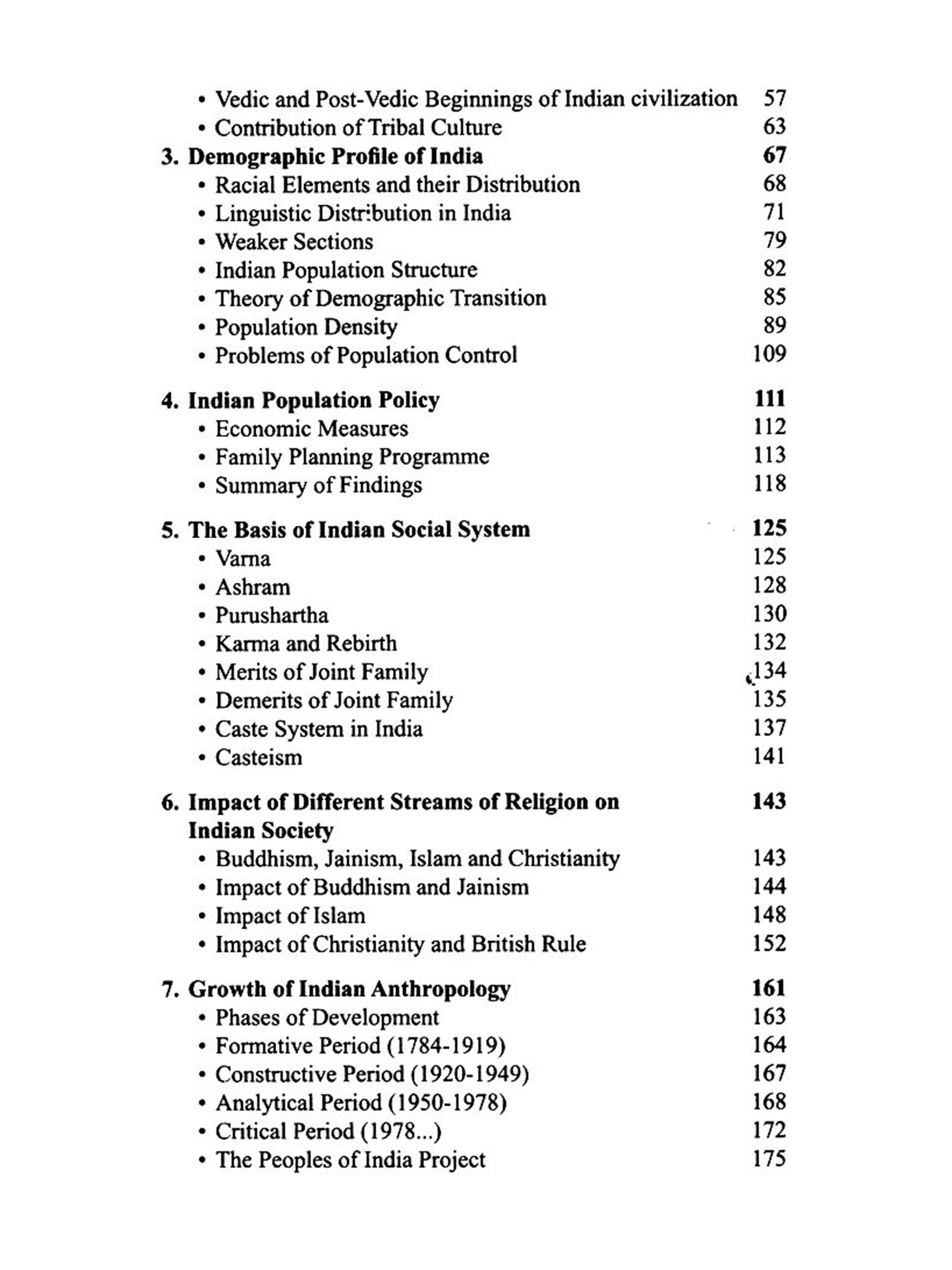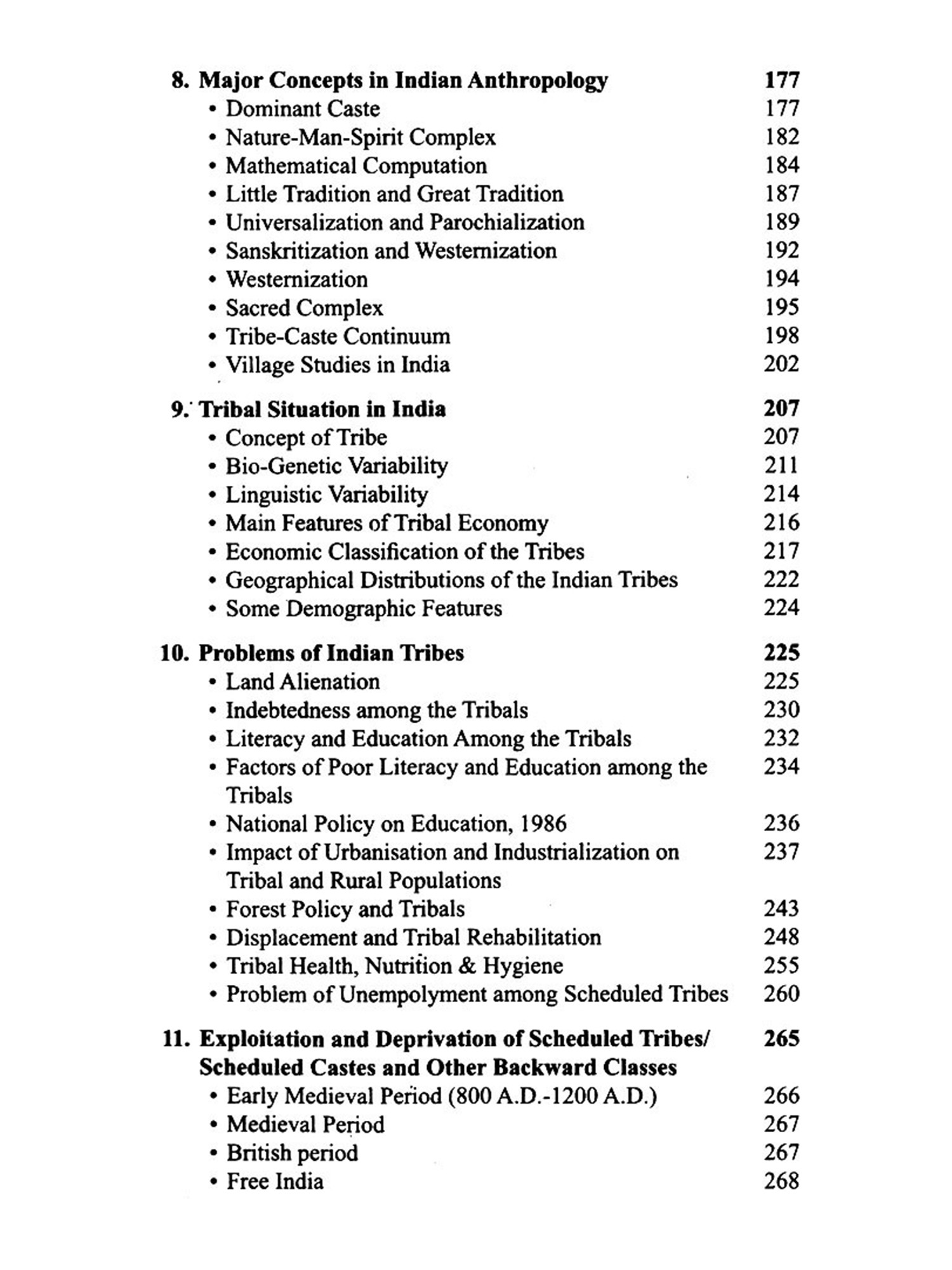 The book contains, interalia, an up-to-date and critical discussion on the growth of Indian Anthropology. Various concepts viz. Nature Man-Spirit-Complex, Tribe-caste continuum, Great and Little Traditions, Universalization and Parochialization, Dominant Caste, Sacred Complex, Sanskritization etc. have been lucidly and comprehensively described. The discussion on Scheduled Tribes, Scheduled Castes, and Other Backward Classes is complete and up to date. So is the presentation of demographic profile of India and Indian Population policy.