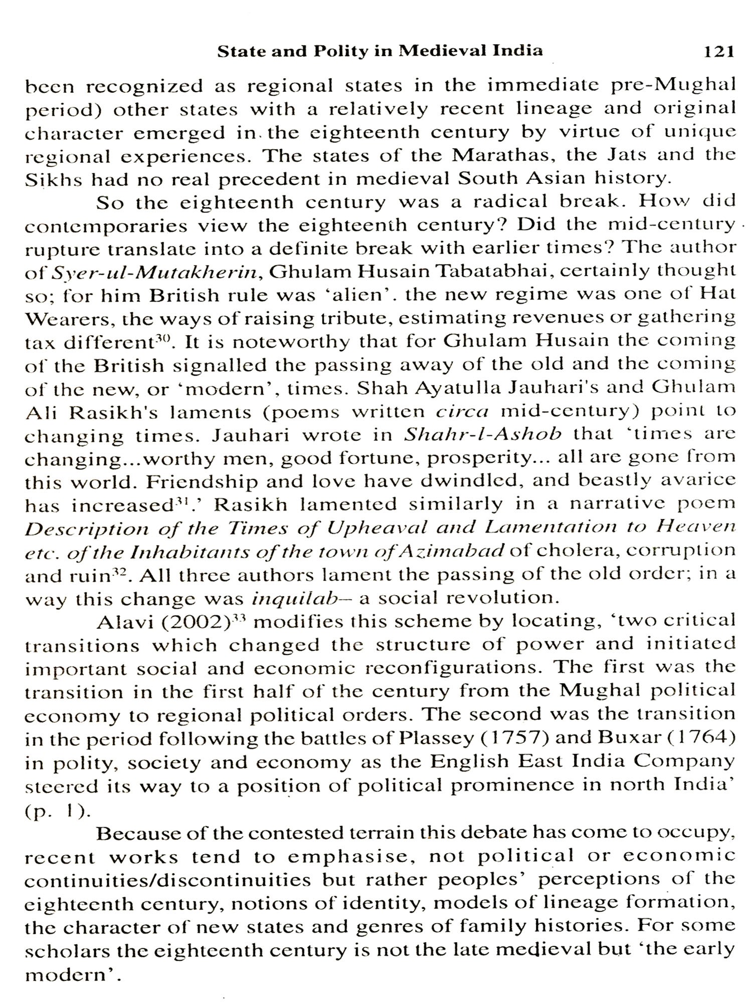 Rila Mukherjee analyses the character of the state and polity which was essentially a despotism but had institutional checks. The courts became a plaything of the nobility and their scramble for jagirs. As long as the army was in the payroll of the government, the state would remain sovereign and absolute but its feudalization eroded state authority. The polity became hierarchical and a burden on the primary producers. This led to unrest at the top and the bottom. It was a fractured central state and polity or alternatively gave birth to segmented states as in the south.
