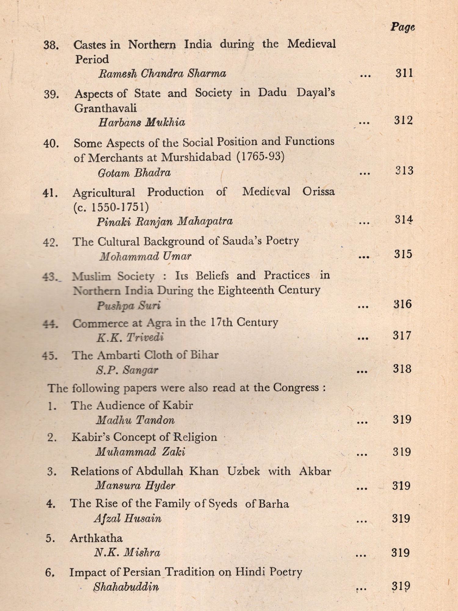 I am grateful to the Sectional Presidents who have selected the papers for publication and to the editors who have not only edited the matter but also read the proofs. I am specially obliged to Prof. Satish Chandra for accepting the chief-editorship and looking after the editorial work of the Proceedings. A great deal of credit for the timely publication of the proceedings goes to Prof. B.R. Grover, Incharge Publications and Joint Secretary, Indian History Congress. I am equally grateful to Dr. Aniruddha Ray, Honorary Treasurer, Indian History Congress and members of the staff, Centre for Studies in Social Sciences, Calcutta for extending full co-operation for the publication of the current proceedings. Shree J.C. Dua, Department of History, Dyal Singh College, University of Delhi has spent a great deal of time in helping to organise the publication. I have no words to thank Sudha Publications Pvt. Ltd. for extending full co-operation for printing the volume at short notice. They have spared no pains for keeping up the quality of the work.