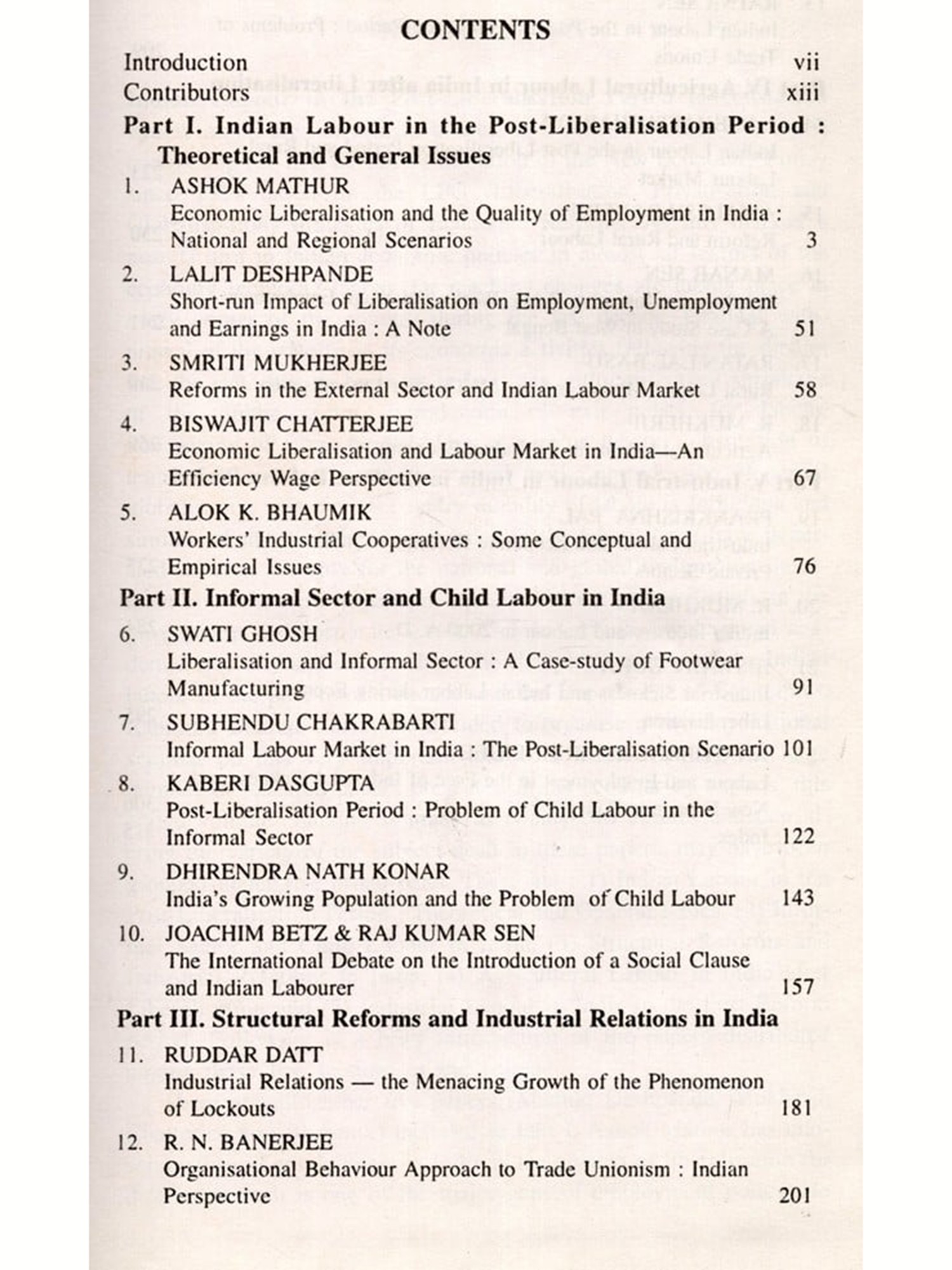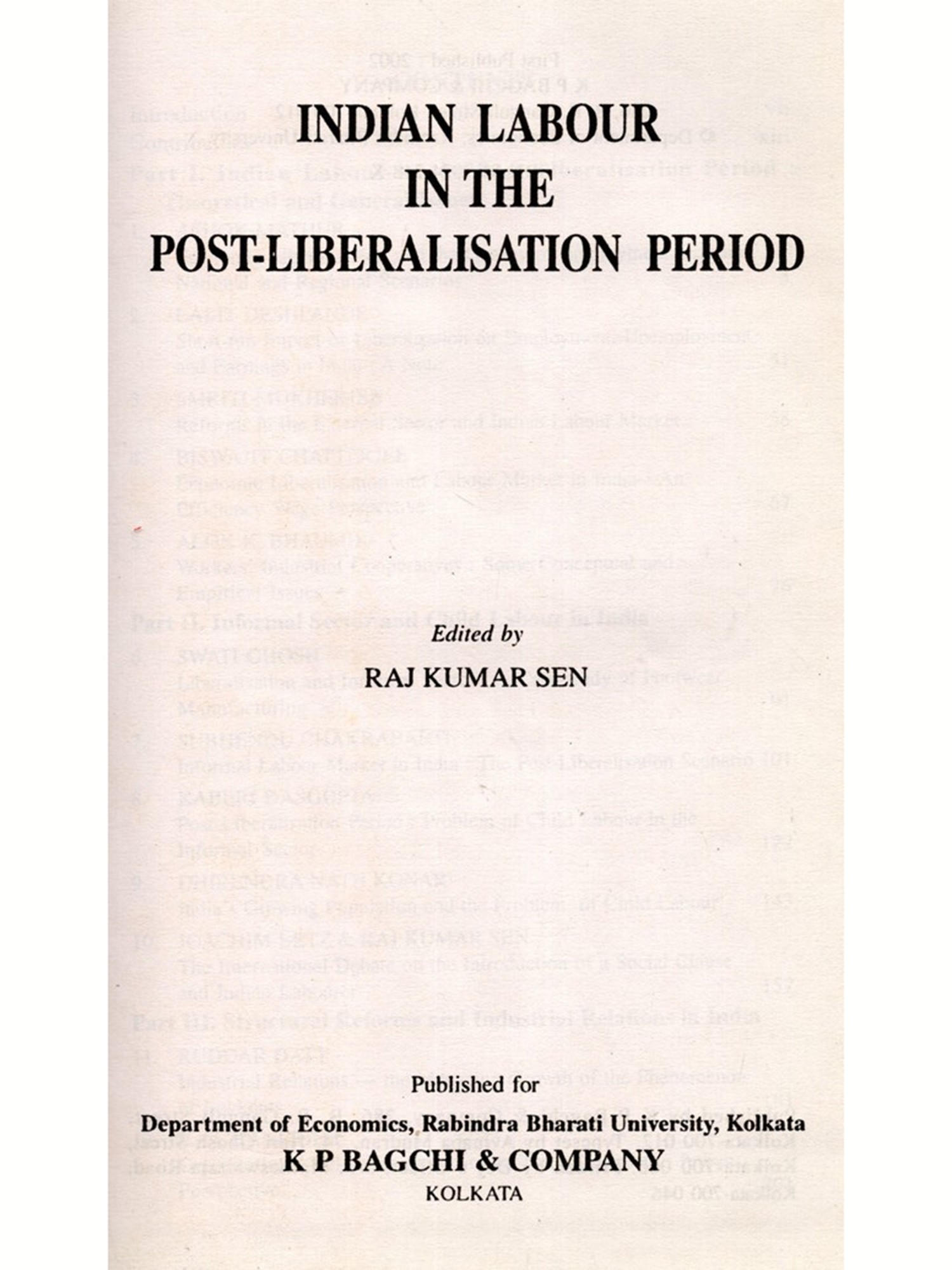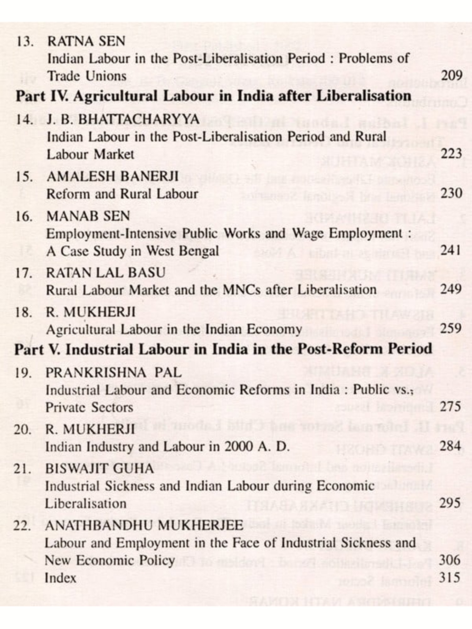 Indian Labour in the Post-Liberalisation Period is considered widely as an area of crucial interest at a time when our country is completing the first decade of initiation of the New Economic Policy since 1991 based on the LPG (Liberalisation, Privatisation and Globalisation) strategies of Economic Reforms. As this marked a near U-turn in Indian economic policies in almost all sectors of the economy including labour, far reaching changes are taking place in every comer of the country during the last decade. Gradual withdrawal of the state from its economic activities following the dictum that the state has no business in business with consequent shrinkage of the public sector, introduction of exit policy for labour. downsizing of firms by shedding of surplus labour, substitution of tenure job with part-time and casual works, introduction of partial globalisation where cross country mobility of labour is forbidden and similar other sea-changes introduced in the labour front have generated concern not only for the national and global trade union movement and labourers in general, but also for the policy matters in the government and corporate sector. This has resulted widespread aca-demic curiosity and debate about the changing situation of the Indian labour in the post-reform decade and the Department of Economics. Rabindra Bharati University decided to organise a two-day national seminar on this very important and vital theme. Among the large number of research papers presented in the seminar by experts, this edited volume contains as many as twenty-two articles and considering the variety of the subject dealt in these papers, they have been grouped under five broad parts. These are: 1) Indian Labour in the Post-Liberalisation Period Theoretical and General Issues, (2) Infor-mal Sector and Child Labour in India, (3) Structural Reforms and Industrial Relations in India, (4) Agricultural Labour in India after Liberalisation and (5) Industrial Labour in India in the Post-Reform period. Following is a brief introduction of the papers distributed
