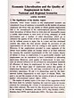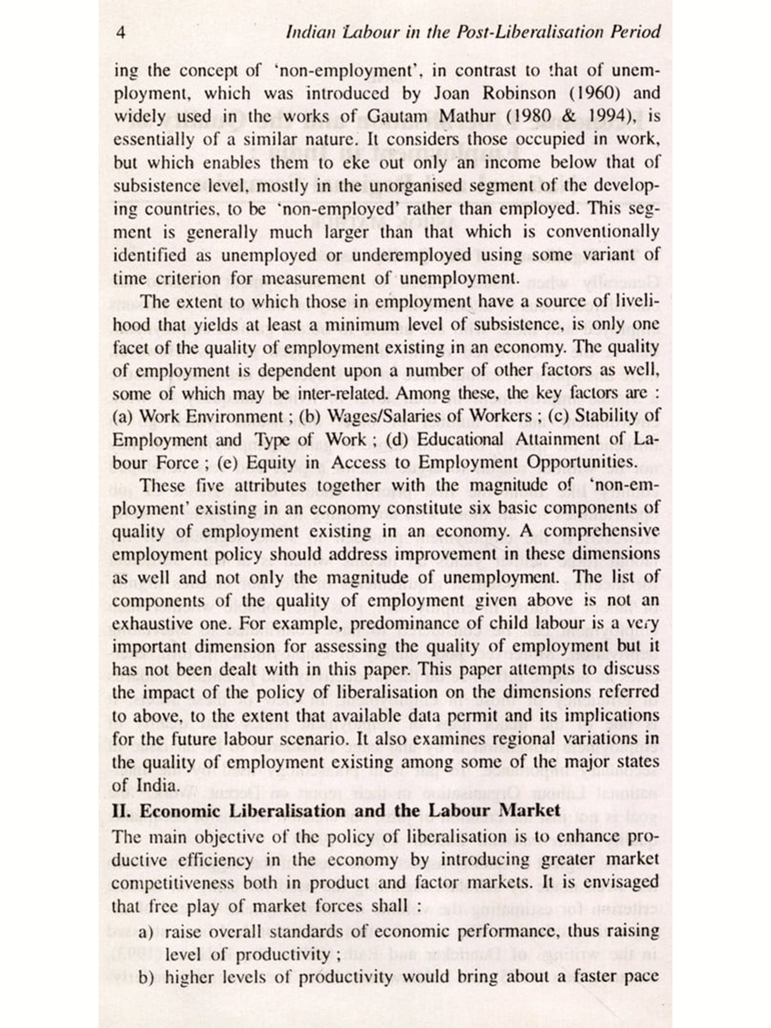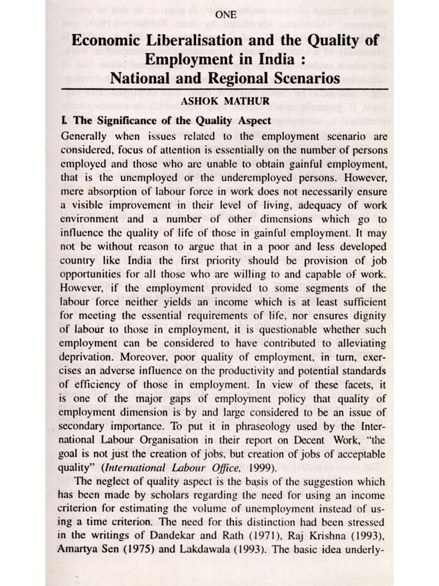 among these five sections of the volume There are altogether five papers (Mathur, Deshpande, Mukherji, Chatterjee and Bhaumik) included in Part 1. Ashok Mathur has chosen quality of employment in India in the context of liberalisation for discussion as it is one of the major gaps of employment policy. He attempts to discuss in his paper the impact of the policy of liberalisation on the various dimensions of the quality of employment viz magnitude of non-employment, work environment, wages/salaries of workers, stability of employment and type of work, educational level of labour force and equity in access to employment opportunities.