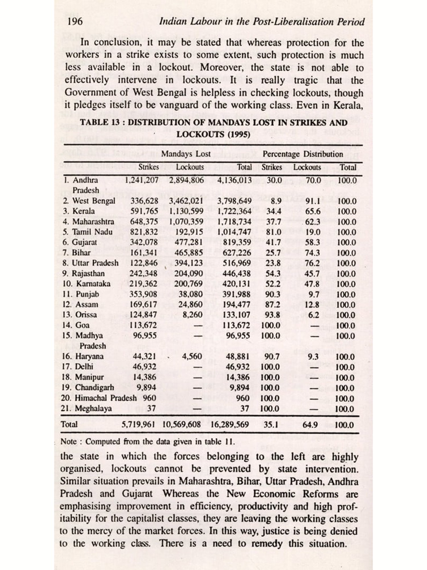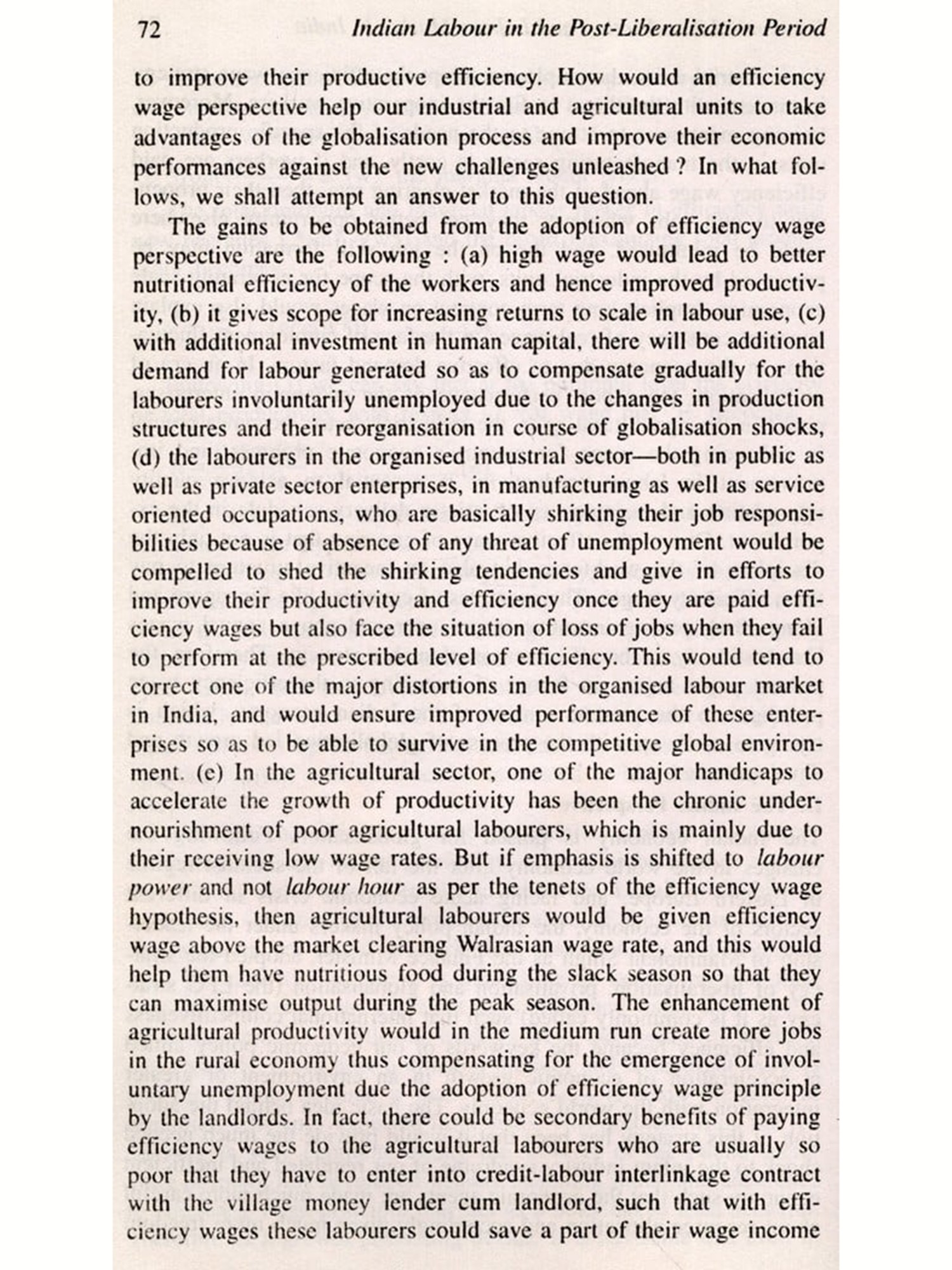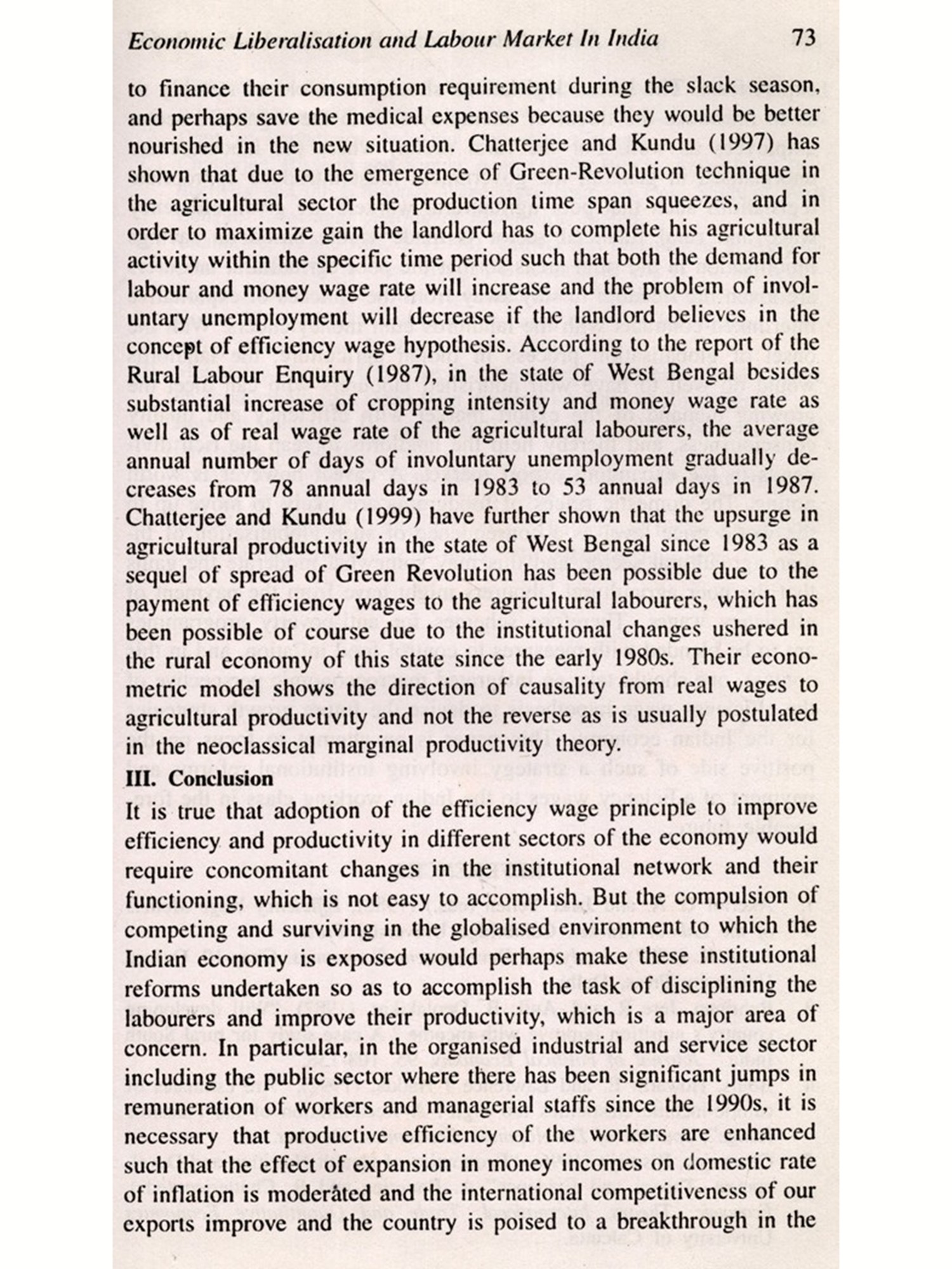 The paper also attempts to examine regional variations in the quality of employment existing among the major states of India. It has been observed that while there has been a decline in non-employment and a higher educational attainment of the work force, the organised sector employment in the secondary sector could not keep pace with growth of income and the share of casual labour is increasing. The issues of labour flexibility with job security and regional variations in the dimensions of employment quality are also discussed in this exhaustive and extremely informative article. Lalit Deshpande has discussed the short run impact of liberalisation on labour in terms of participation rates, unemployment and underemployment, employment status, sectoral distribution of workers, casualisation and feminization. There has been increased demand for labour in the urban areas while WPR of rural women declined. Smriti Mukherjee's paper discussed the reforms in external sector and its linkage with the functioning of domestic labour market with the help of a simple model. Both trade liberalisation and capital account liberalisation are discussed in the context of the trade reforms and their impact on the labour market. Biswajit Chatterjee in his paper has argued for a new direction in state policy to introduce the norm of efficiency wage in different sectors of the economy when the integration with the global markets has become an irreversible process. Such an approach may also help the process of poverty alleviation. Of course such a strategy will involve institutional reforms which may be difficult to achieve.