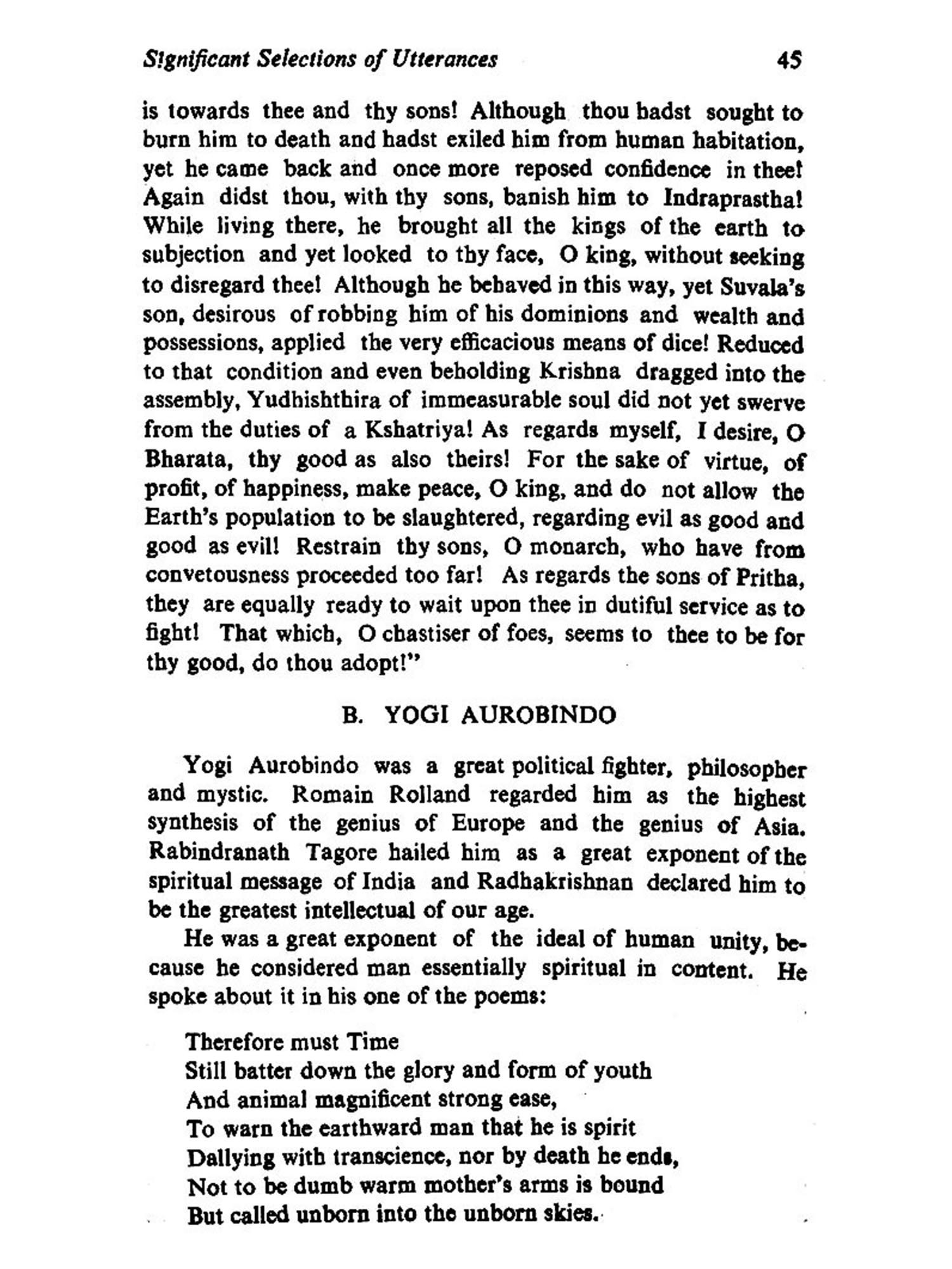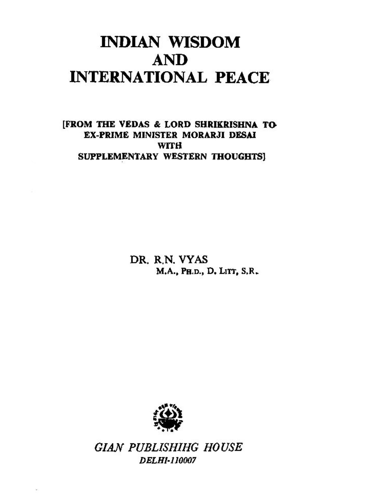 The present work is inspired by this very objective. It underlines the funda-mental importance of world-peace in its Introduction. Further it proceeds to discuss the Basis of Peace and finally presents the very utterances of Lord Sri Krishna, Yogi Aurobindo, M. K. Gandhi, Jawaharlal Nehru, Dr. Radha-Krishnan and Morarji Desai (when he was the Prime Minister of India.)
