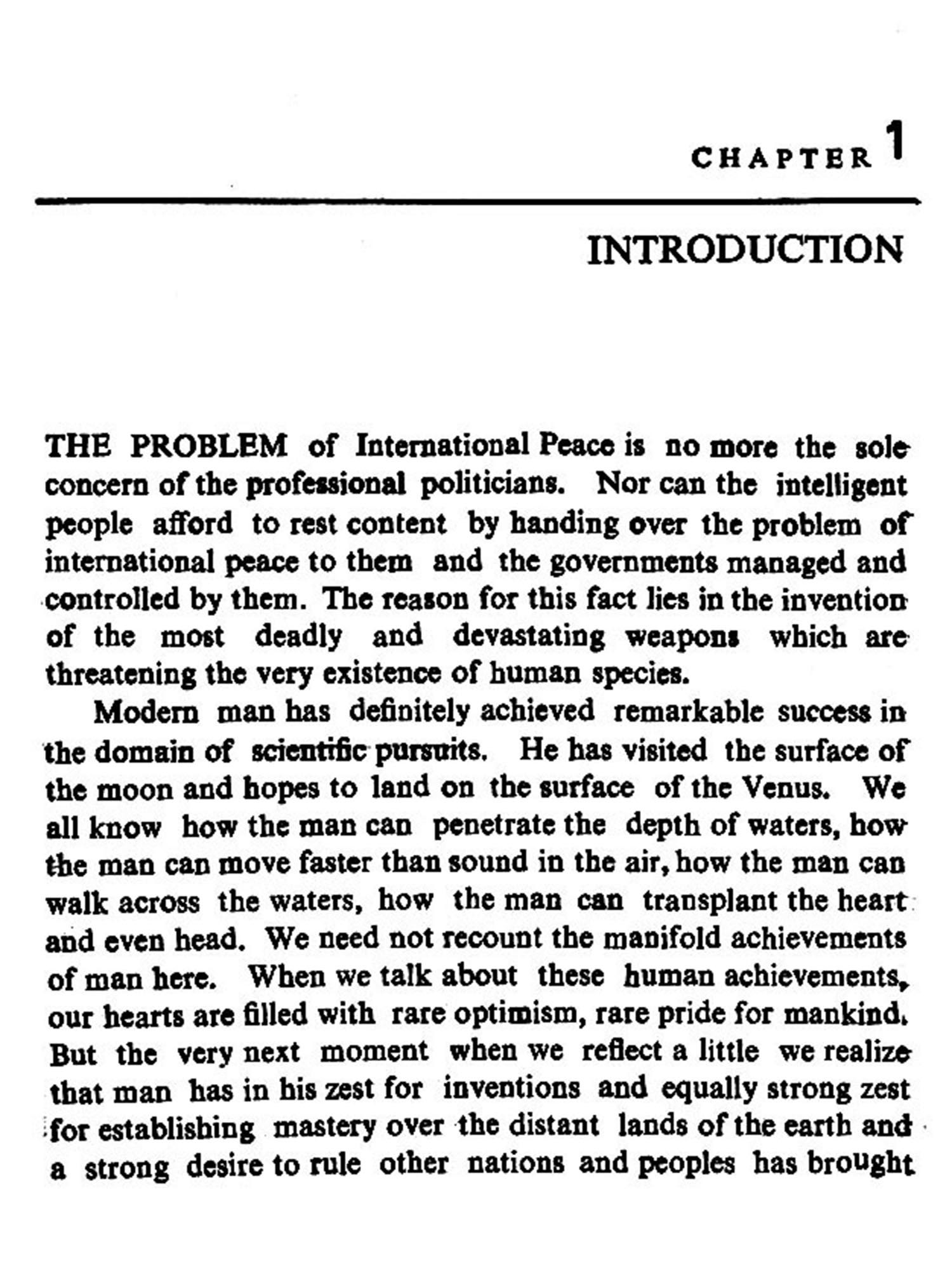 Every sensible person should realize the basic importance of World Peace for the survival of mankind. The talk about the necessity of World Peace does not mean indulging in any religious, old-fashioned and meaningless platitude. Atomic weapons have presented a real threat of annihilation to man-kind. It has been estimated that our modern world has already manufactured more than twenty thousand megaton atom bombs, while only one hundred megaton atom bombs are sufficient to reduce this earth to ashes.