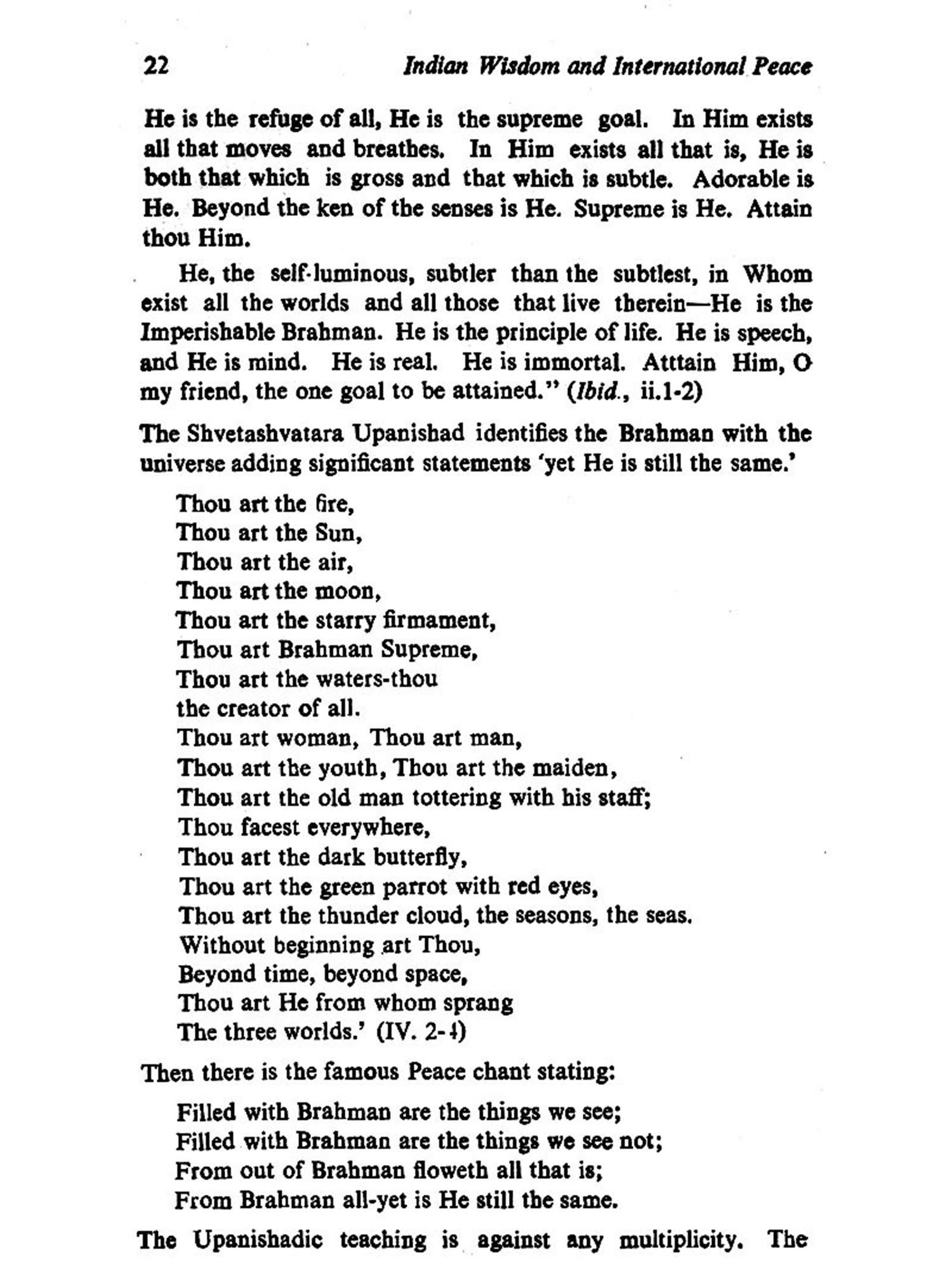 Happily, there are some nations even at present which are genuinely interested in the maintenance of peace. India is the foremost nation in this category. India's love for peace is rooted in its past. It loved and preached the gospel of love and amity right from the days of the Vedas and Upanishads. Only that nation can love peace which has a clear perception of spirituality. Manu, the supreme law-giver of Hinduism, had stated that the conduct of every Indian should be so high that people of other nations may draw inspiration from it.