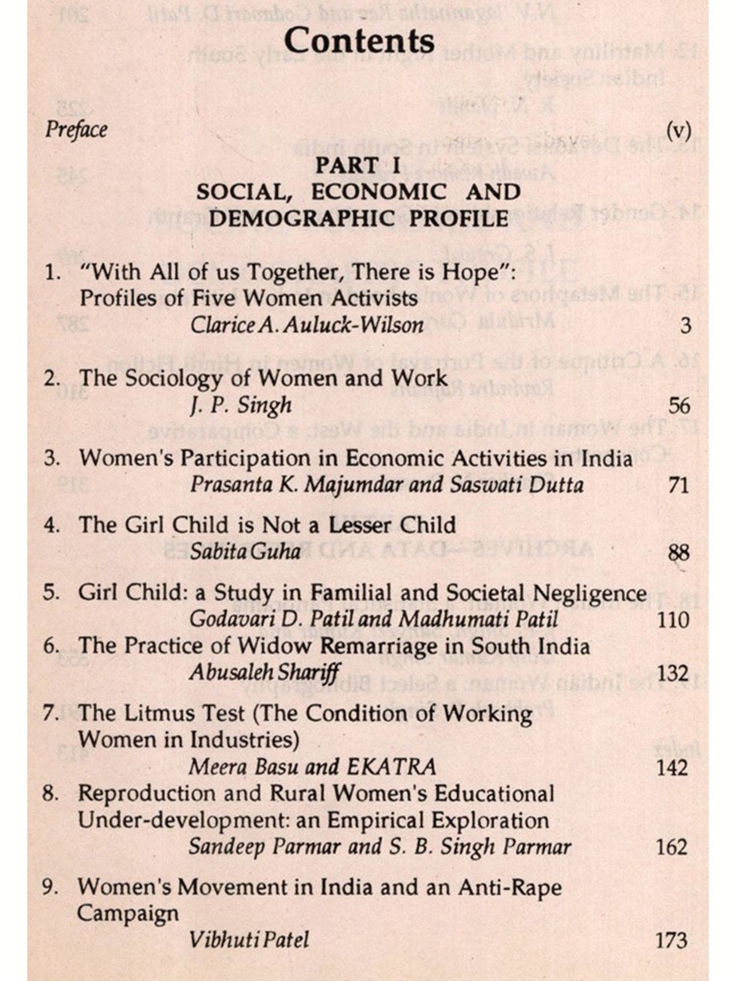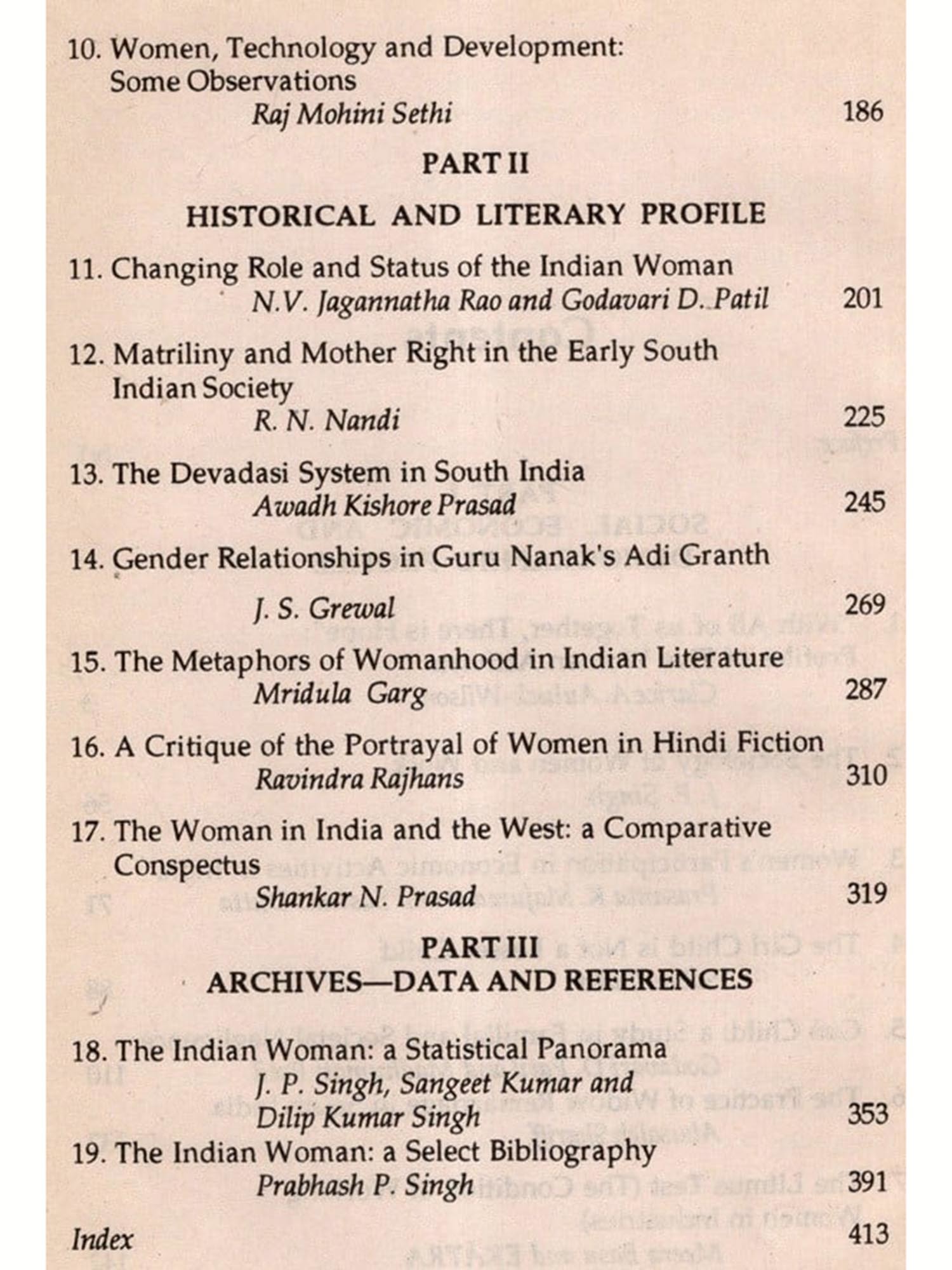Considering the facts stated above, over two hundred experts from various disciplines, both from India and abroad, were invited to contribute a detailed and scholarly account of the Indian woman on any of the topics listed below. The contributors were requested to identify the real issues about the Indian woman, focus the attention upon them bring evidence to bear upon the situation, and investigate the whole matter in a logical and rigorous way.