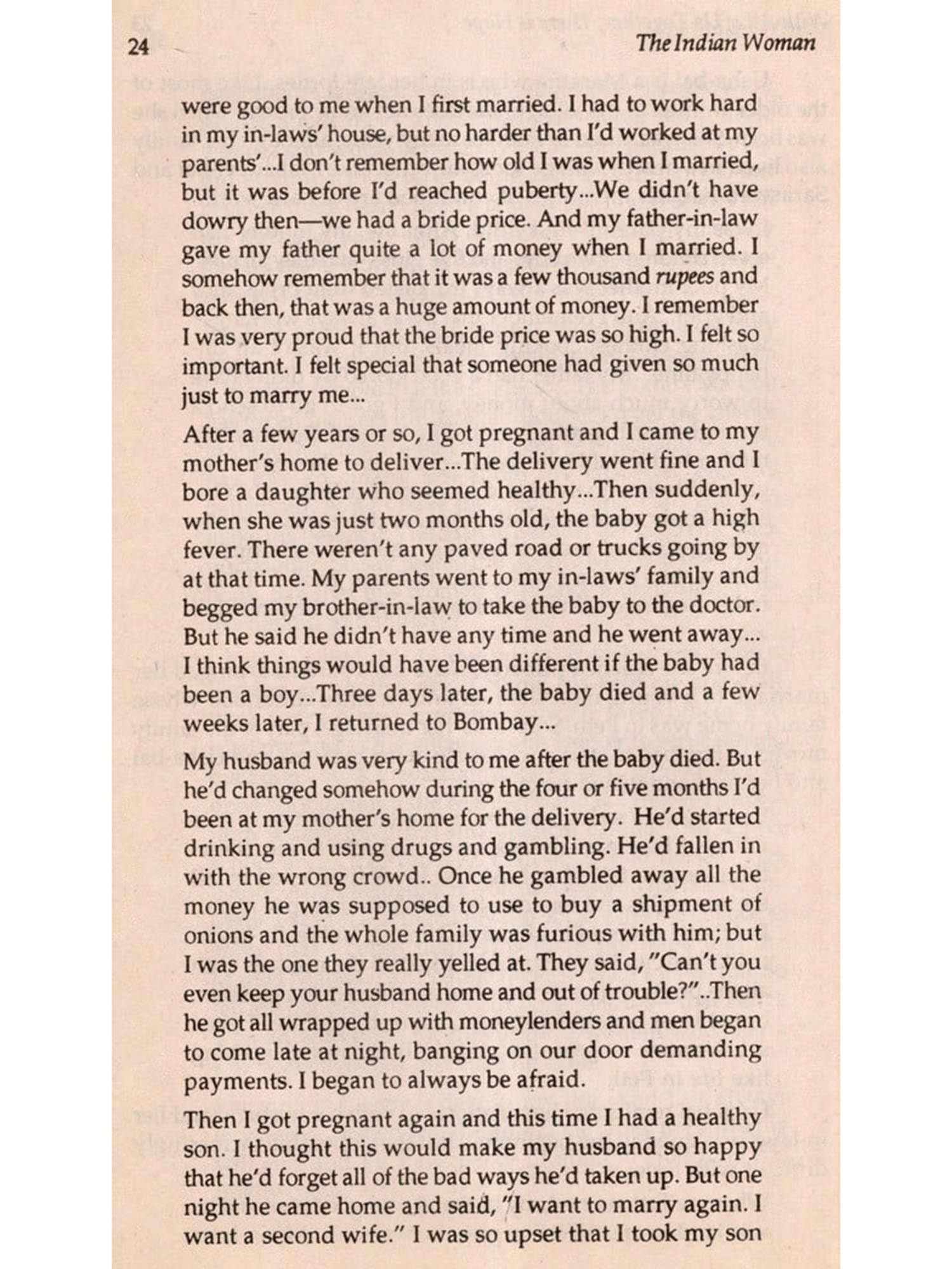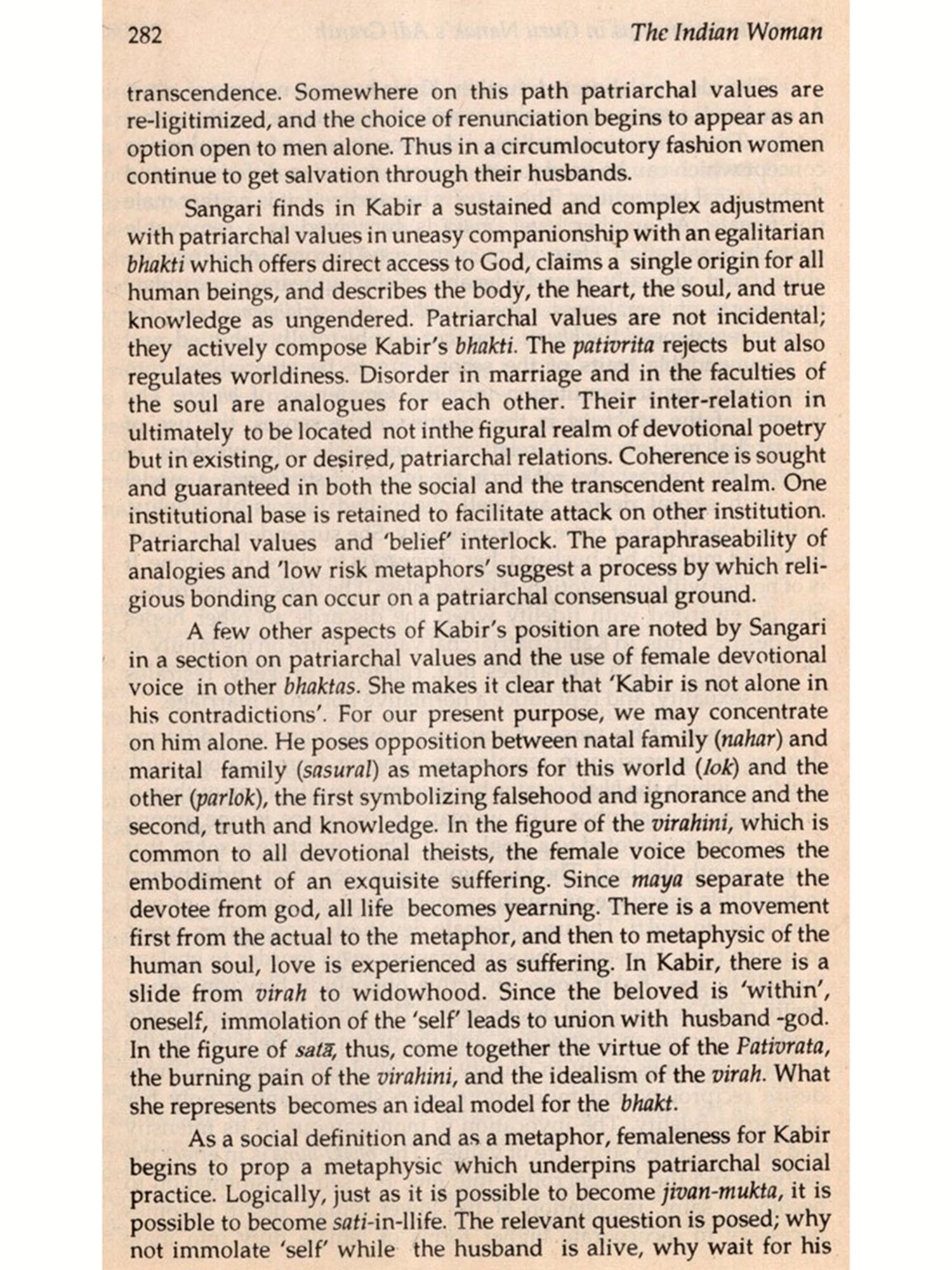 There are two distinct views about the Indian woman. One is the typical old Indian viewpoint of the Indian woman being a symbol of purity, faithfulness and submission and devotion to her husband (or patideva). Sita and Savitri happen to be the archetypes of this view. The other view, mostly typical of western scholars, is that the Indian woman is backward, suppressed and treated almost as a chattel.