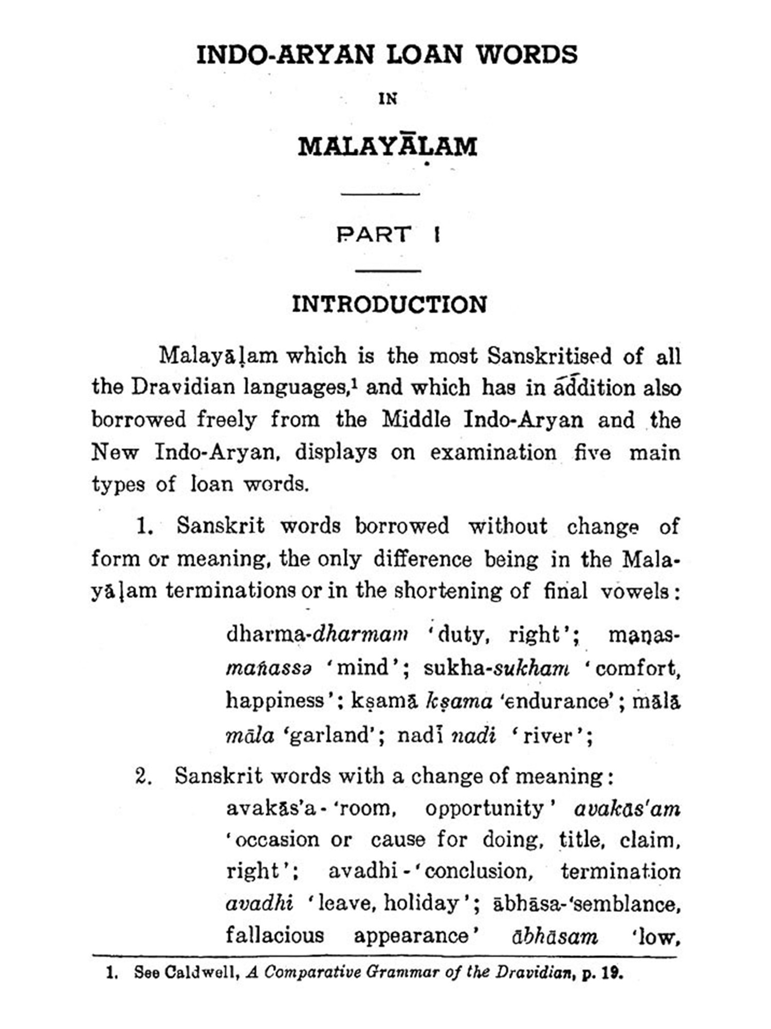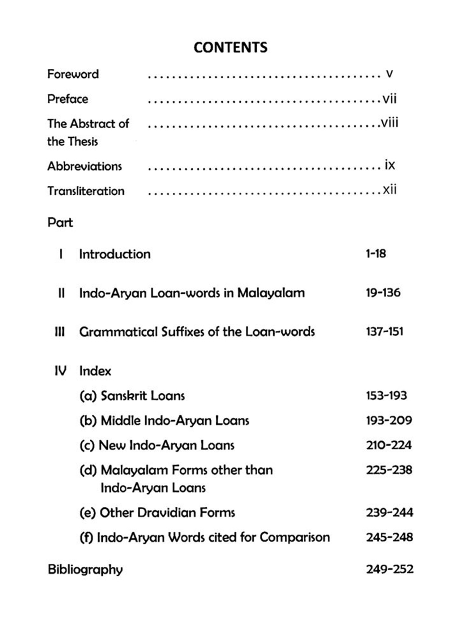 In the present book, the author gives an exhaustive investigation into the Indo-Aryan loan words in Malayalam. It is possible that some of the words labelled as loans from Indo-Aryan will be the loans from Dravidian to Indo-Aryan. This epoch-making work is of immense value to the researchers of Dravidian languages in general and Malayalam in particular. Hence, the International School of Dravidian Linguistics has decided to republish this monumental work.