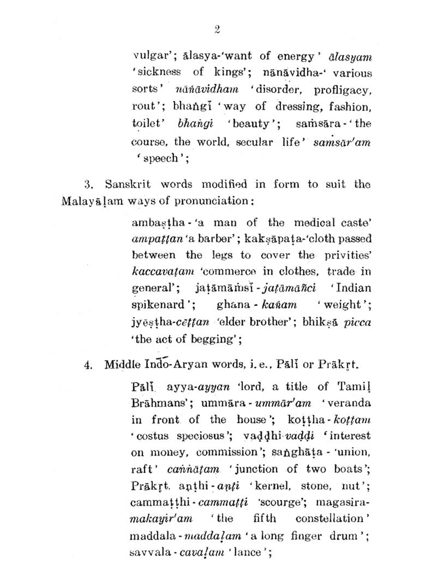 Malayalam language has a good number of borrowed words which come to this language from different sources such as Sanskrit, Pali, Hindi, Marathi, Urdu, Arabic, Portuguese, Syriac, Italian etc. A large chunk of loan words in Malayalam is from Sanskrit. This may be true in other Dravidian languages such as Telugu, Kannada and Tamil also; probably, in Tamil, the Sanskrit loan words may be relatively less when compared to the other three major Dravidian languages.
