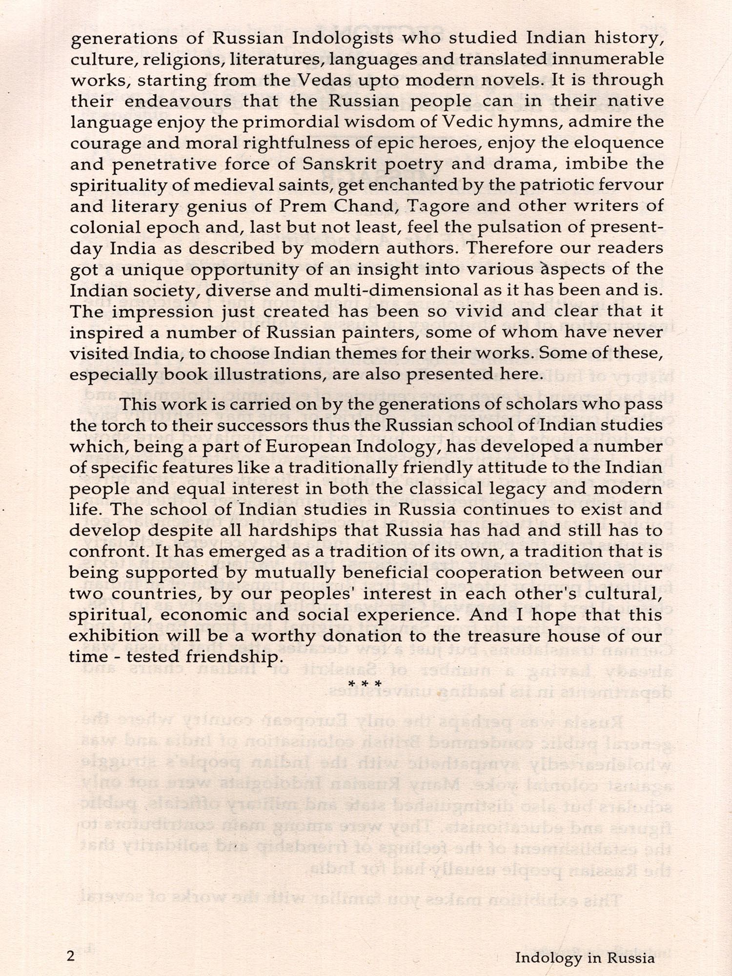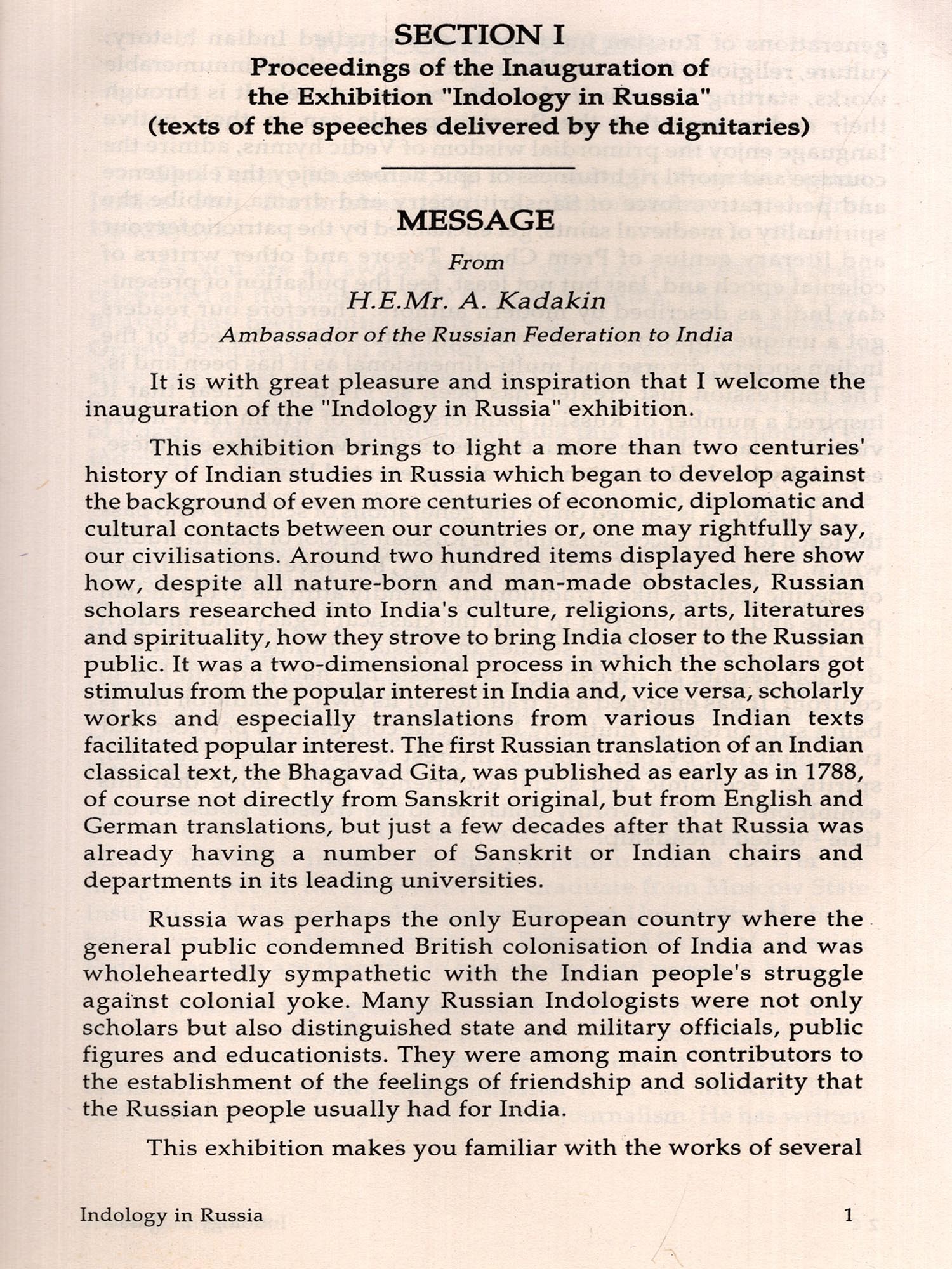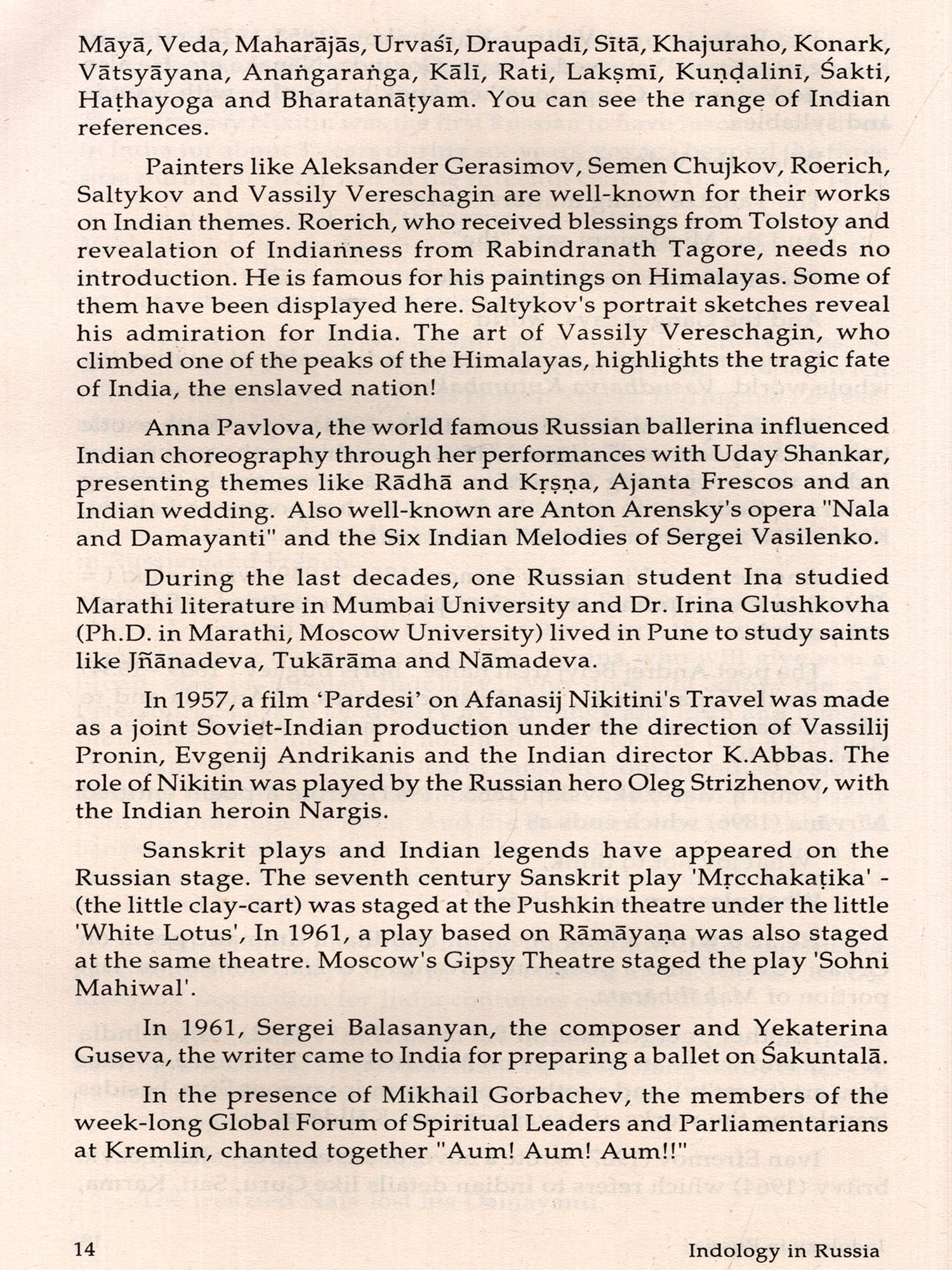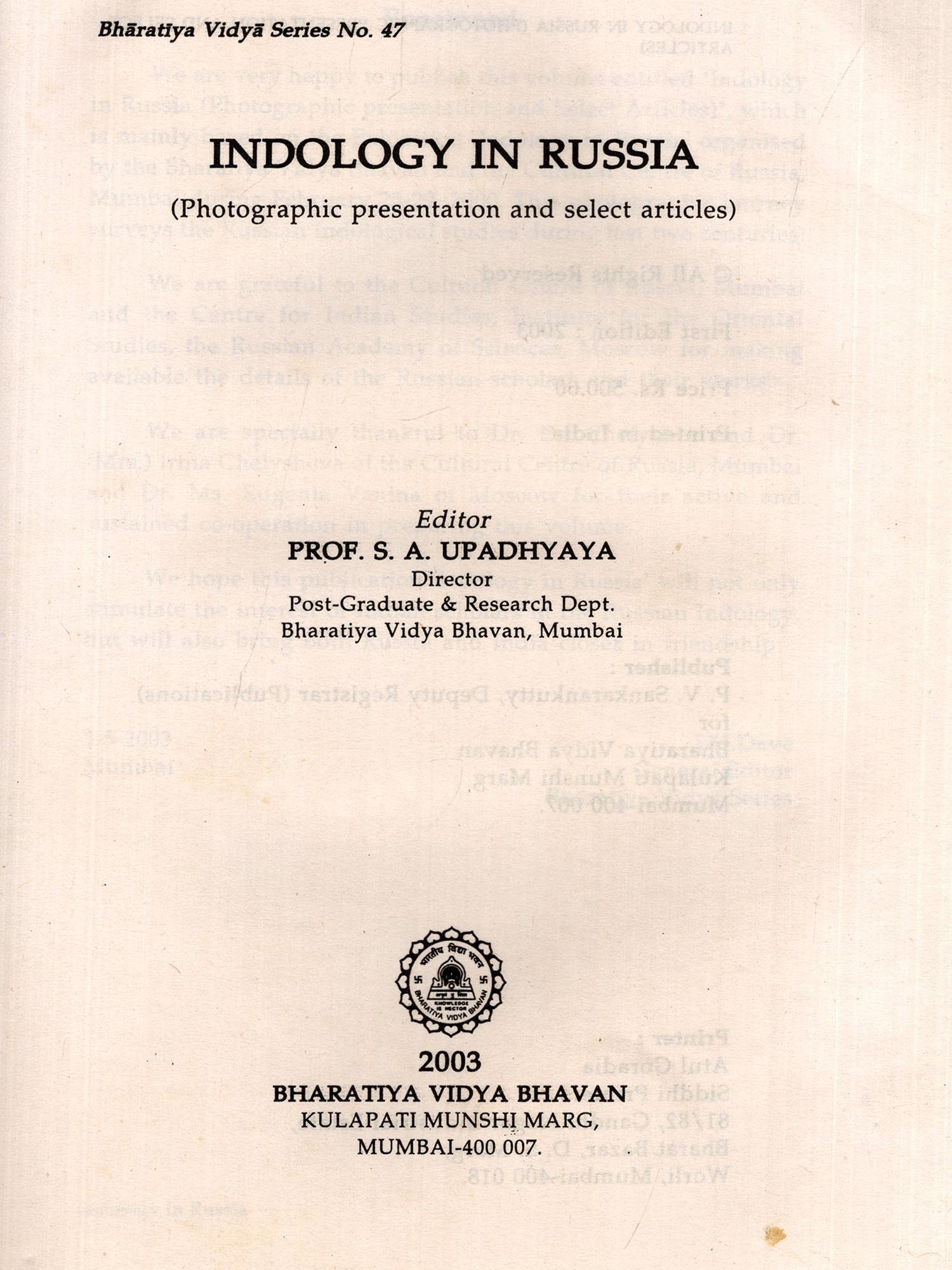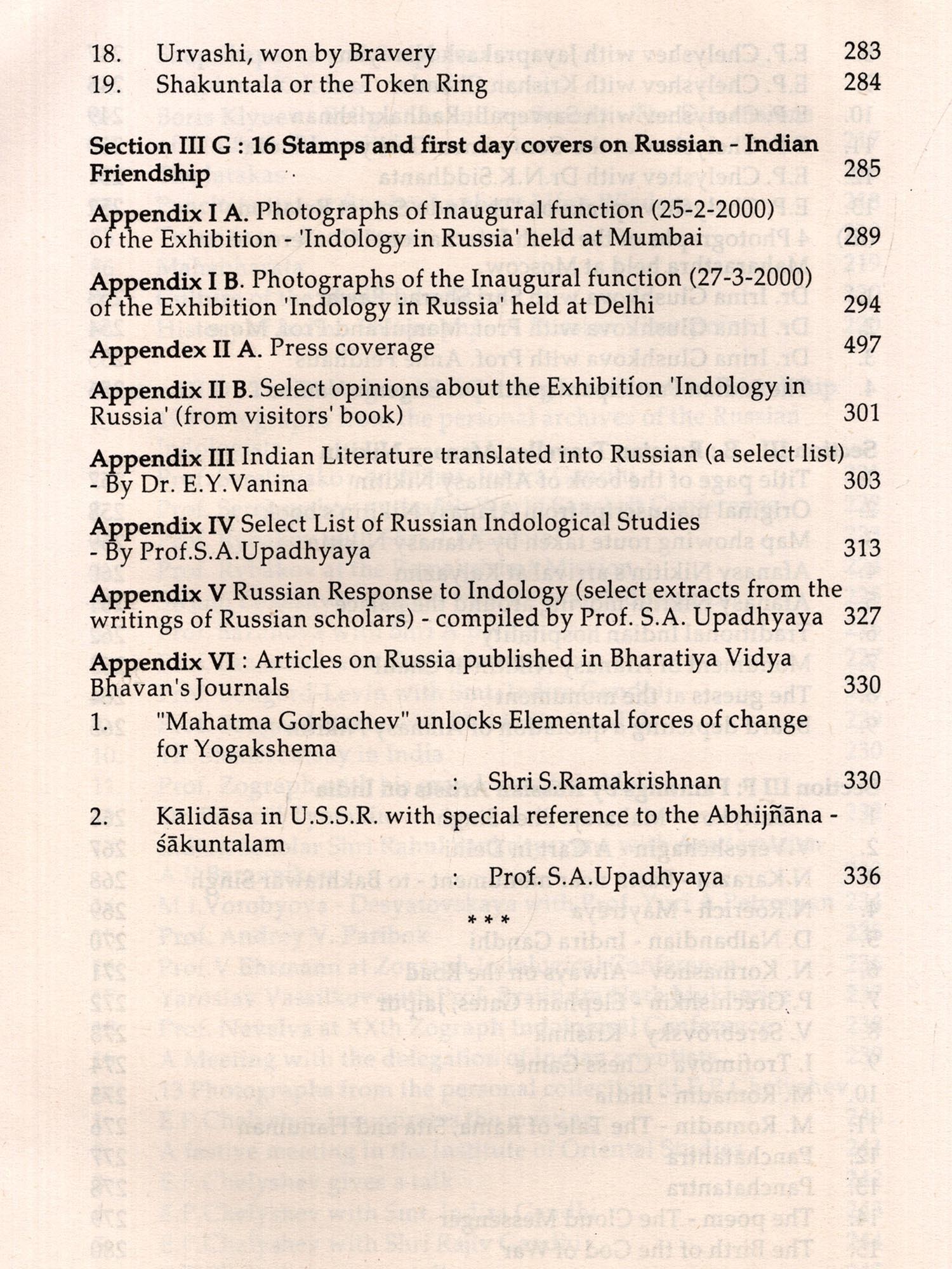 I am grateful to H E Mr A Kadakin, the Ambassador of the Russian Federation to India, for his encouraging message and best wishes, to Mr. Dmitry Kazennov, the Consul General, Consulate General of the Russian Federation in Mumbai for kindly inaugurating this Exhibition and to Justice Shri B N Shrikrishna for presiding over the Inaugural function I am highly indebted to Dr D E Chelyshev, Dr Mrs Irma Chelysheva and their son Mr Andrey for their continuous guidance and help in making this exhibition an unforgettable event I am also deeply thankful to Dr Ms Eugenma Vanma for her untiring co-operation in digging up and dressing the exhibits with dedication My thanks are also due to Shri R M Suvarna, Dr Ms Suniti Deshpande and Shri T V Rajeev of the Cultural Centre of Russia, Mumbai, Dr P L Dash, Head, Centre for Central Eurasian Studies, University of Mumbam and Dr Laxmi S Mikaelyan, Reader, German-Russian Dept, Univei sity of Mumbai for their kind help No words are adequate to express my sincere gratitude to Shri S.Ramakrishnan, Executive Secretary and Director General of Bharatiya Vidya Bhavan, who nurtured the seed of this exhibition from the very beginning to the end with his encouraging guidance and incessant support. It is indeed very unfortunate that he is not alive to-day to see this publication which he had envisaged and eagerly awaited. My sincere thanks are also due to Shri H.N.Dastur, Shri A.N.Chaturvedi and my other colleagues at the Bharatiya Vidya Bhavan for their unfailing co-operation.