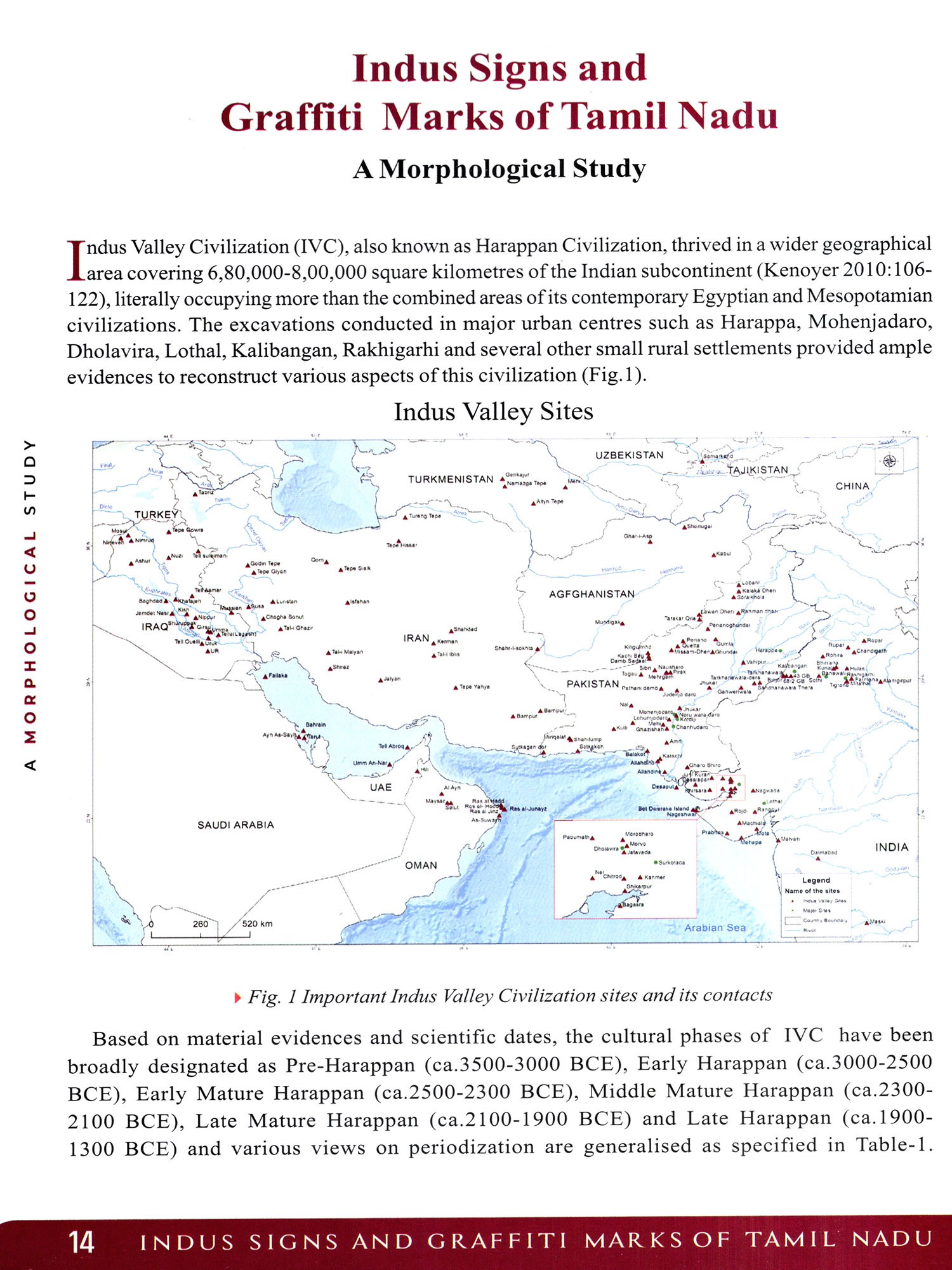 Indus Valley Civilization is one of the greatest civilizations of the bygone age that followed in a wider geographical area when compared with other contemporary civilizations such as Egyptian, Mesopotamian and Chinese civilizations. The seals, advanced metallurgy, ceramic technology, well-planned city, monumental architecture, granaries, dockyard, standardized weights, trans-oceanic international trade, underground drainage system, subterranean canals displaying excellent water harvesting system, diversified agricultural activities, domestication of cattle, usage of script, boat building technology, resource mobilization through well-established trade routes, well-structured administrative system and firm state regulations are some of the hallmarks of Indus Valley Civilization. Irrespective of these achievements reconstructed based on material evidences, the non-decipherment of the Indus script remains an enigma in Indian history that prevents us from understanding their language and script. The decipherment of the Indus script would help to reconstruct the entire social, cultural, political and economic life of the Harappans. To date, the cultural life of the Indus people is being reconstructed exclusively based on material culture unearthed in excavations. Understanding the appearance and disappearance of this well-established writing system still eludes scholars and serious attempts to decipher the script are still going on at various levels. One among them is the comparative study of the Indus script with graffiti marks. The long survival of graffiti marks and their survival as parallel systems started receiving the attention of scholars. Limited evidence, non-availability of archaeological context and improper documentation still elude scholars in understanding the nature of graffiti marks. However, there is visible evidence to show the relationship between the Indus script and Graffiti marks. In the present work, an attempt is made to compare the graffiti marks encountered in archaeological excavations of Tamil Nadu with the Indus script. The findings are placed before the scholars for academic scrutiny. The preliminary morphological analysis of these marks clearly indicates that these are not merely unintentional marks rather there must be a specific meaning to it. The comparative study made with the Indus script indicates a close resemblance. We firmly believe that faithful documentation and interpretation are the only answers to decipher the Indus script. In that way, the present monograph is one of the finest efforts in that direction. I congratulate all the scholars and researchers involved in compiling the work particularly the authors of the monograph.