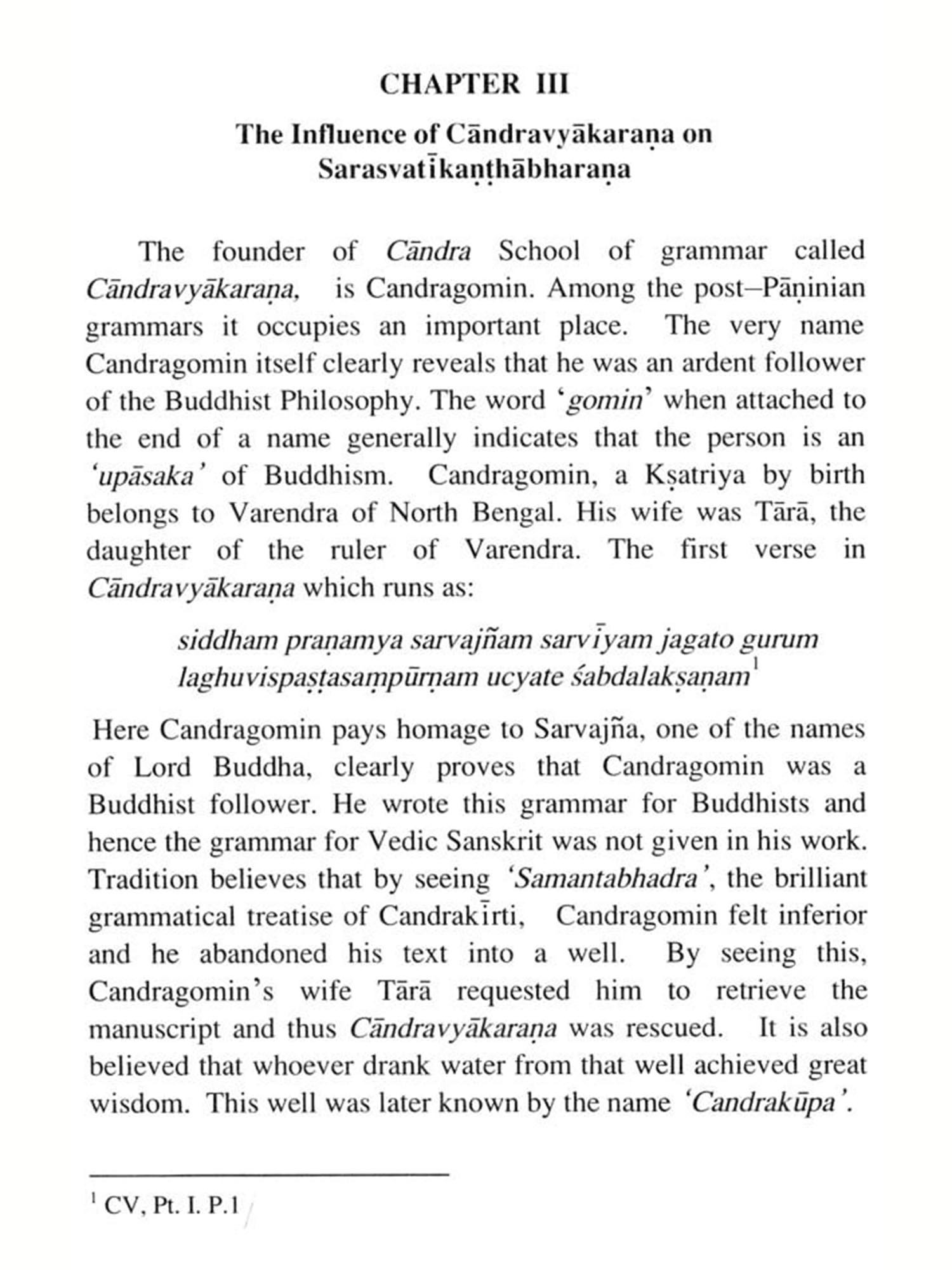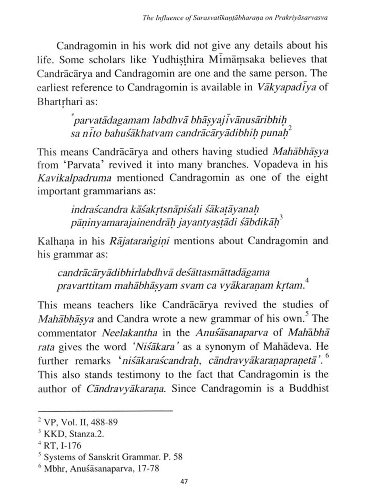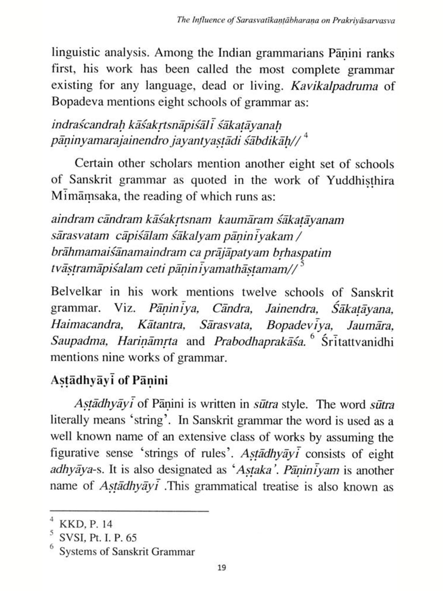 The work consists of six chapters. Chapter I deals with the Paninian system of Sanskrit grammar. Chapter II deals with the post- Paninian systems of Sanskrit grammar. Third Chapter is the Influence of Candravyakarana on Sarasvatikanthabharana. Chapter IV is a discussion on the Salient features of Sarasvatikanthabharana of Bhoja and Prakriyasarvasva of Melputtur Narayana Bhattatiri. Chapter V deals with the works of Bhoja. The next chapter is Prakriyasarvasva and Sarasvatikanthabharana. Some Textual Observations. Last portion is the Conclusion.