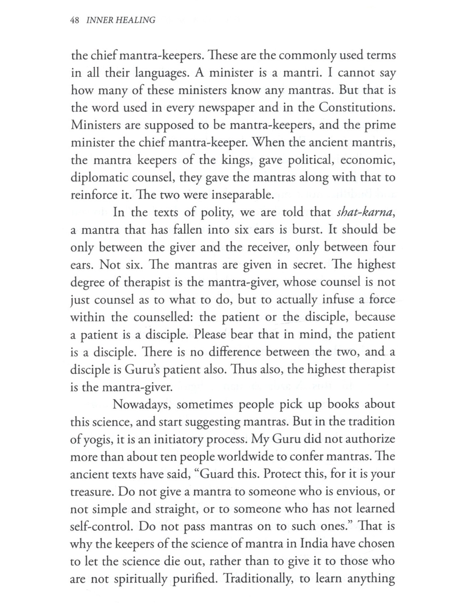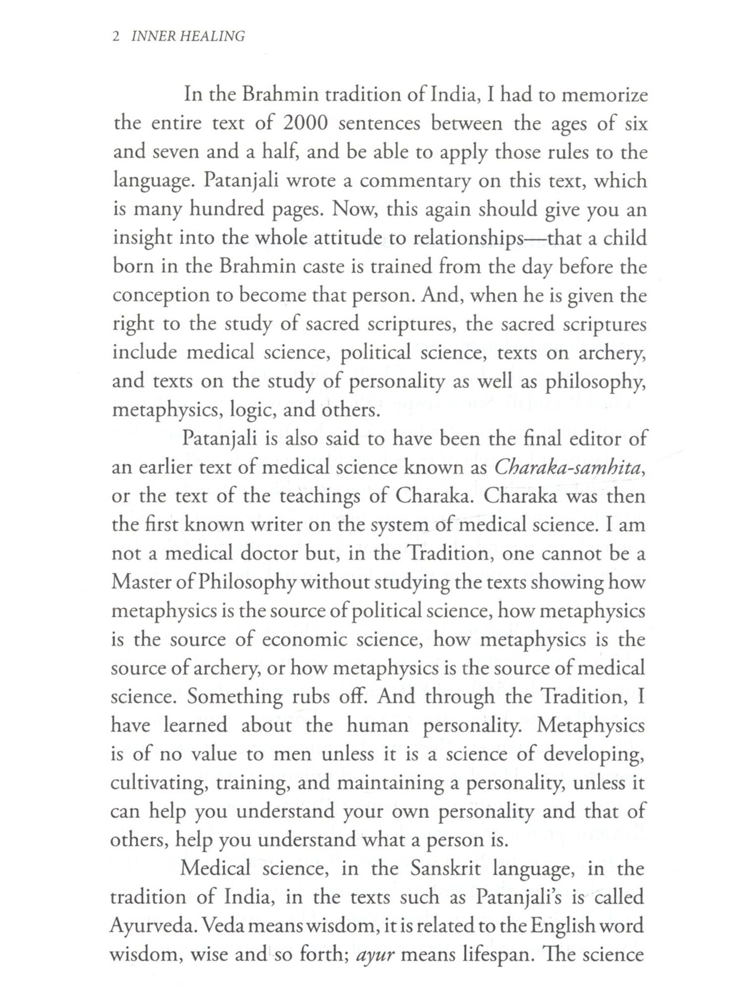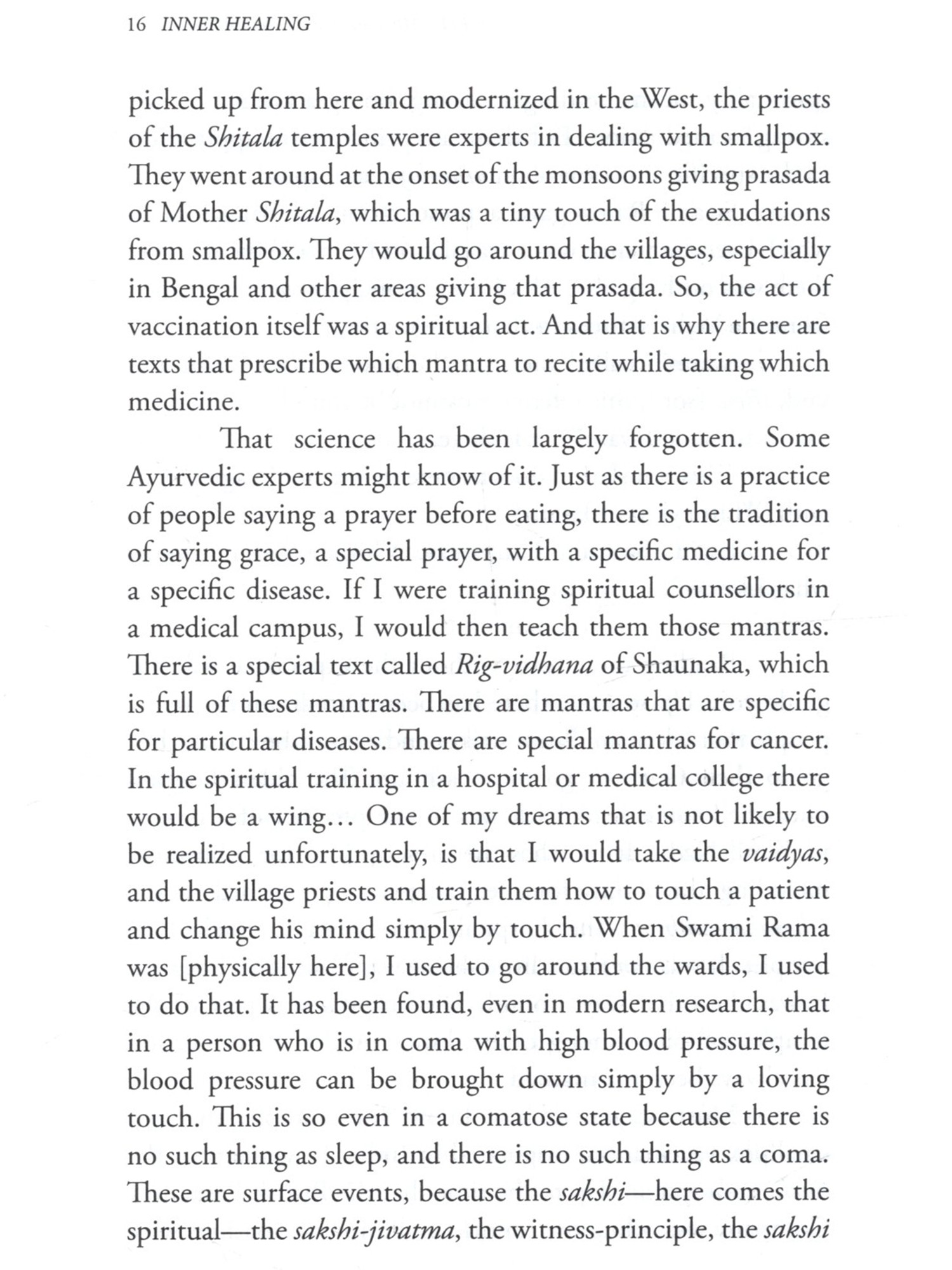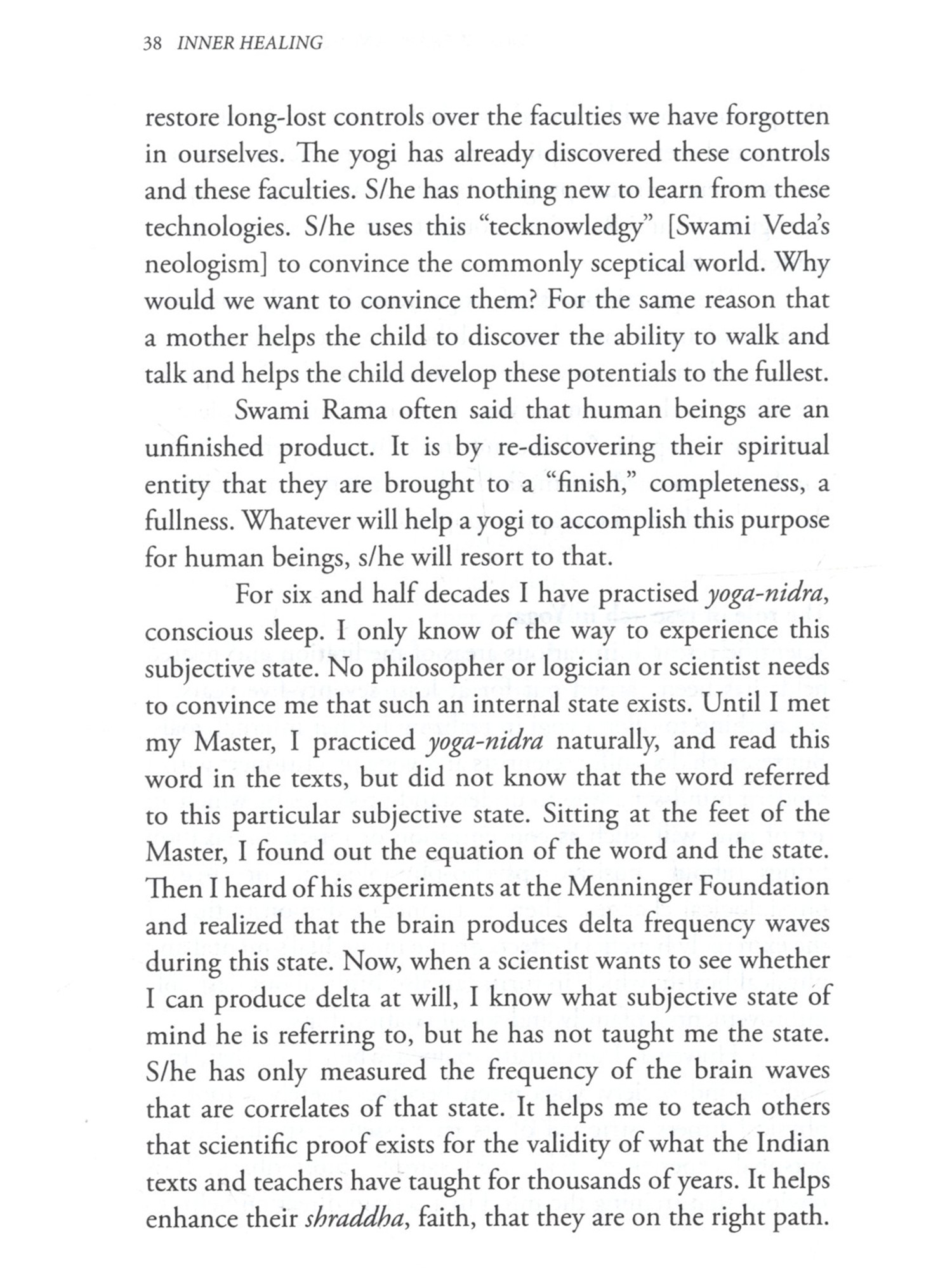 Swami Veda Bharati was an exemplar of yoga as therapy. By this I do not mean that he taught yoga therapy as though he were training clinicians. It is what he lived and showed us every day. It is one area where one could gradually come to see the degree of siddhi which he so carefully hid. He often explained that he knew that he was dealing with a great deal of karmic baggage in this body. He had severe type 1 diabetes, serious cardiovascular disease, a disintegrating spine in his elder years and he details other difficulties throughout the book. He welcomed these challenges as the means to burn the karmic impressions (samskaras) that kept him body-bound. As one who knew him close-up, I saw how he would come to the edge of a cardiac arrest at least once daily for many years. Ar that moment he would just say, "Give me a minute." And he would withdraw into his yoga-nidra for a few minutes and then carry on cheerfully as though it had just been a minor disturbance. He had pain, but I never saw him suffer. We learned through his experiments in various laboratory settings that he remained in a delta brain wave state basically all the time, waking or sleeping, perpetually in yoga-nidra. When I assisted him through his night's work (he was definitely a "night owl") he would finish his dinner around 10 p.m. and then begin his work reading emails before we settled down. Then he would lie down in yoga-nidra and the composition of his writings would begin to flow for me to transcribe and then type up the next day. In this state his writing flowed not from him, since in the state of yoga-nidra one's awareness is beyond the personal ego, but from the lineage of Himalayan masters. When he lectured, he would surrender his seat to the lineage in his preliminary meditation and the lineage's great teaching would flow through his voice. Sometimes he would ask to hear the recording because "he," the personality of former Dr Usharbudh Arya, had no idea what he had said. He was a living example of what Swami Rama had been sent to the West to demonstrate: what a human being could accomplish through the science of yoga. "Yoga is not for therapy; it is for liberation and therapy is a side effect." In this collection of transcribed lectures, you will hear about yoga science as "con-science." Not just conscience as one's moral imagination, but as a science that merges all sciences in the pursuit of consciousness. He makes the point at the outset that the traditional Indian notion of science is one that must encompass all knowledge. Western empirical science, on the "Enlightenment" model of Newtonian mechanics, accepts as valid only evidence obtainable through the cognitive and active senses. This limits its field of knowing to objects. And consciousness can never be an object. We learn from some of the proponents of quantum mechanics that consciousness is actually the first principle of even the physical universe'. It is consciousness that collapses the probability waves in which everything exists into manifest energy and matter. The science of yoga takes one beyond the world of objects into the ultimate subject, consciousness, which we call by many names: God, Shiva, YWH, Brahma, Allah, Shunya (voidness), Wakantanka... It is from the perspective of this transcendental science of consciousness that a yoga therapist must see the one whose suffering s/he intends to alleviate. For this reason, it is imperative that "yoga therapy" not simply become an appendage of "objective" Western medical science and praxis. We must see the person we propose to help from the perspective of yoga science and be able to combine that with what empirical medicine can offer in a collaborative, but not a derivative, way. In this way we can gradually learn how to assist people in accessing the quantum level of healing. It is this level of consciousness and spirituality that is responsible for the inexplicable remissions of cancer and other diseases described by Richard Selzer MD in his book Mortal Lessons: Notes on the Art of Surgery, where, as the chief surgical resident at Yale Medical School, he describes episodes of healing that he could not explain medically. One of Swami Veda's greatest accomplishments and contributions to our learning was the skillful way that he used living with his physical illnesses and his relationship to them as a means to enlightenment. He often told us, "Do not allow body conditions to become mind conditions." Yoga is the science of self-transformation. Our health or illness is a result of our integrity in walking that path. And the illness of the body, too, can become a means for Self-realization.