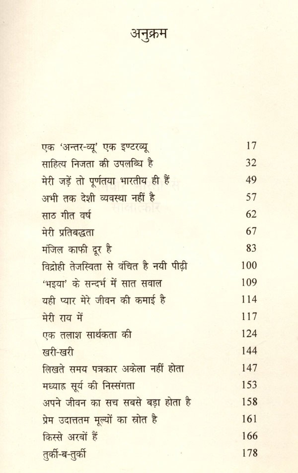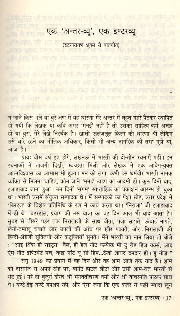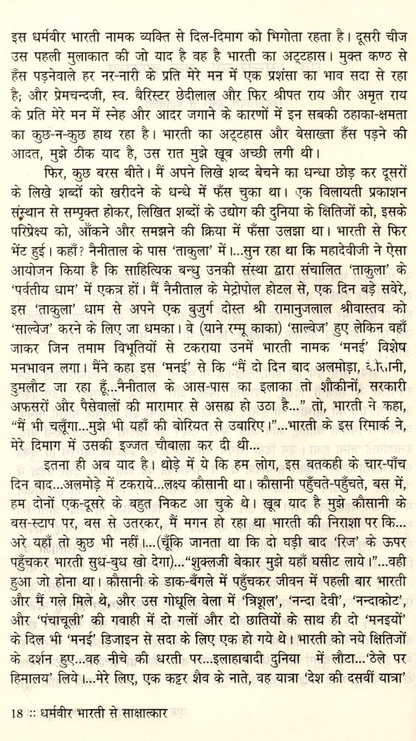 विश्व की सभी भाषाओं में महत्त्वपूर्ण व्यक्तियों के साक्षात्कार लेने की प्रथा खासी पुरानी है। हिन्दी में इधर यह कुछ ज्यादा ही प्रचलित हो गयी है। शायद है कि प्रच्छन्न कारण मीडिया का प्रसार हो। अब लिखित शब्द पढ़ने की फुर्सत लोगों में कम रह गयी है। पर बहुत-कुछ जानने और समझने की तलब भी बढ़ गयी है। उस सिलसिले में साक्षात्कार पढ़कर सम्बन्धित विशिष्ट व्यक्ति के कृतित्व और व्यक्तित्व के बारे में काफी-कुछ जान लेने का सन्तोष मिल जाता है। इसीलिए साक्षात्कारों का रिवाज इतना बढ़ गया है। पर इसमें एक गड़बड़ यह हो जाती है कि साक्षात्कार छोटी-बड़ी विभिन्न पत्र-पत्रिकाओं में छपकर गुम हो जाते हैं, उनका केवल तात्कालिक उपयोग मात्र हो पाता है। भारतीजी की एक विशेष आदत थी कि वह जो कुछ भी करते थे पूरे मनोयोग से करते थे। पूरी ईमानदारी से करने की गुंजाइश जिस काम में नहीं होती थी उस काम को वह करते ही नहीं थे। साक्षात्कार उन्होंने अधिक नहीं दिये, पर जो दिये पूरे मन से और गम्भीरता से दिये-साक्षात्कारकर्ता को यों ही टरका देने का काम उन्होंने कभी नहीं किया। मैं जितने भी आलेख उपलब्ध कर सकी उन्हें संकलित करके भारतीजी को प्रेम करनेवाले असंख्य पाठकों को सौंप रही हूँ-इन्हें पढ़कर आप उन्हें और करीब से तथा पारदर्शी ढंग से जान सकेंगे। साथ ही एक बहुत महत्त्वपूर्ण दस्तावेज भी आपको भेंट करती हूँ जो भारतीजी ने स्वयं अपने हाथों लिखा है। मुझे पता नहीं यह पत्र किस शोध-छात्र के लिए कब लिखा गया था। उनके यत्र-तत्र बिखरे कागजों को सँभालते-सहेजते समय यह कागज मिले- मैं खुद चमत्कृत रह गयी कि उन्होंने अपना आत्म-परिचय स्वयं लिखा !