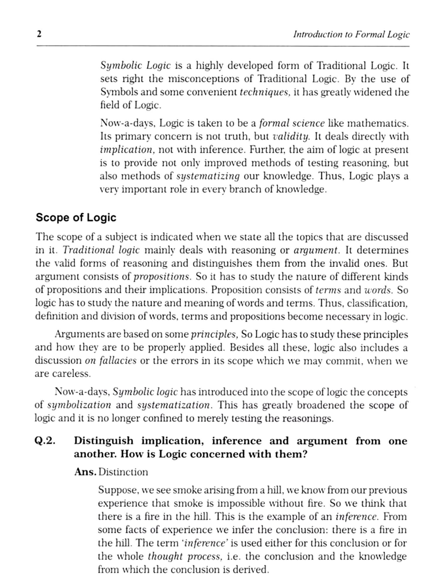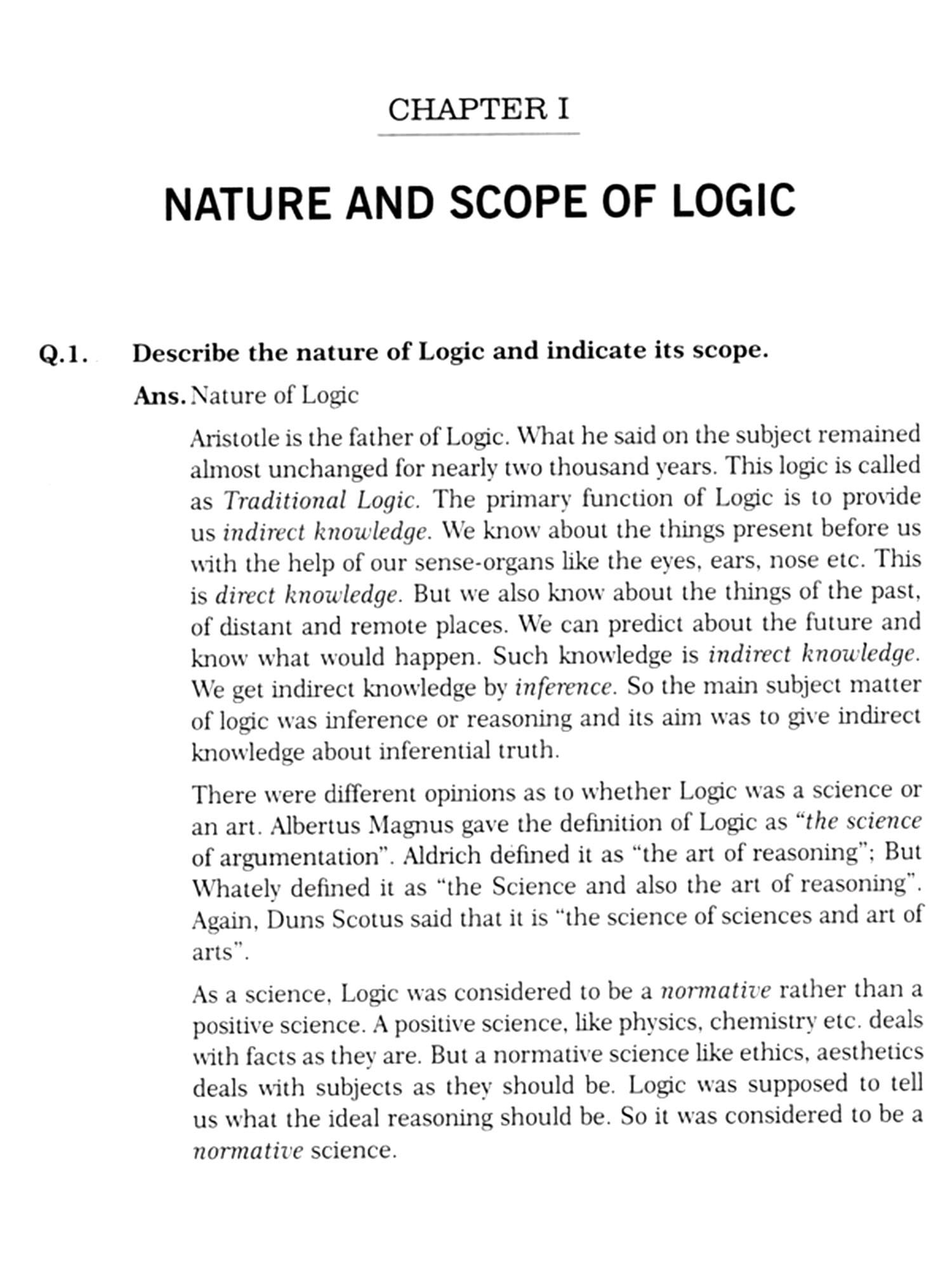 Chapter-1 entitled, "Nature and scope of logic deals with definitions and nature of logic since its inception level along with the theories of Aristotle. Arguments are based on some principles, So Logic has to study these principles and how they are to be properly applied. Besides all these, logic also includes a discussion on fallacies or the errors in its scope which we may commit, when we are careless. Most of the major concepts are introduced through discussion of existing examples from the history of philosophy and science.