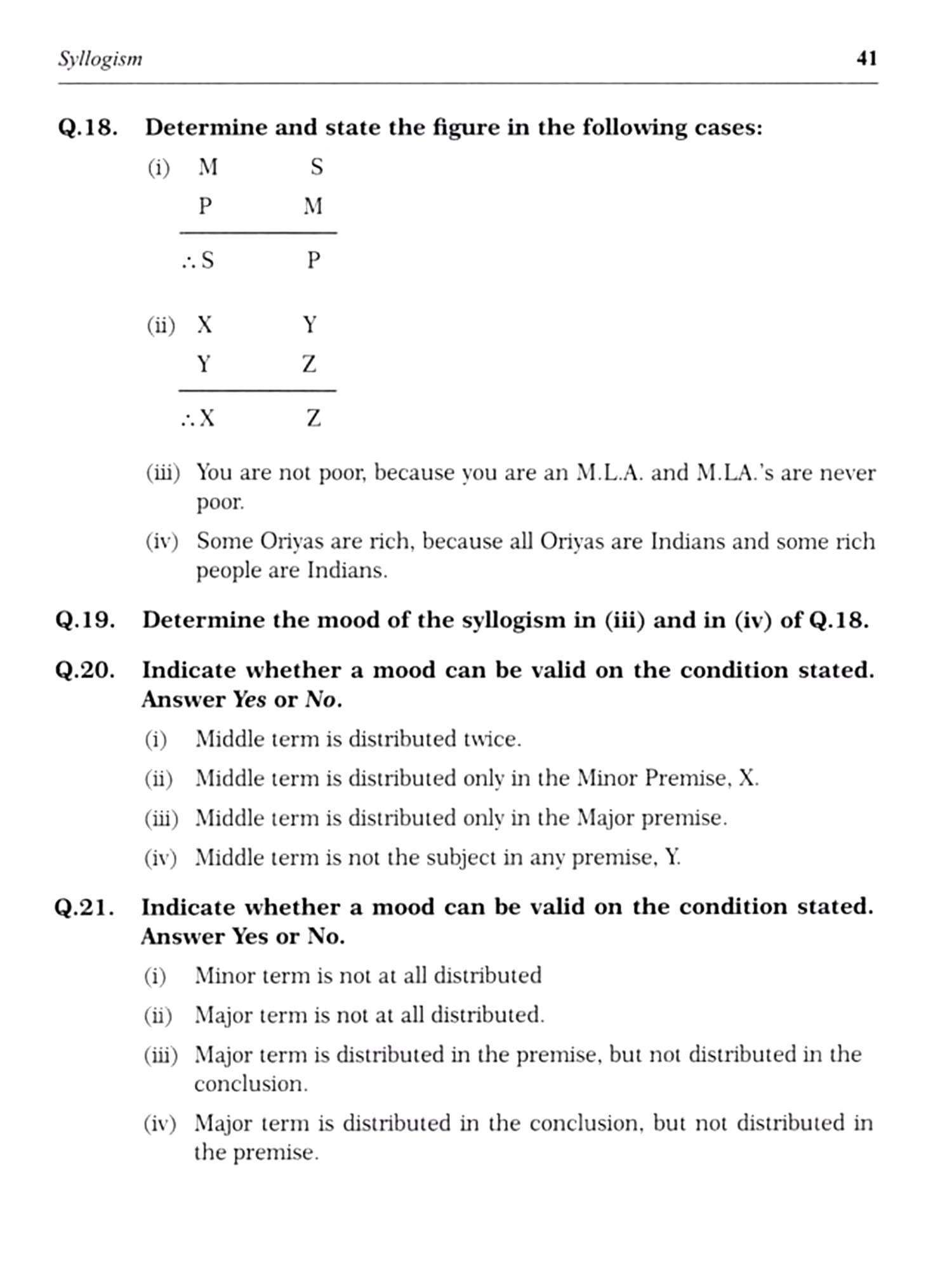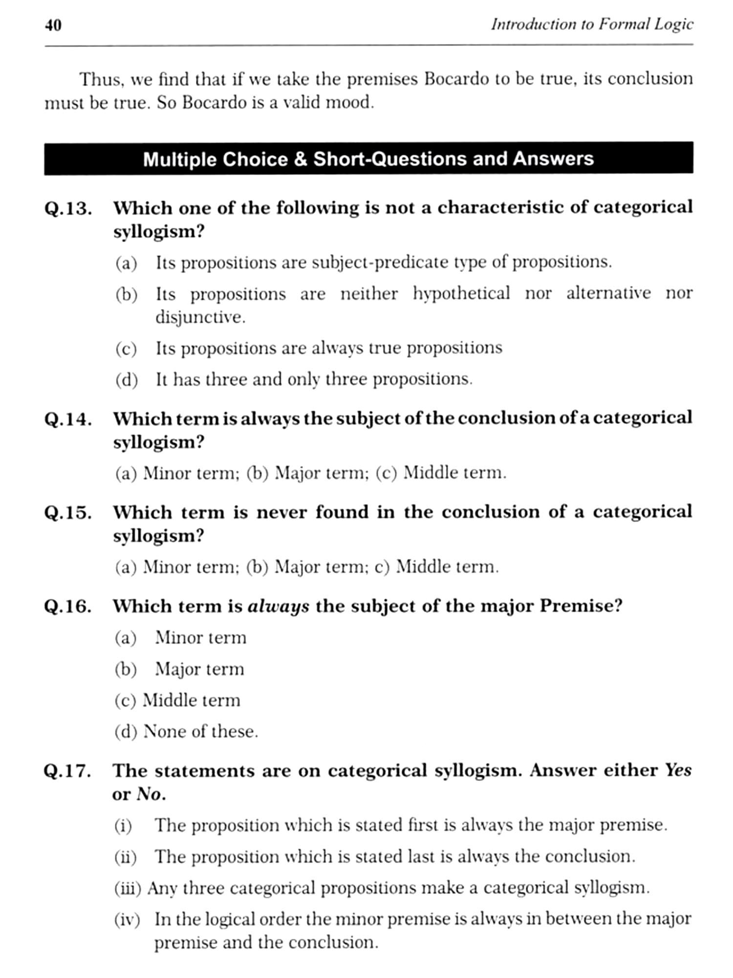 Chapter-II entitled, "Syllogism" discusses the different forms of syllogism with symbolical and concrete examples. The categorical syllogism has been very well explained with definitions and examples. The general syllogistic rules are also illustrated eloquently with the valid moods of the figures. Aristotle's dictum is also very well explained in this chapter. The sub section on 'Aristotle's Dictum and Reduction' ends with this observation: "Aristotle's Dictum and Reduction was the only method of testing the validity of syllogisms in the days of Aristotle, But now-a-days, there are other methods of testing the validity of syllogisms."